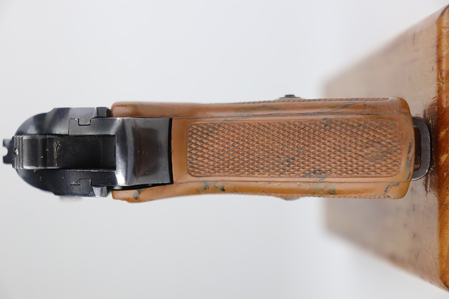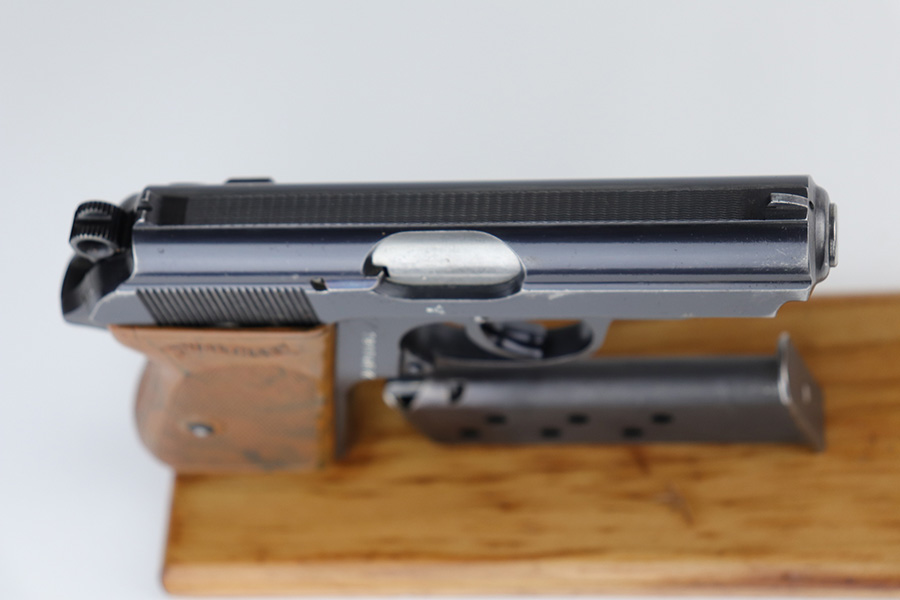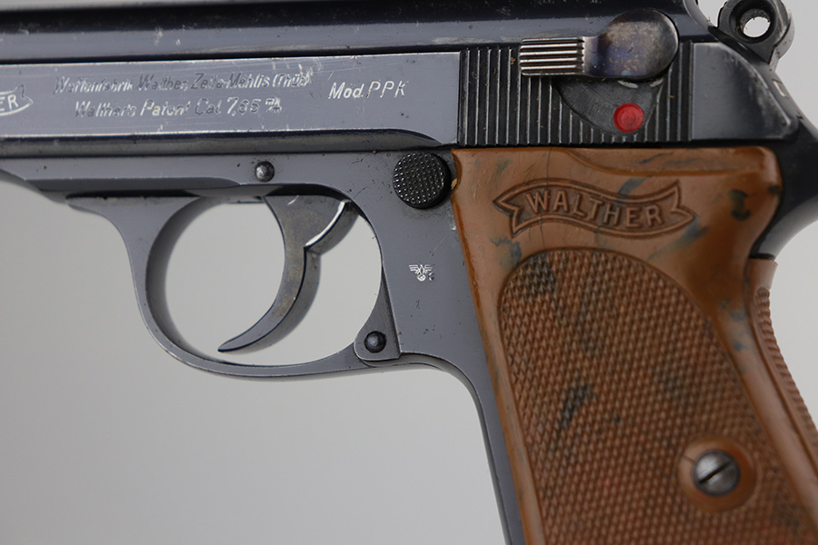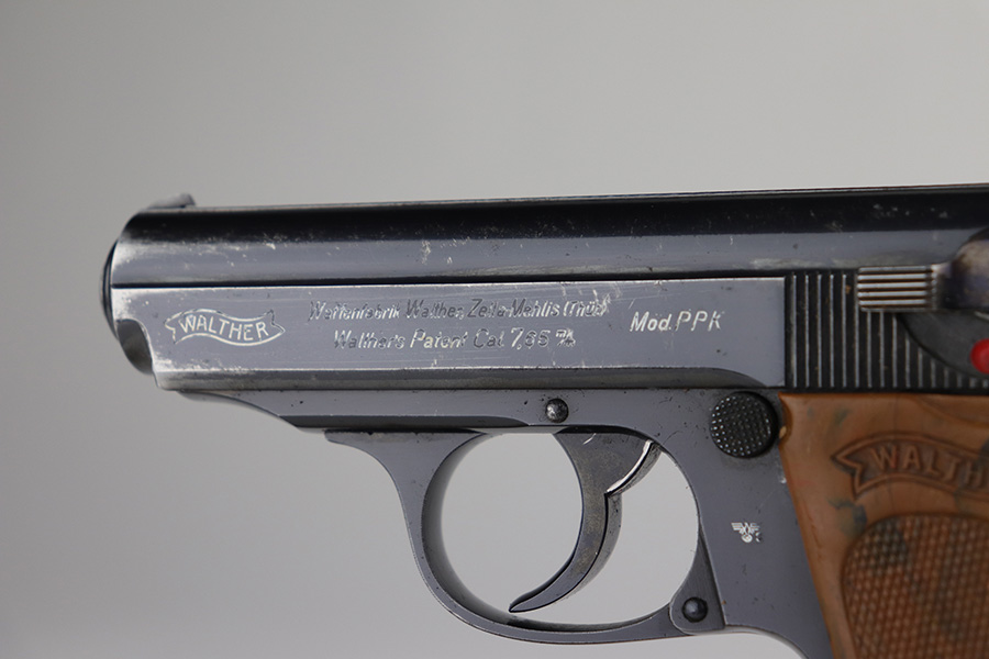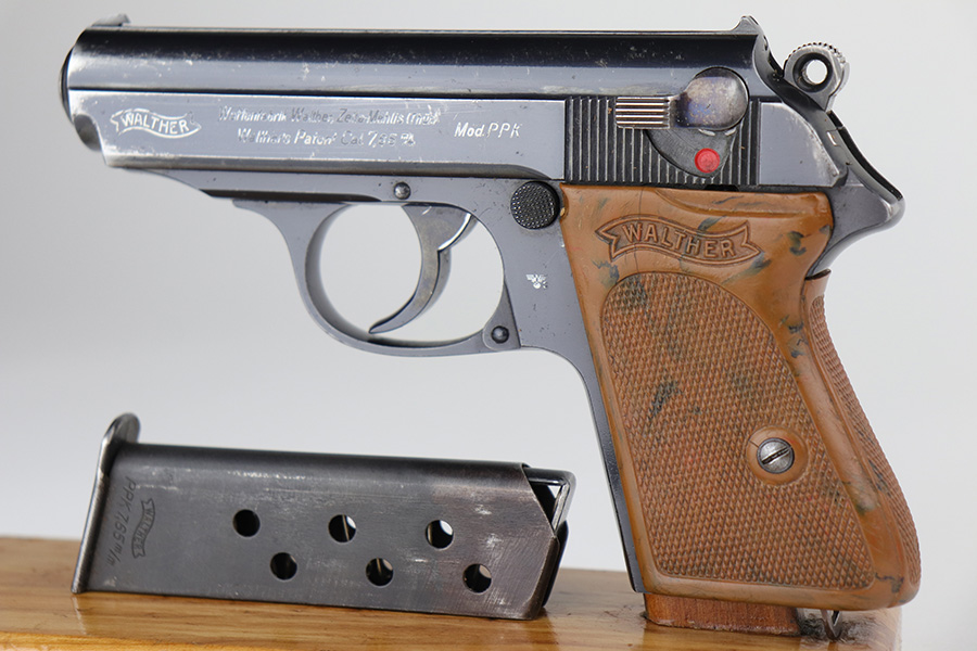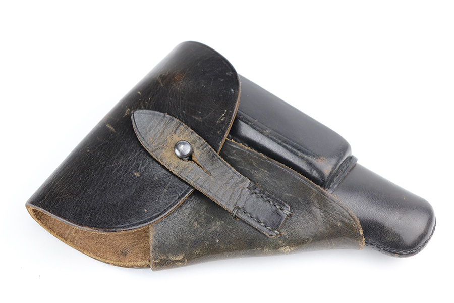 8/20/21 – This is a complete police-issued Walther PPK rig from 1940. The pistol is all original with maybe 90% of the original, high-polish blue remaining. Visible holster wear on both sides of the slide, most pronounced on rear left side of slide, left side muzzle and near the ejection port. Minty bore. Original grip has a small crack on each side. Rig includes two original magazines. Completed by a black PPK holster with fairly crisp internal Walther PPK insktamp.