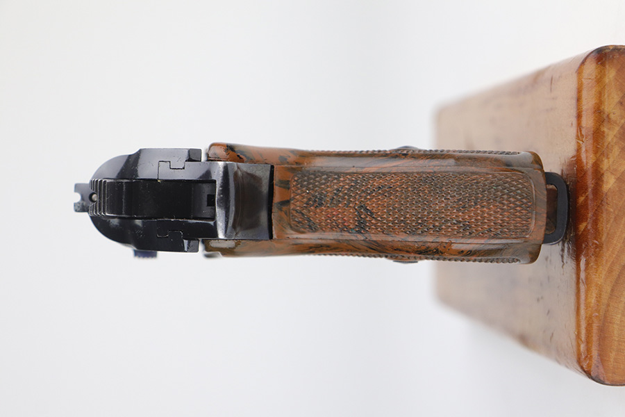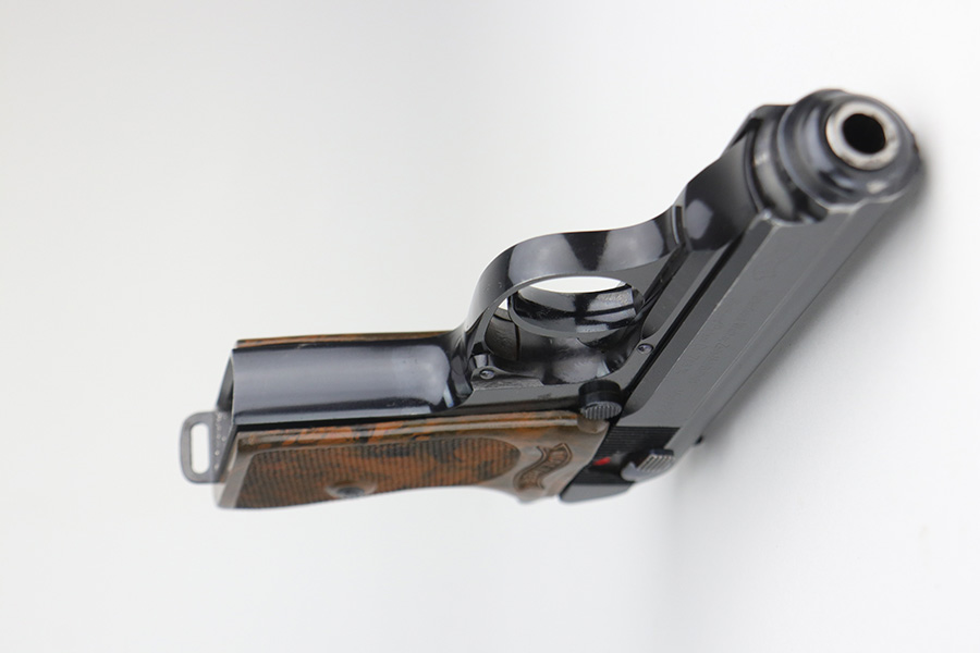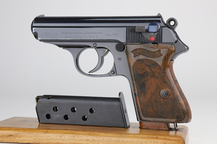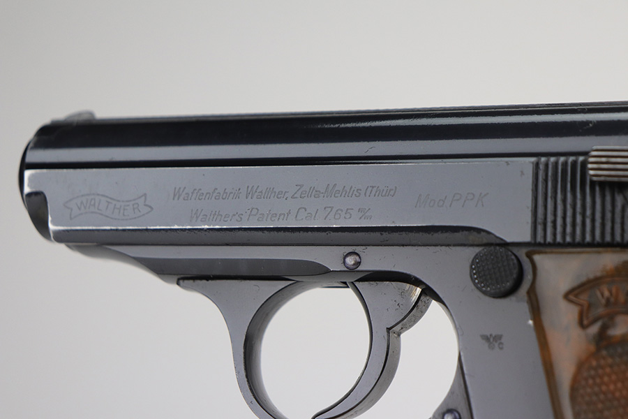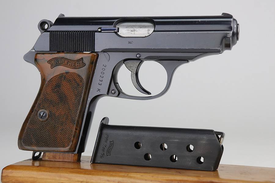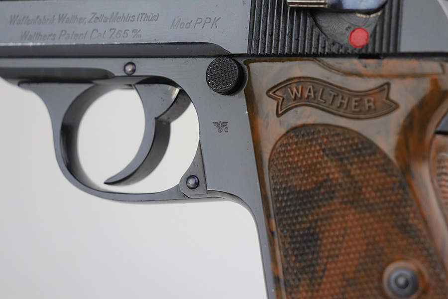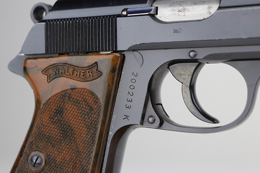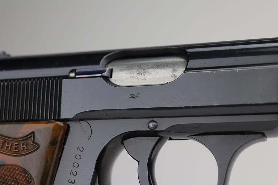 11/15/21 – This is an early Crown/N proofed gun from 1938.  Of the Police PPK guns, fewer than 10% were crown/N proofed. It’s a first variation police example, one of only 5,500 produced.  The original high-polish finish is about 97-98% with a correct brown bakelite grip, also in excellent condition.  The bore is minty.  The magazine is a correct wartime mag and has a police style serial number on the spine.  While the magazine is police issued, it is numbered to a different gun.