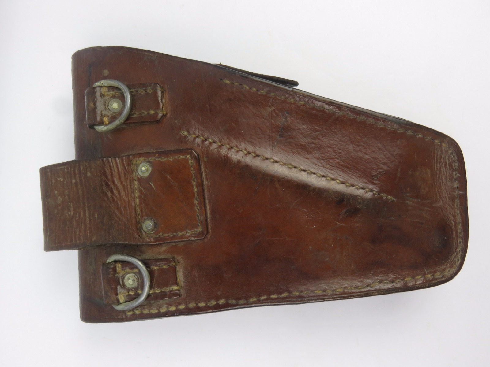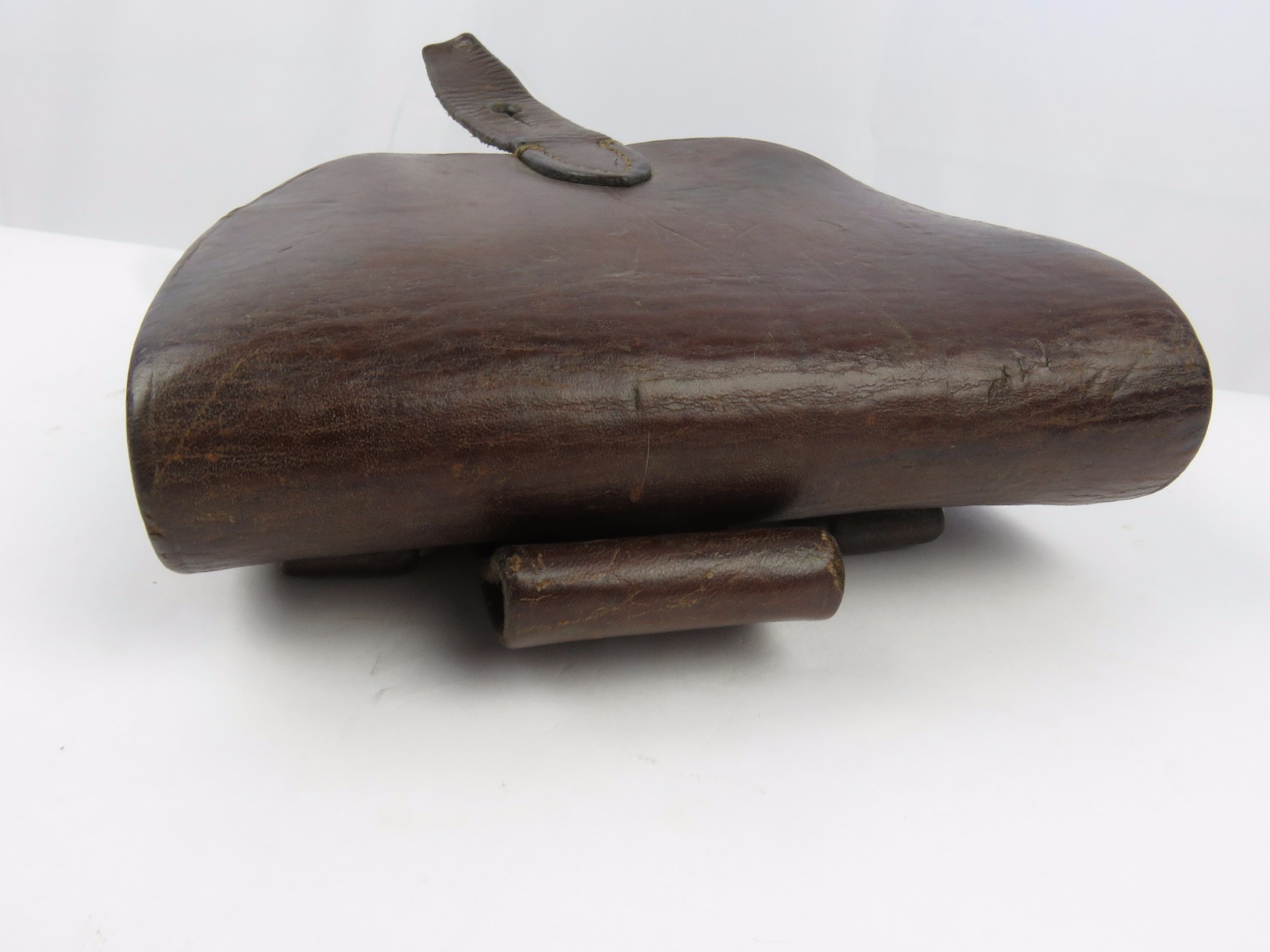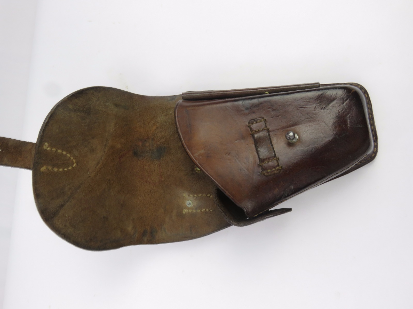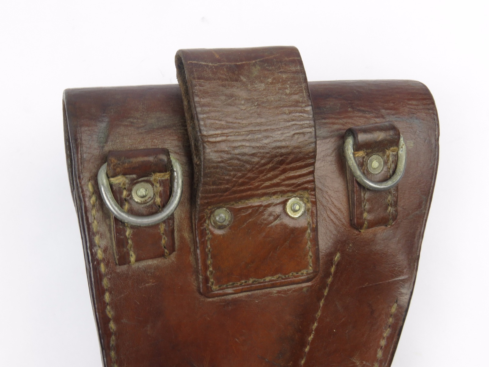 10/24/17 – This is an original Polish (pre-nazi occupation) Radom holster. These are very scarce holsters made in the 1930s for the model P.35 pistol. The holster has excellent shape and is firm leather overall. There are no significant cracks or issues on the leather, only normal aging wear. The interior leather has a faint triangular ink stamp remnant, which is a known Polish manufacturer stamp. The stitching is excellent and all original.