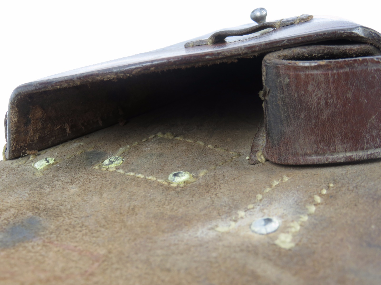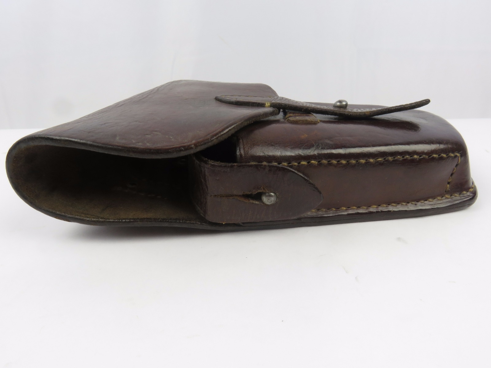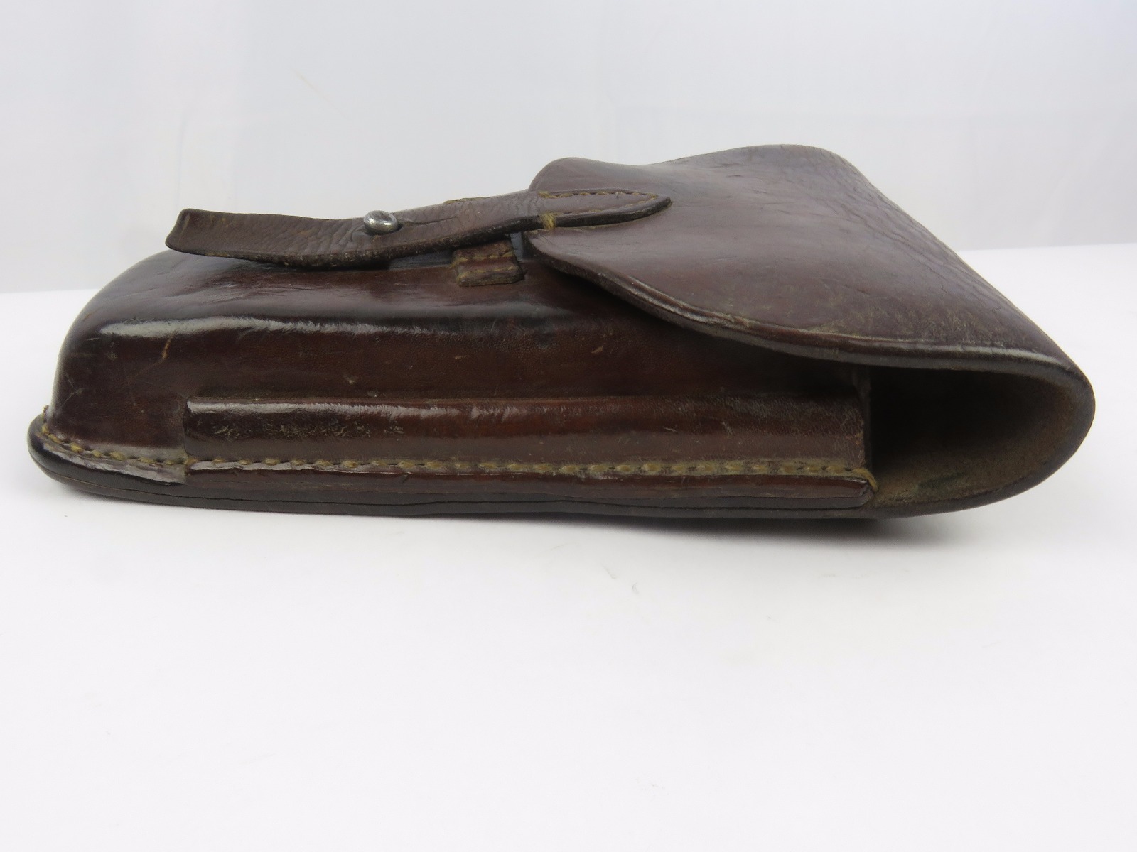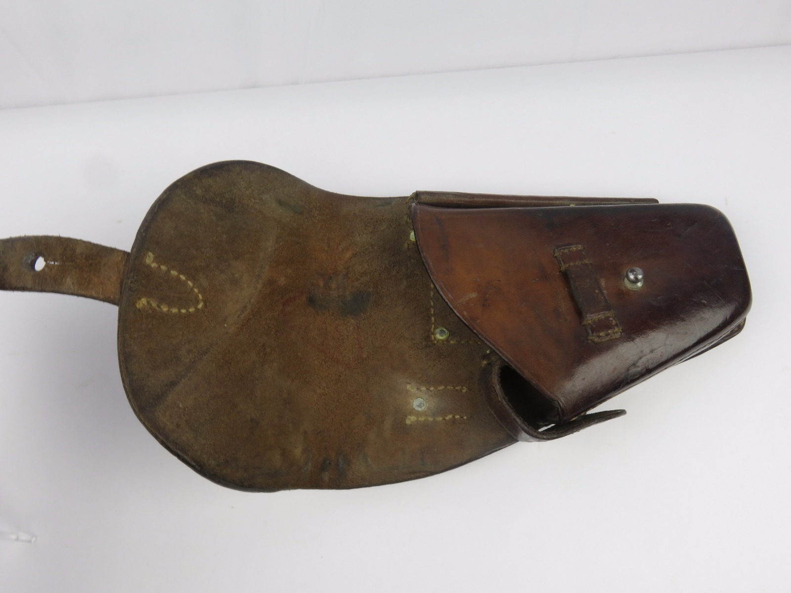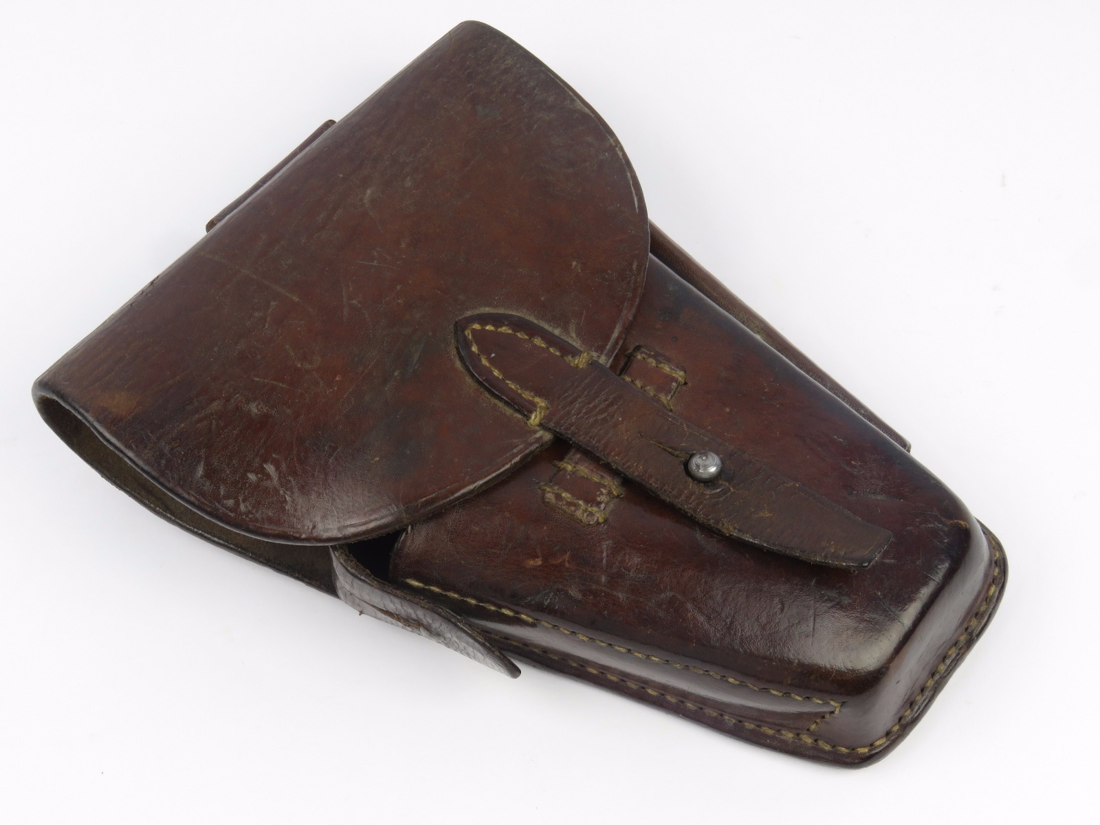 10/24/17 – This is an original Polish (pre-nazi occupation) Radom holster. These are very scarce holsters made in the 1930s for the model P.35 pistol. The holster has excellent shape and is firm leather overall. There are no significant cracks or issues on the leather, only normal aging wear. The interior leather has a faint triangular ink stamp remnant, which is a known Polish manufacturer stamp. The stitching is excellent and all original.