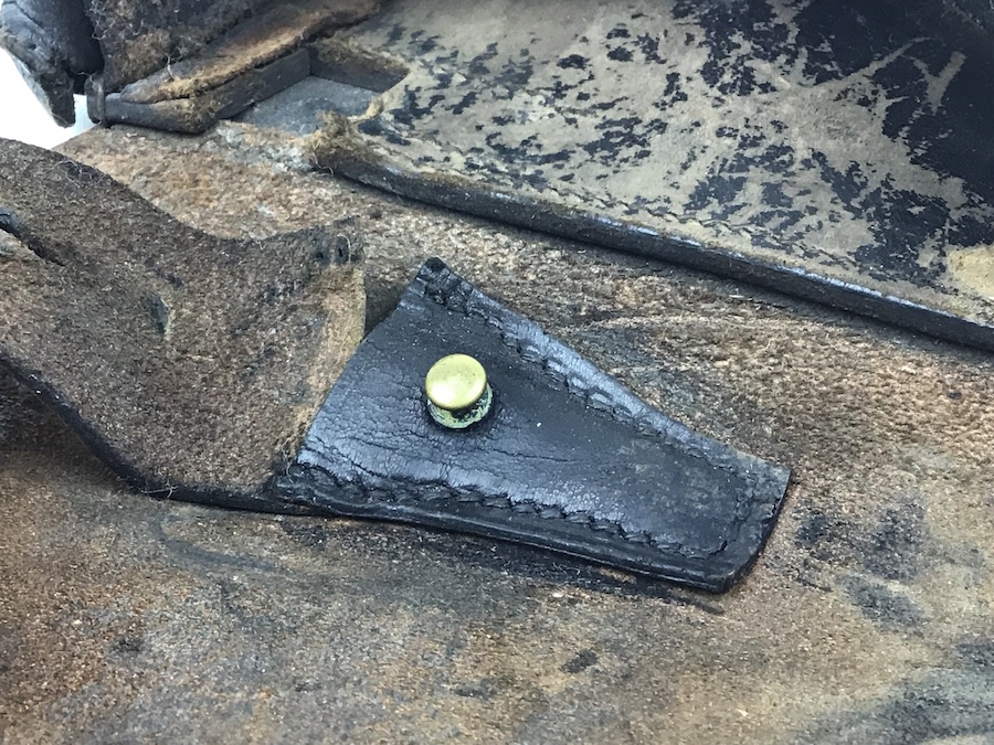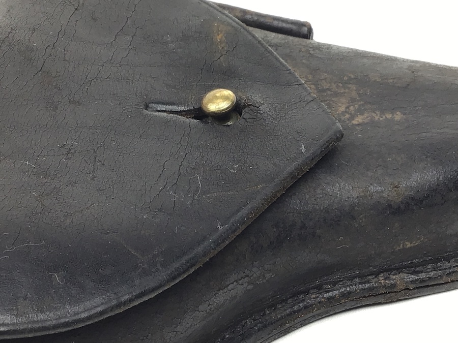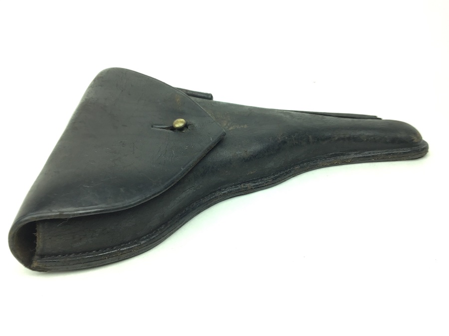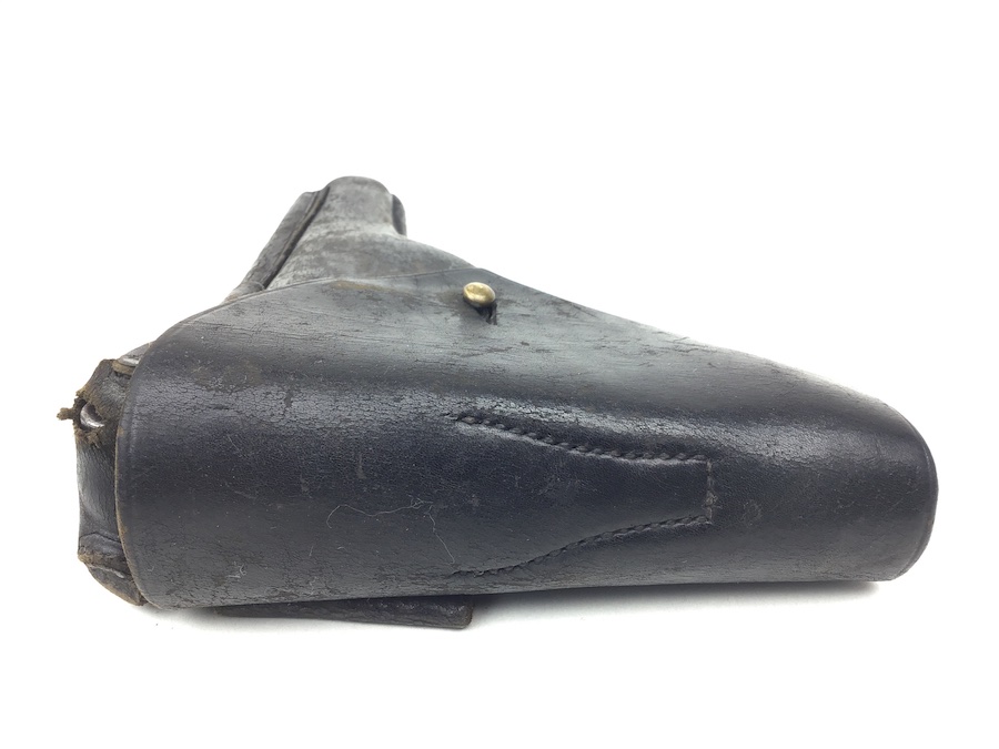 4/29/20 – Original and good+ condition, Portuguese army holster. Model M-2, issued 1908-1910. Includes original cleaning rod and spare firing pin. The leather is holding it’s shape nicely and has age wrinkling and use wear. Stamped on the rear with “AE” next to the belt loop. Cleaning rod flap has a small hole. Small hole in the toe on the back side. Interior is clean but half of the lift strap is worn off and un-attached. Stitching is intact and secure, except the tool pouch flap. Otherwise a very nice piece.