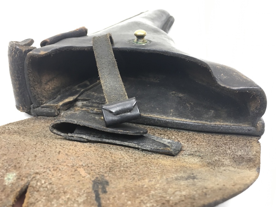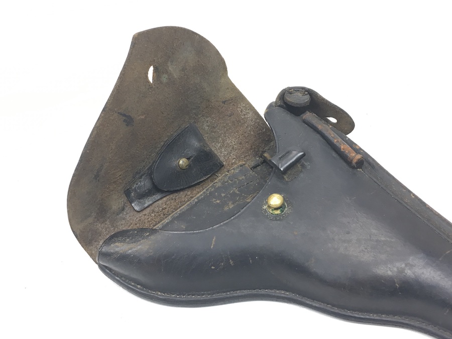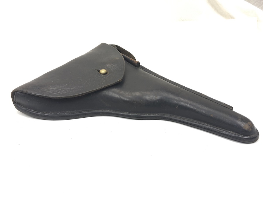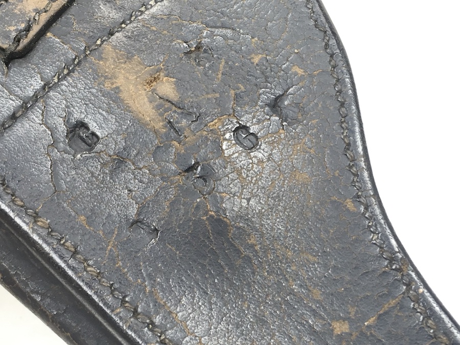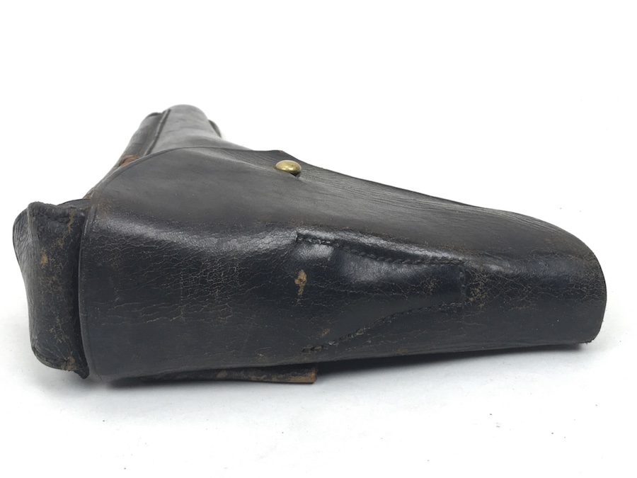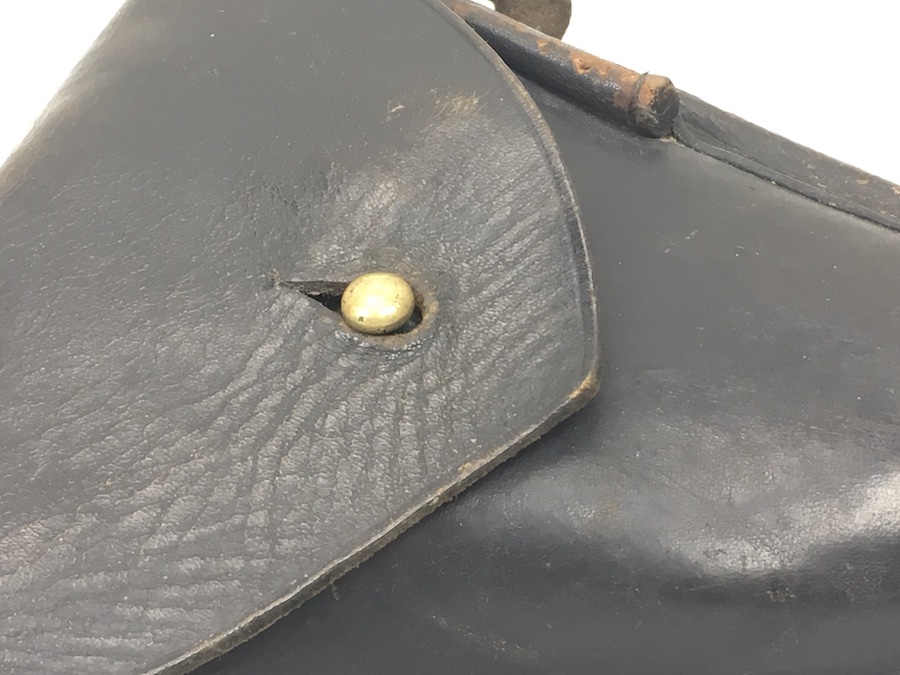 6/5/19 – Original and very good condition Portuguese army holster. Model M-2, issued 1908-1910. The leather is holding it’s shape nicely and has age wrinkling and use wear. The closure stud is missing from the cleaning rod closure flap. Stamped on the rear with “1565” and “AE” next to the belt loop. Interior is clean and lift strap is secure. Stitching is intact and secure.