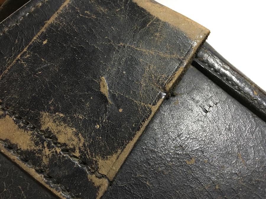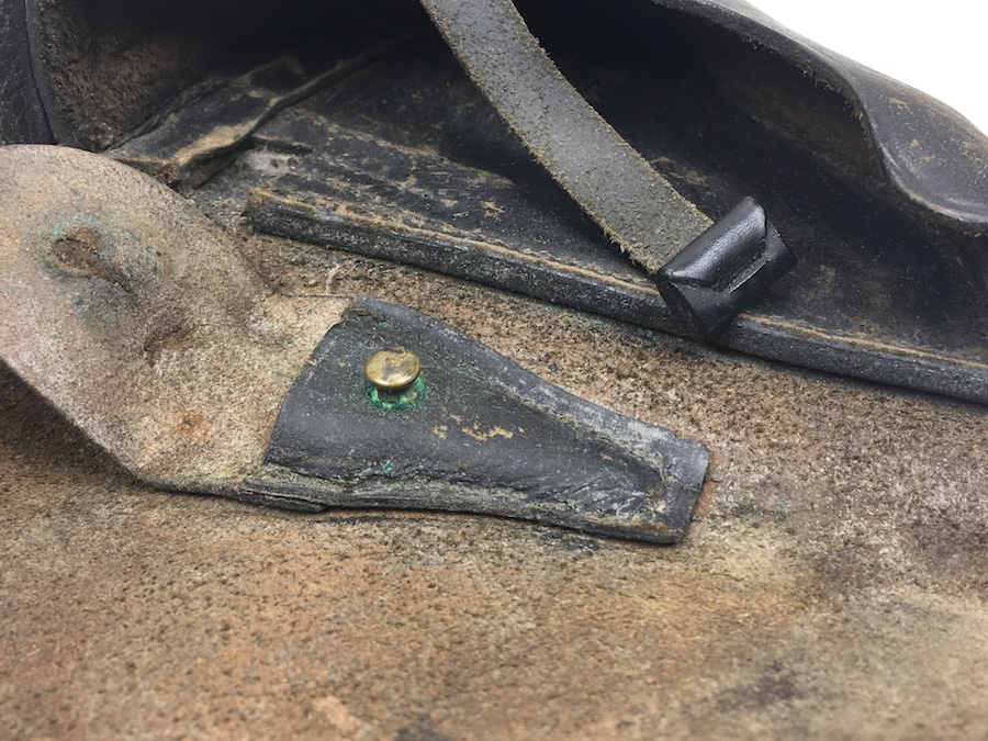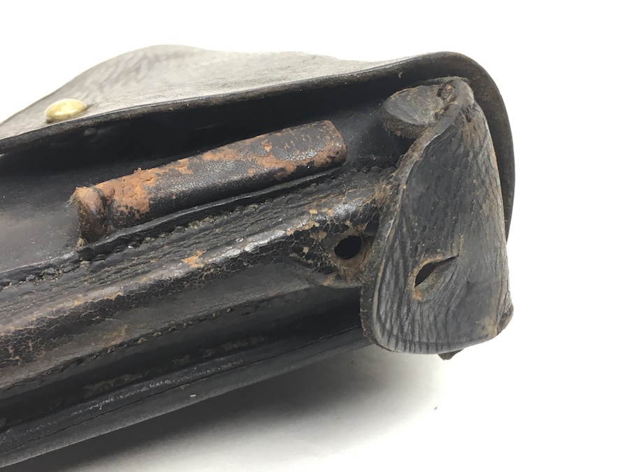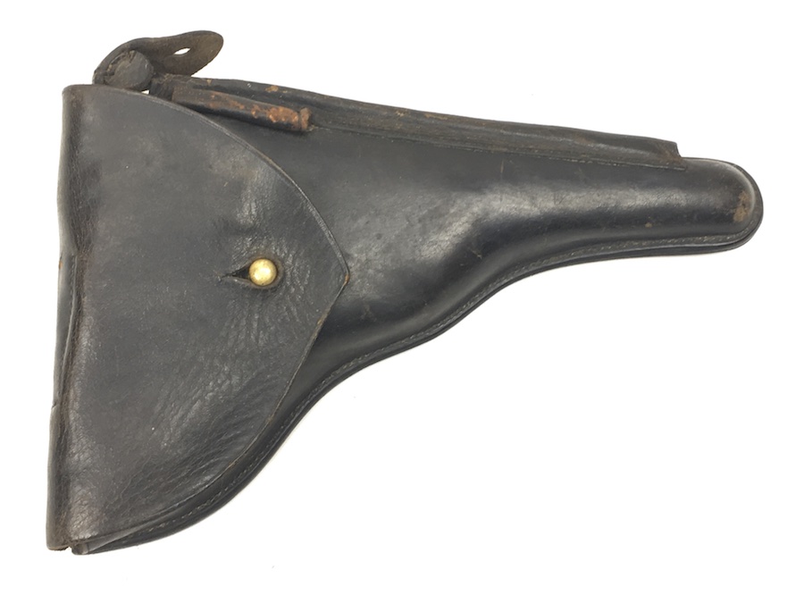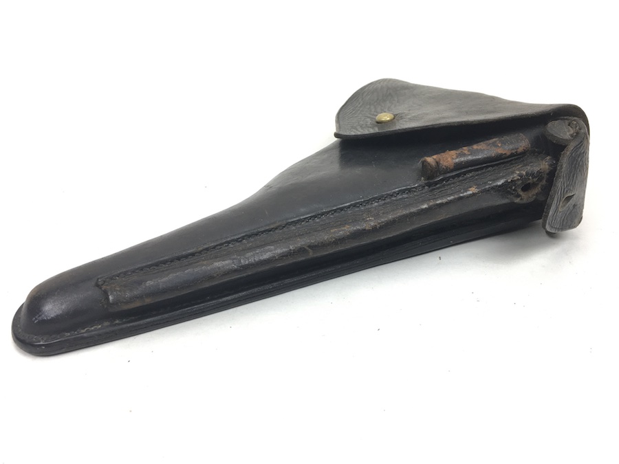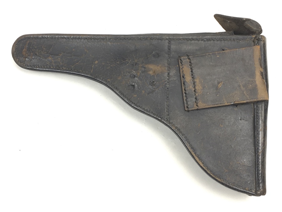 6/5/19 – Original and very good condition Portuguese army holster. Model M-2, issued 1908-1910. The leather is holding it’s shape nicely and has age wrinkling and use wear. The closure stud is missing from the cleaning rod closure flap. Stamped on the rear with “1565” and “AE” next to the belt loop. Interior is clean and lift strap is secure. Stitching is intact and secure.