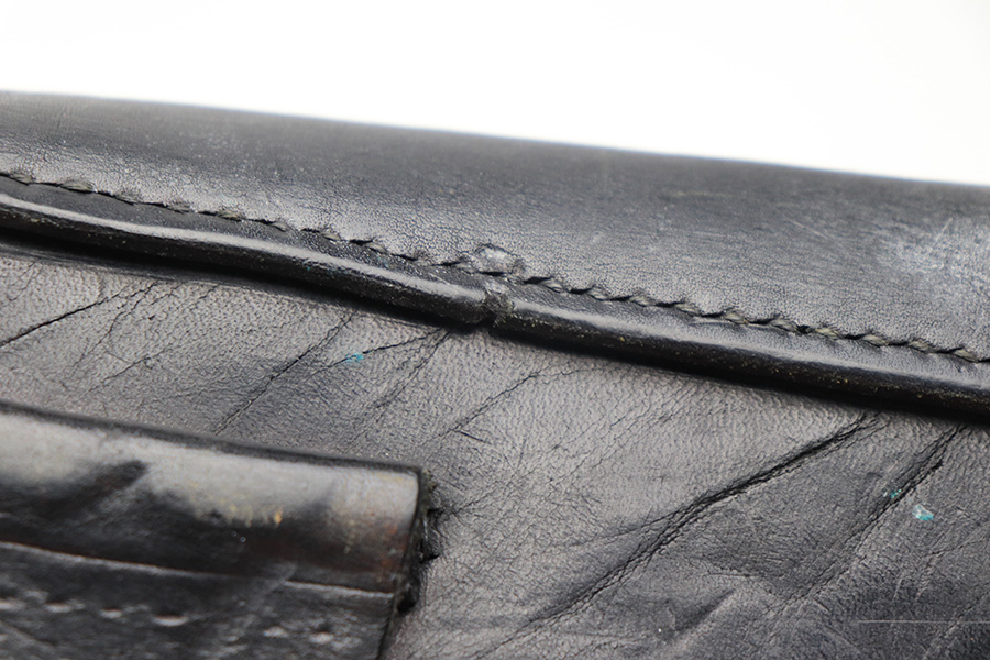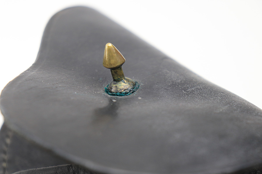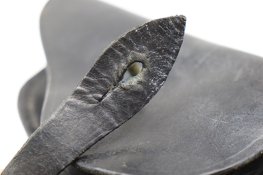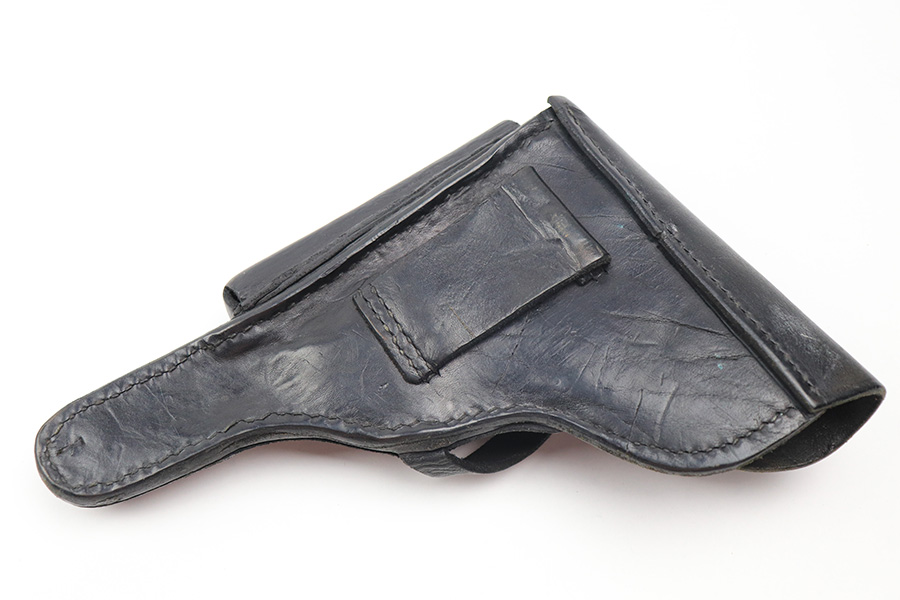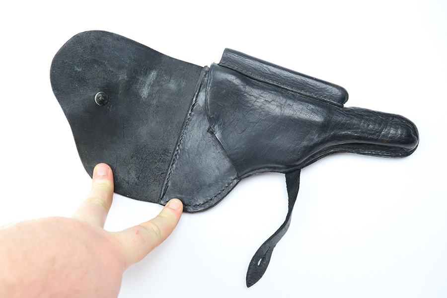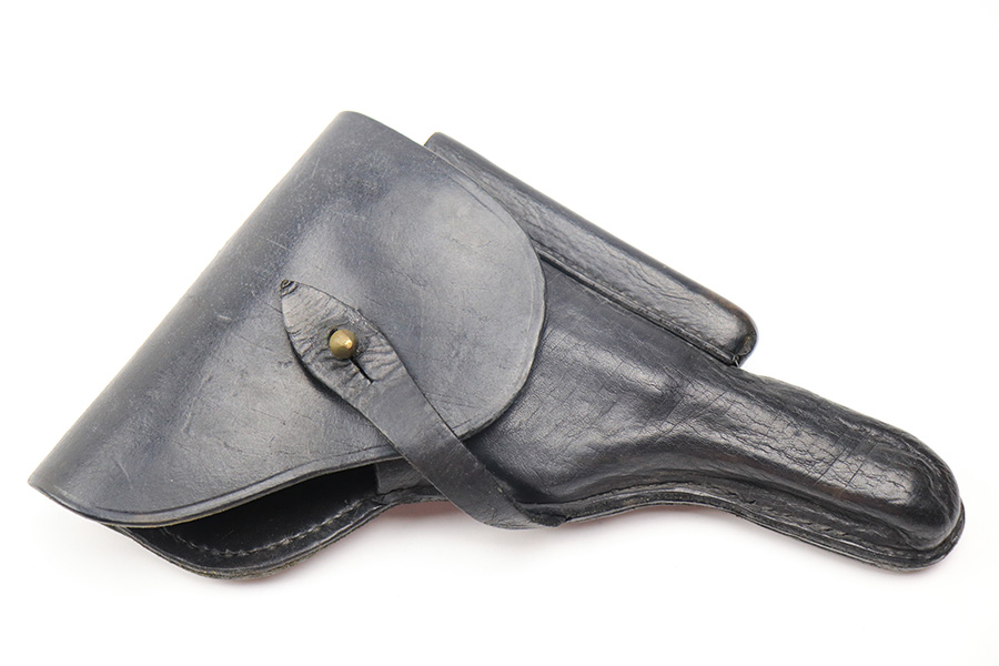12/7/21 – This is a WW2 era production Portuguese Luger holster. The holster has no markings or stamps and some normal signs of use and aging throughout the black leather and stitching. Brass closure knob. Very nice overall condition with no major issues.