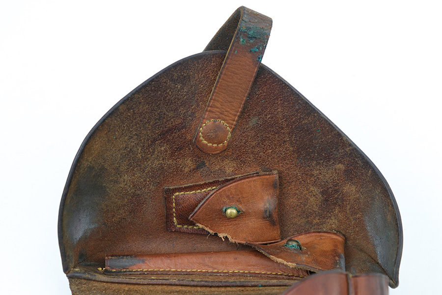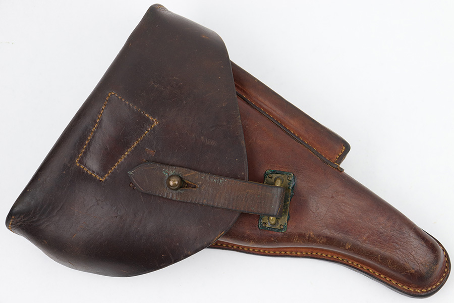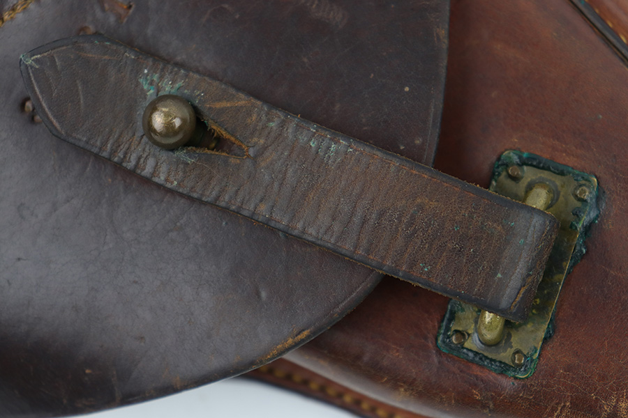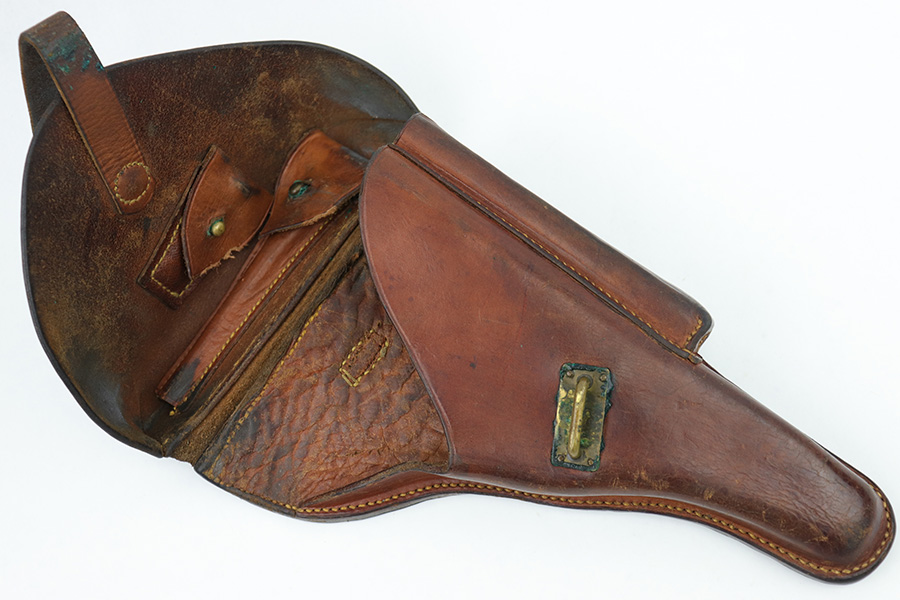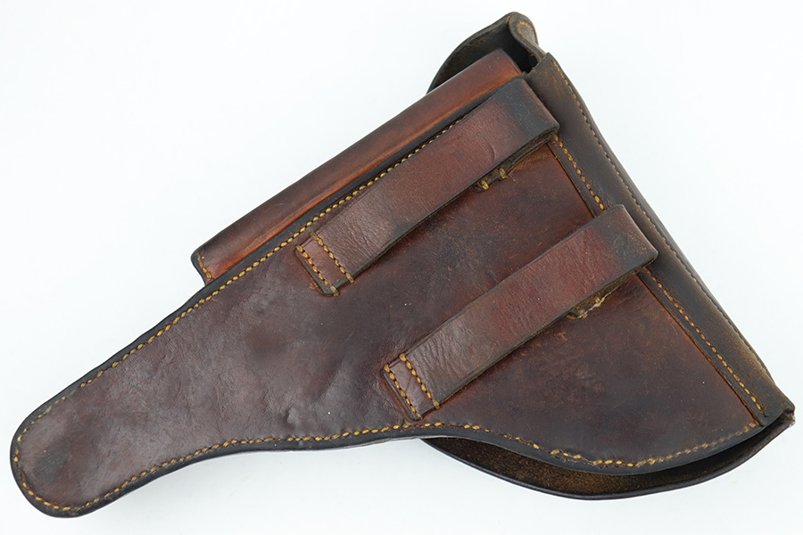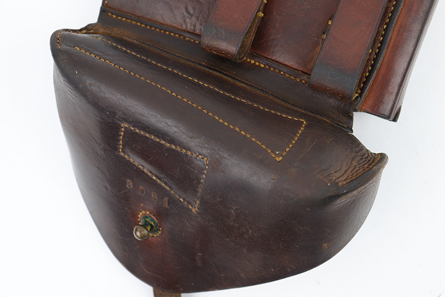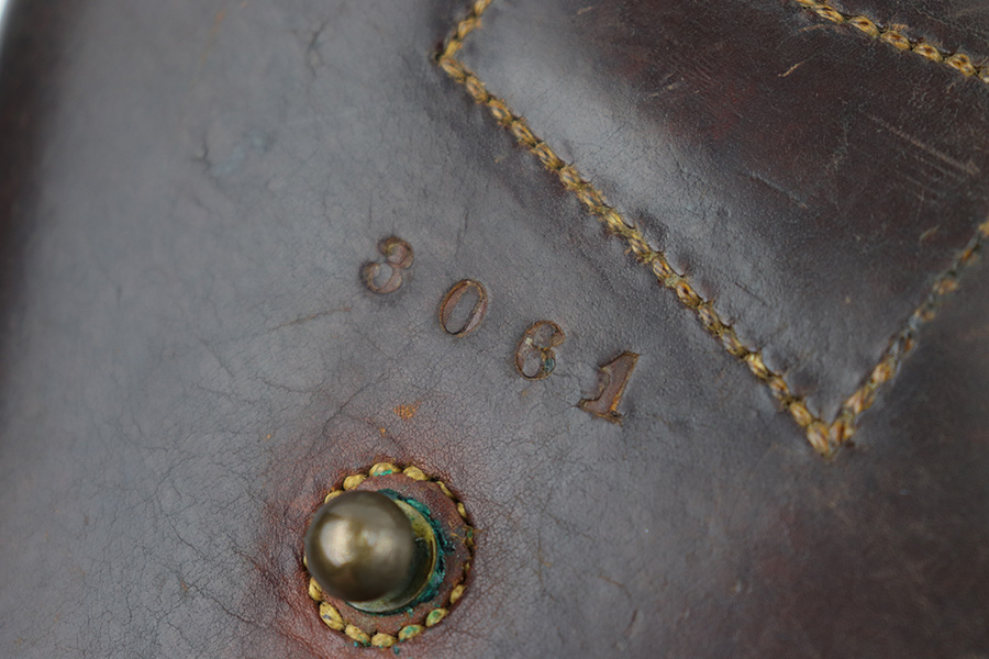 5/4/23 – This is an original Portuguese style Luger holster. The holster has no maker or date stamps, but judging from the brass closure knobs and fastening loop we believe this to most likely be WW1 – 1920’s production. Great overall condition with some natural aging throughout but no major damage. Normal pliability and all original stitching is tight and intact. Number stamped on the front lid as shown. Internal pouches for cleaning rod and for takedown tool.