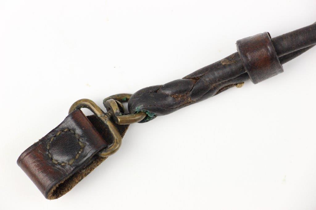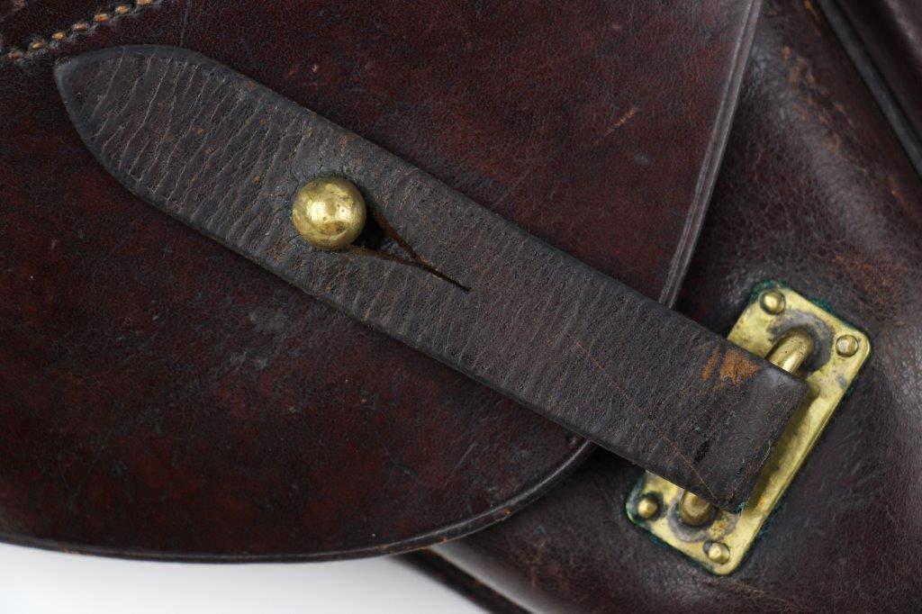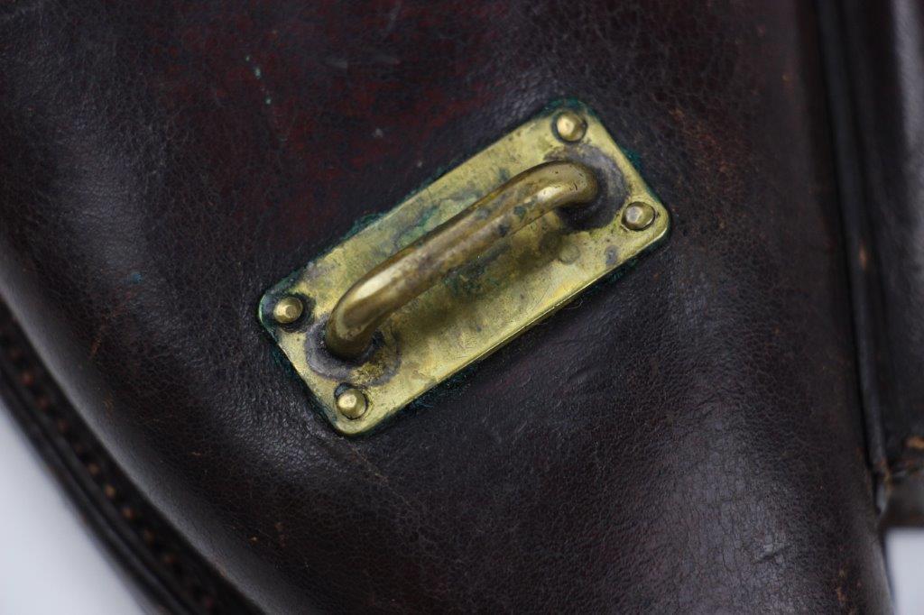 10/11/24 – This is an original WW2 era M1943 Portuguese Luger Holster. The holster is in excellent condition with brass fixtures and all original stitching. The leather is soft and pliable with light use wear and natural aging. Clean interior leather. This holster is a complete rig: includes an original cleaning rod, unmarked Luger tool, and a rare leather lanyard. Each element is in great condition with natural surface patina but no rust or pitting, nor any notable flaws. The lanyard is especially nice with original brass swivel mount and all brass hardware. Both retaining / adjustment loops are present on the lanyard as well. Overall an excellent rig!