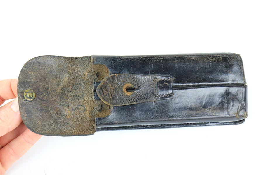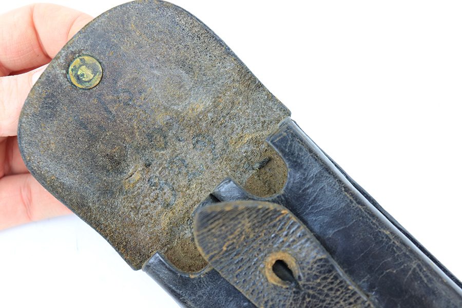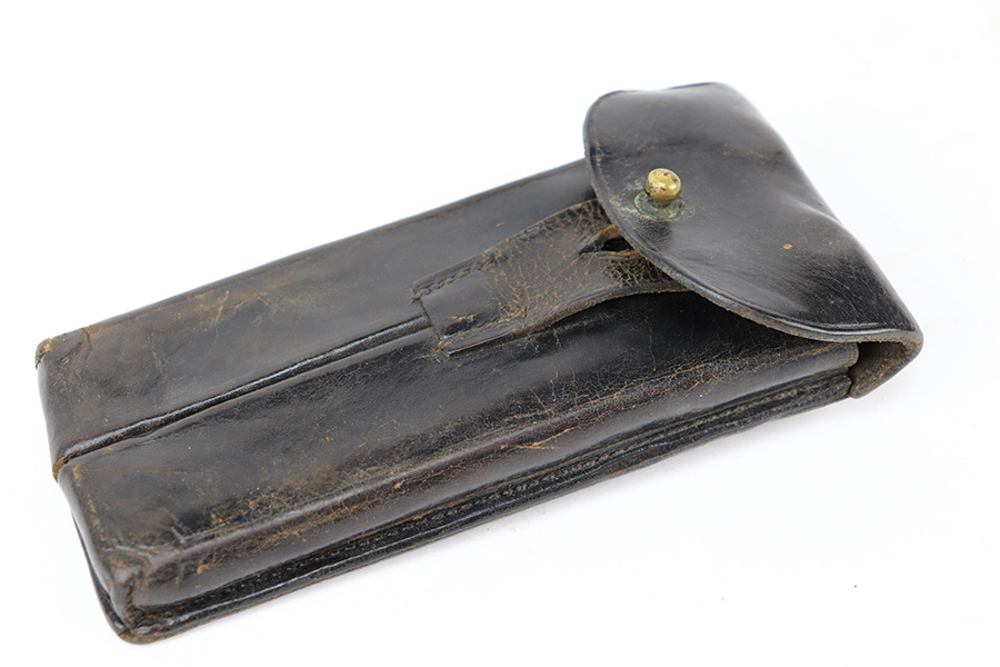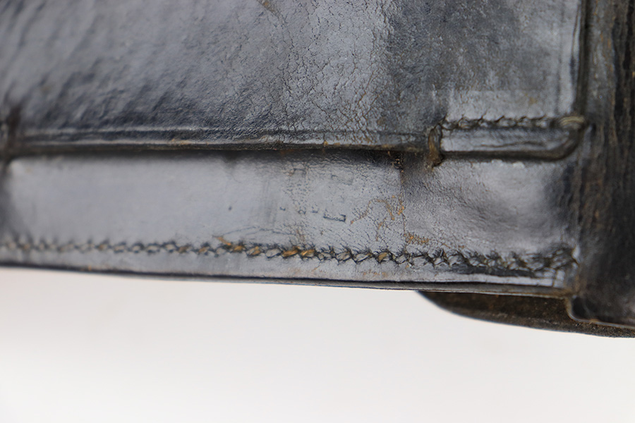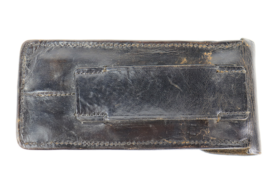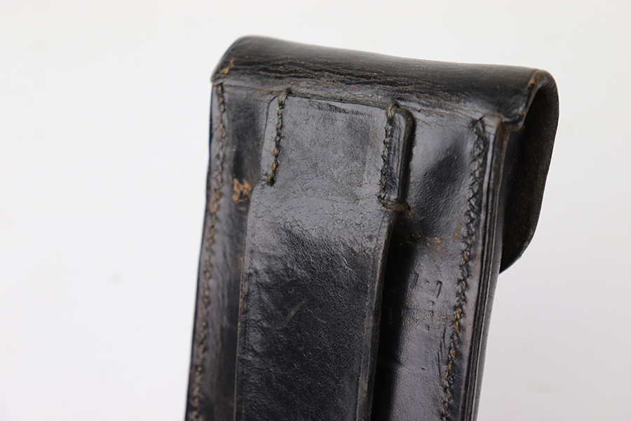 3/18/22 – This is an original Portuguese Luger magazine pouch. The leather pouch holds two magazines as shown, and is in great overall condition. There’s some mild surface wear and wrinkling on the leather but no cracks or rips in the leather. No stitching issues either. The back leather is “AE” proof stamped for Portuguese use.