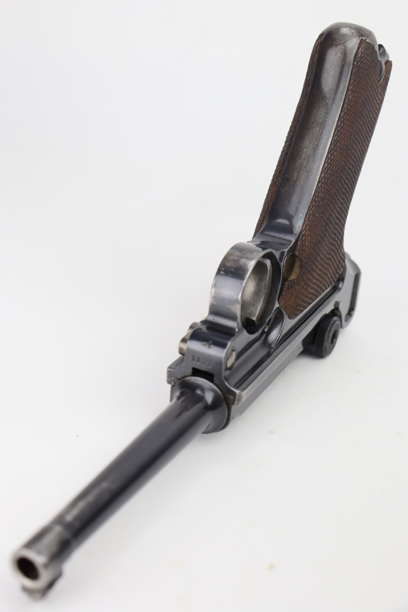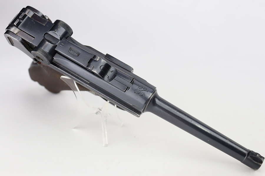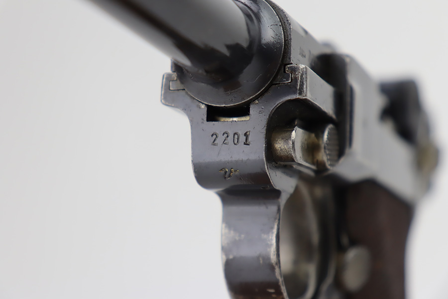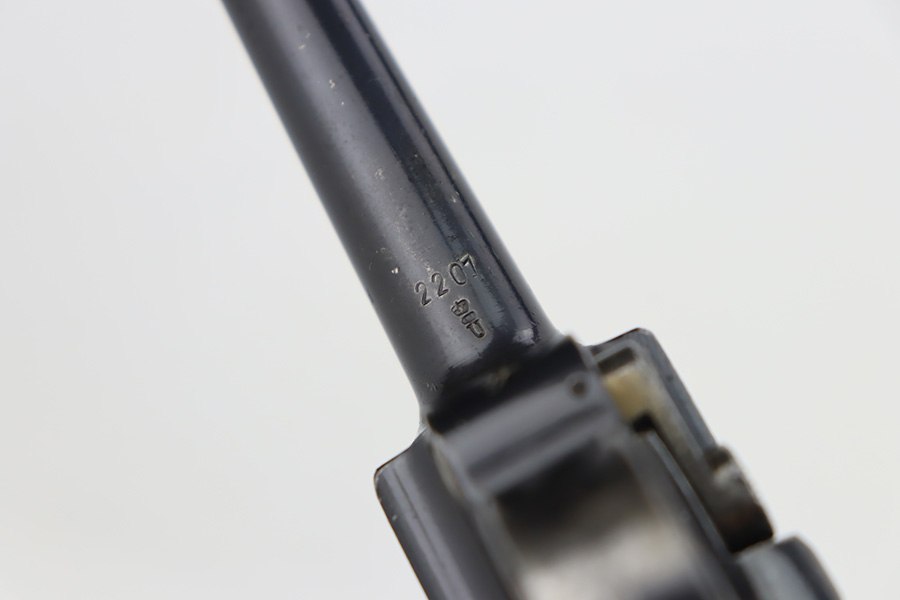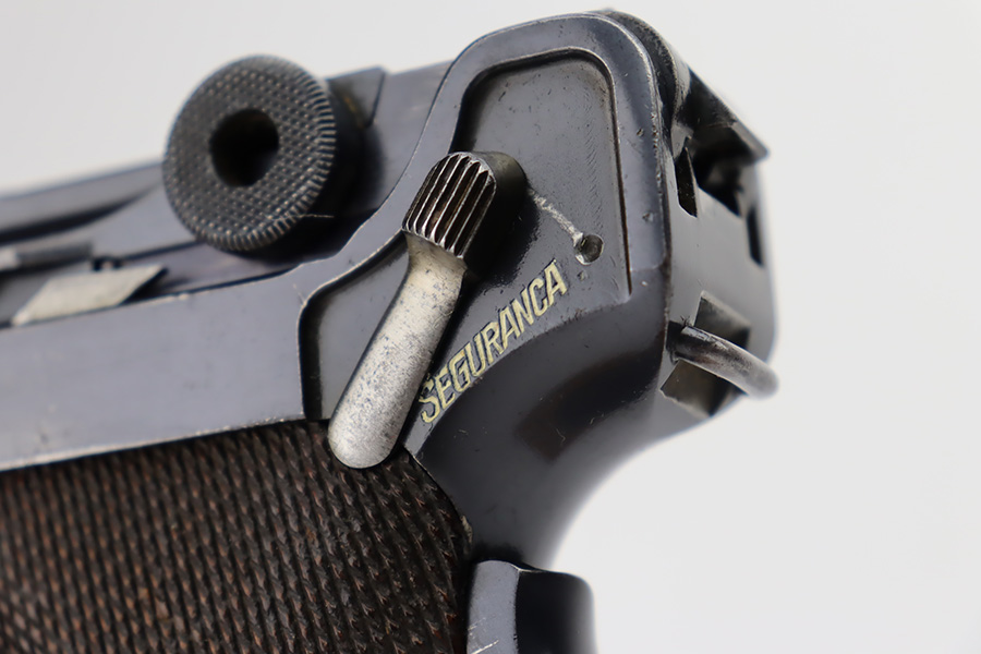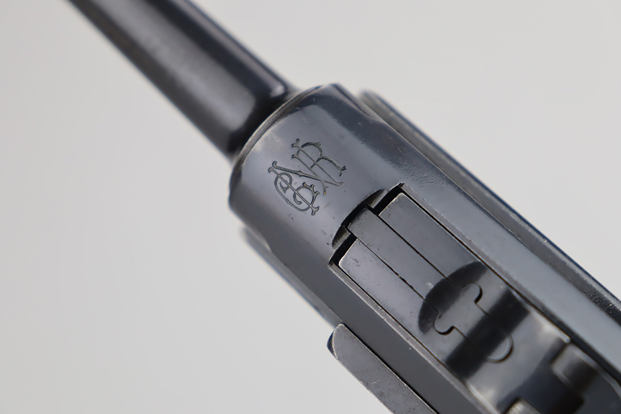 10/12/23 – This is a rare 1935/06 Mauser Banner Portuguese “Guarda Nacional Republicana” (Republic National Guard) luger rig. With a 120mm (4 3/4″) Barrel chambered for the 7.65mm. All parts are matching and correct. Crown/U proofed. Lower safety position is marked “Seguranca”. These lugers were unheard of in the collector market with only 564 produced, until many years ago when a large group was purchased from the Government of Portugal and imported into the United States. This is a well documented series of exactly 564 guns from 1921v through 2484v. These were made specifically for the Portuguese “Republican National Guard” – consequently, the top of the chamber area is marked “GNR” for Guarde, Nationale Republicanie. The bluing rates roughly 85% with thinning on the grip straps and areas of wear around the muzzle, along the barrel, and on the high edges. Some tiny pits around the muzzle. Fitted with very nice wood grips – tiny chip in the upper left corner of the left grip panel. Comes with a mismatched Nazi-marked magazine. Very nice bore with good rifling.
