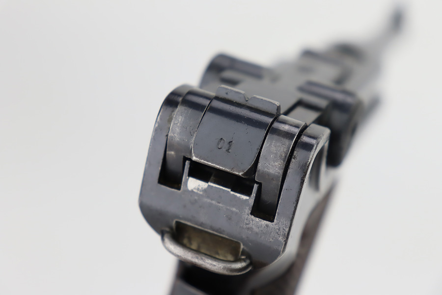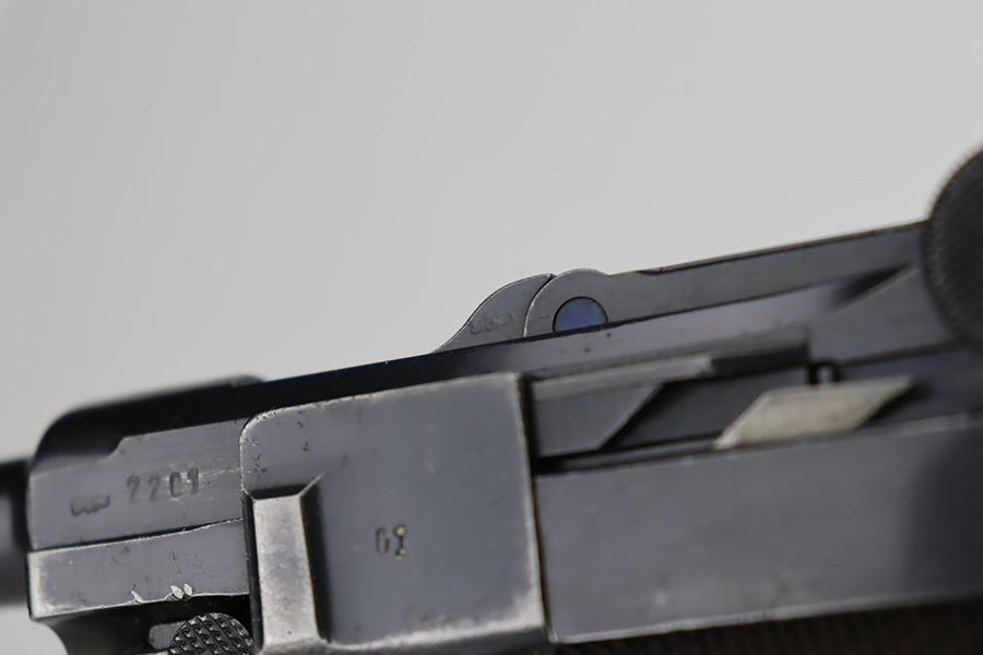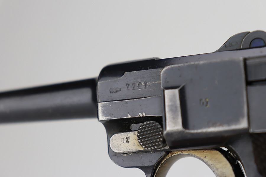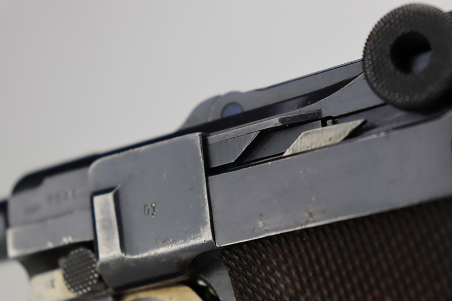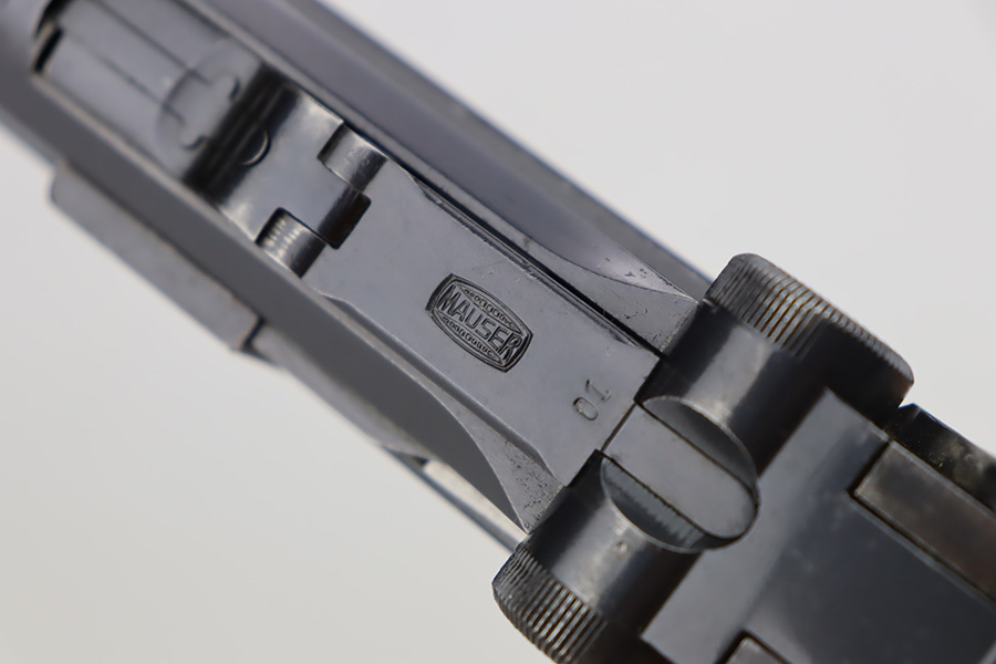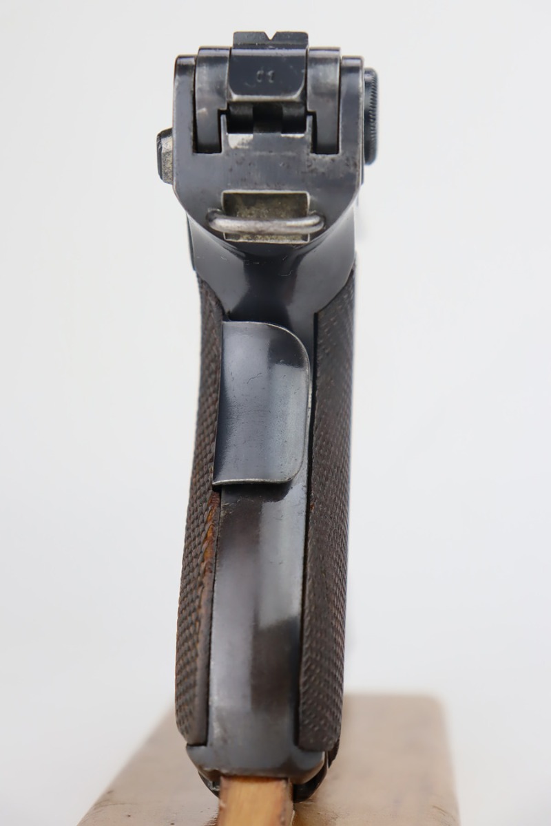 10/12/23 – This is a rare 1935/06 Mauser Banner Portuguese “Guarda Nacional Republicana” (Republic National Guard) luger rig. With a 120mm (4 3/4″) Barrel chambered for the 7.65mm. All parts are matching and correct. Crown/U proofed. Lower safety position is marked “Seguranca”. These lugers were unheard of in the collector market with only 564 produced, until many years ago when a large group was purchased from the Government of Portugal and imported into the United States. This is a well documented series of exactly 564 guns from 1921v through 2484v. These were made specifically for the Portuguese “Republican National Guard” – consequently, the top of the chamber area is marked “GNR” for Guarde, Nationale Republicanie. The bluing rates roughly 85% with thinning on the grip straps and areas of wear around the muzzle, along the barrel, and on the high edges. Some tiny pits around the muzzle. Fitted with very nice wood grips – tiny chip in the upper left corner of the left grip panel. Comes with a mismatched Nazi-marked magazine. Very nice bore with good rifling.