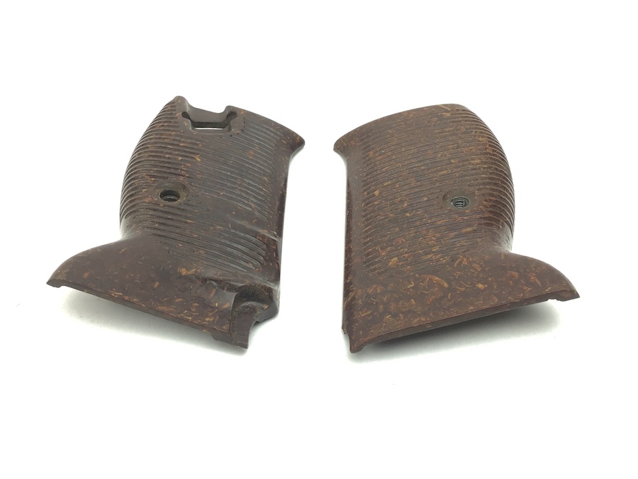 12/17/21 – Original and great condition. Spreewerk P.38 Grips & Screw. Posselt produced the grips for the Spreewerk-made P38s from the end of 1943 until the end of WWII. The Posselt grips have the typical exterior of the majority found on P38s, except that they show only 5 grooves by the grip screw hole. The “Circle 1w – 41” are stamped on the interior of each grip. These grips are reddish / brown color showing the typical texture of the Posselt style. There is one very small chip in the right grip panel (see photos).