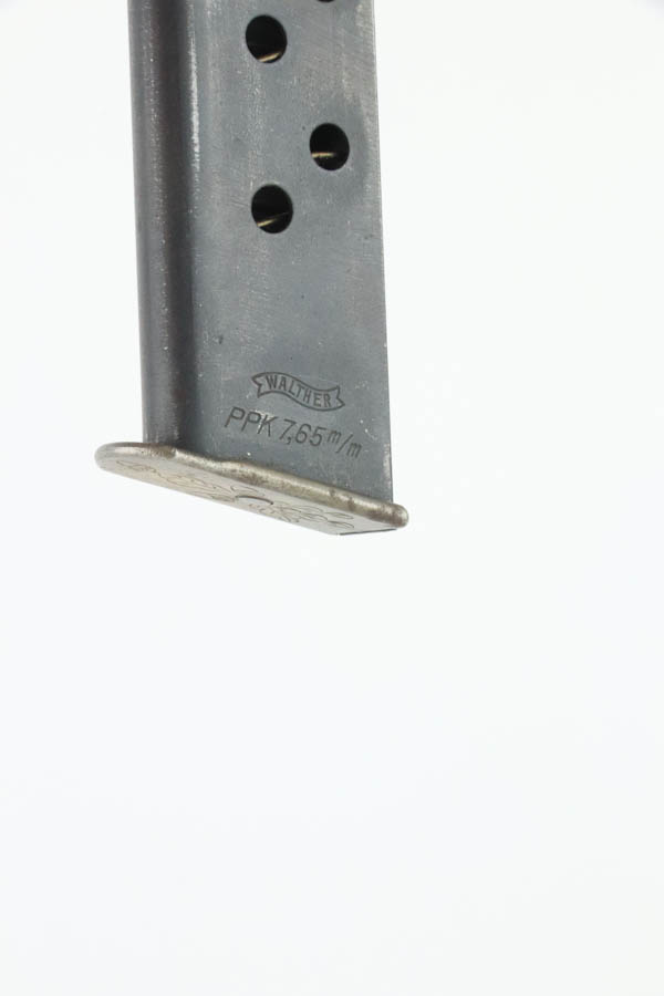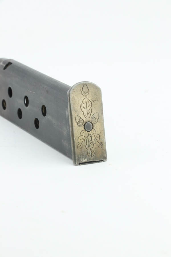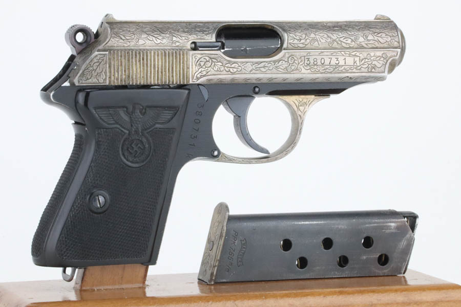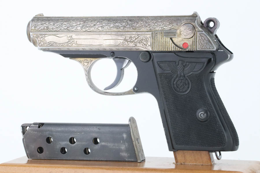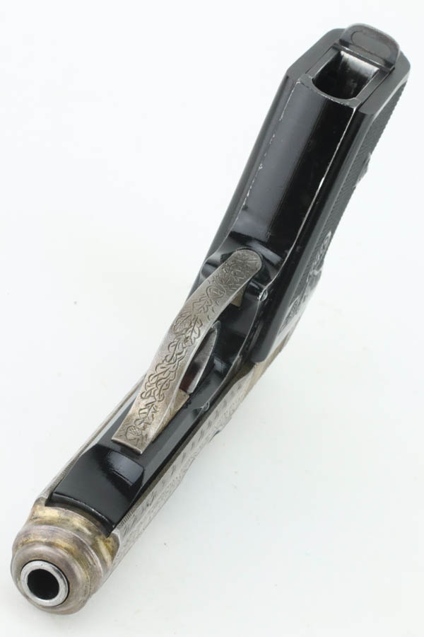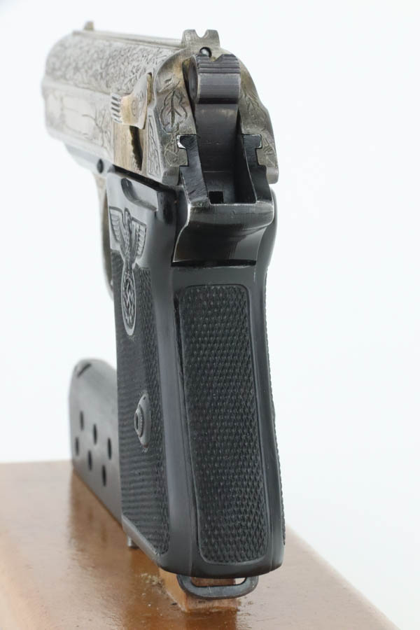 8/9/24 – This is an interesting “show piece” Walther PPK from late 1943 or early 1944 with a lightweight duraluminum frame. The engraving is over an older nickel finish on the slide, the trigger guard, and the bottom of the magazine. The frame is an anodized black finish. The style of the engraving is Germanic Oak Leaf and Acorn. Comes with a correct wartime magazine. It is also embellished with a post-war, black “Party Leader” grip. Minty bore. It is a nice looking display piece or conversation piece.