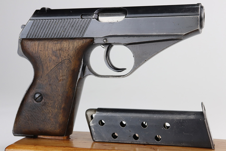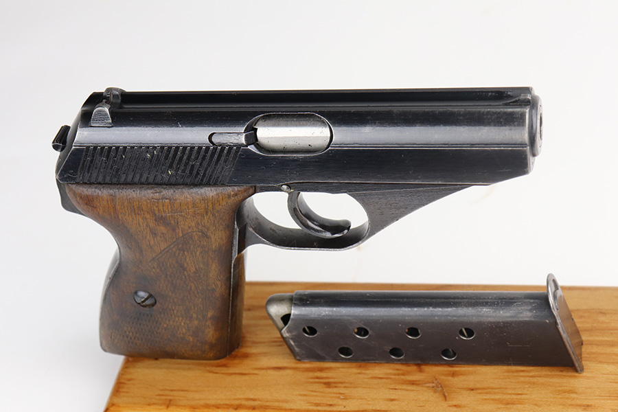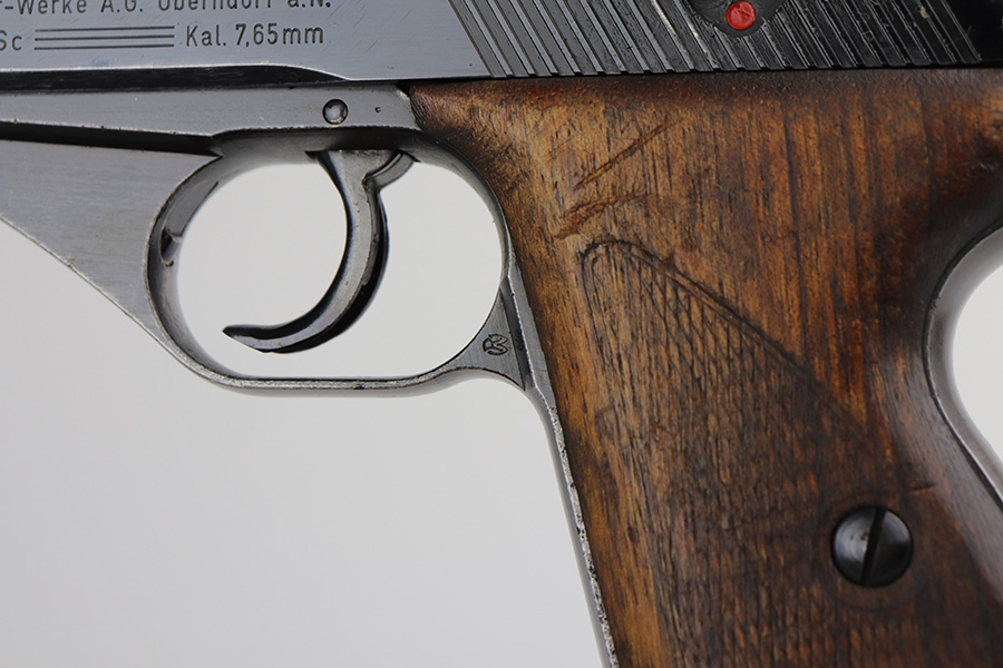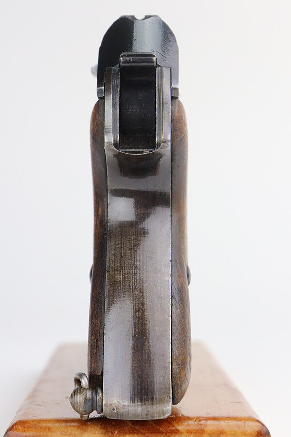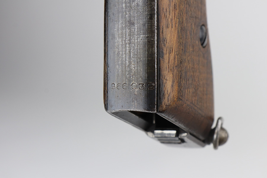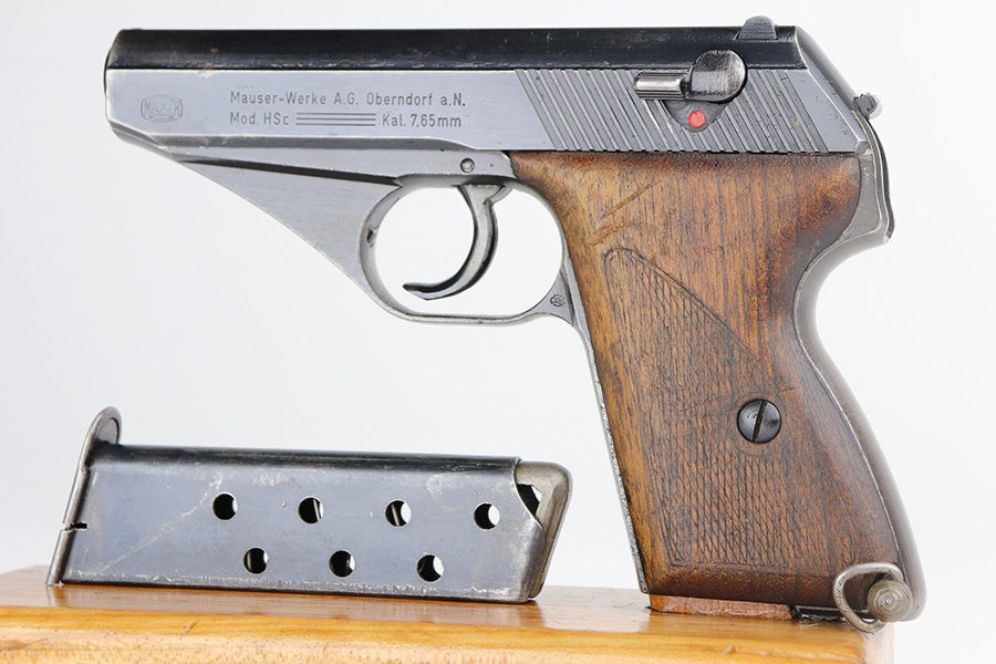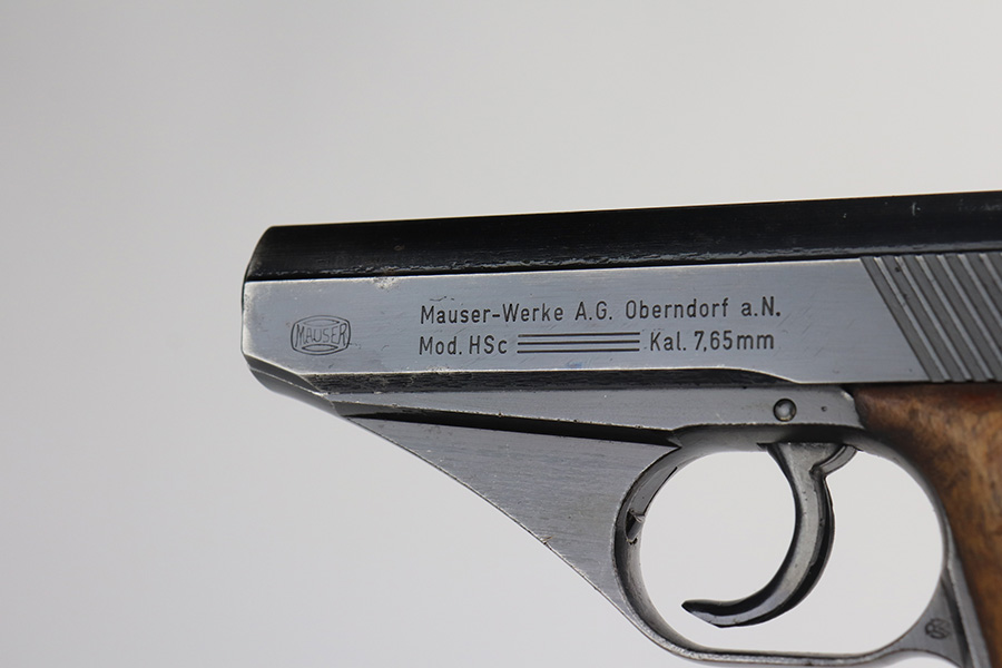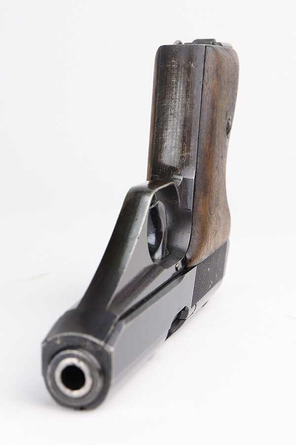 6/9/21 – This is a nice example of a French Mauser HSC made immediately after WW2. It is all matching, has the proper French proof on the trigger guard, and has a lanyard ring. The lanyard could be an indication that this gun was issued to the police force – no way to tell for sure. It has retained roughly 85% of its bluing. Most of the wear is on the straps, but there is also minor wear on the high edges of the slide and around the muzzle. Light spotty oxidation here and there. Comes with slightly worn wood grips and an un-marked magazine. The bore is excellent – shiny with strong rifling.