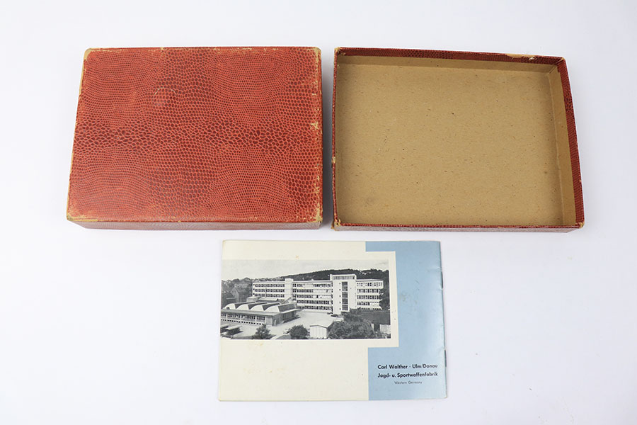 7/6/21 – This is a post WW2 Walther PP box with an original manual. The box is in great condition with some mild edge wear and a small tare in the lid. There’s also a mild imperfection in the base of the box. The manual is in great condition.