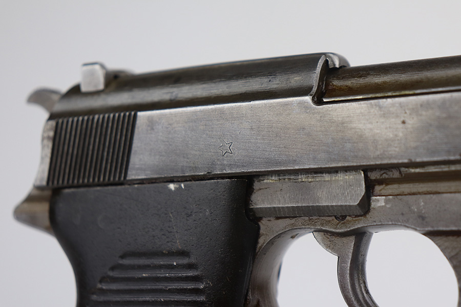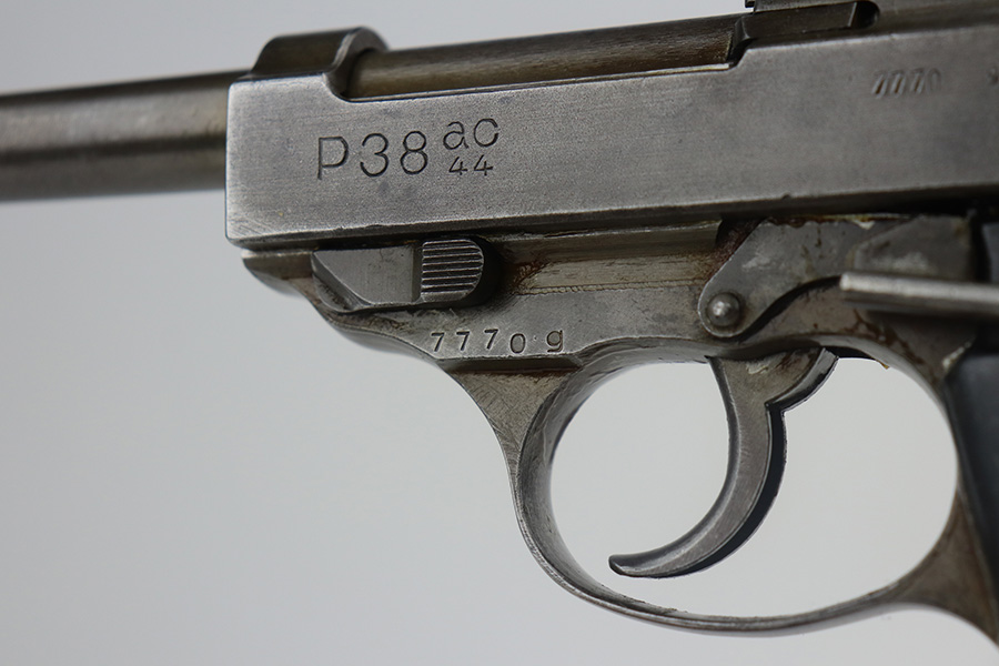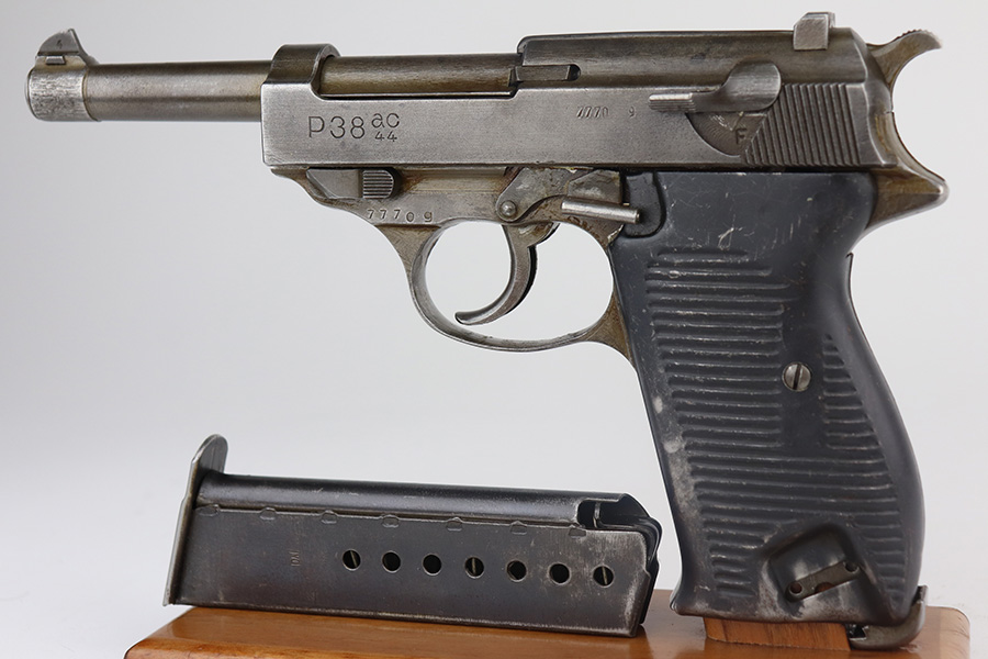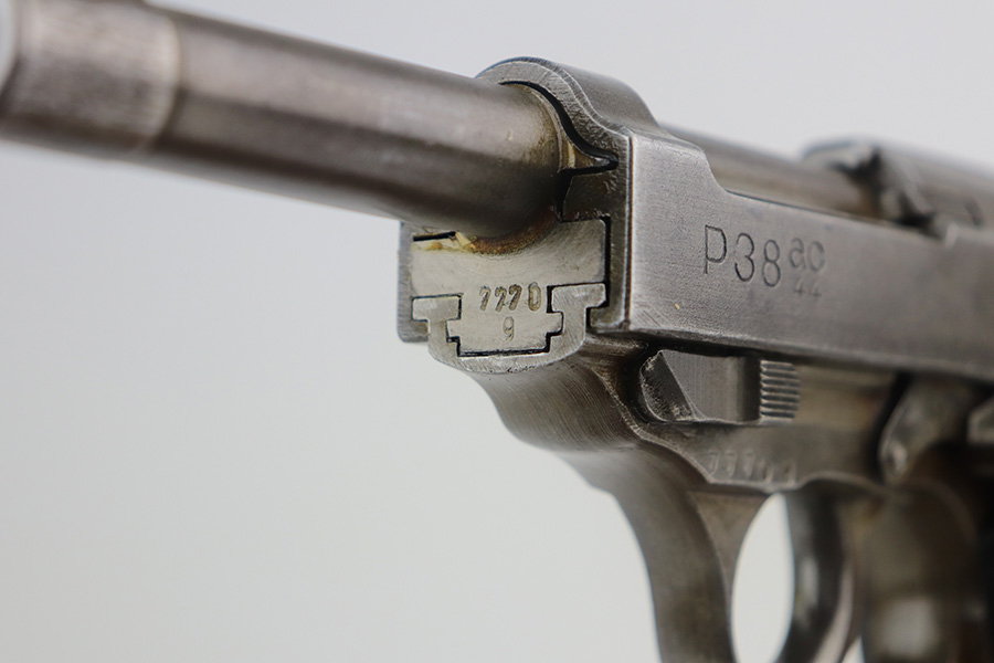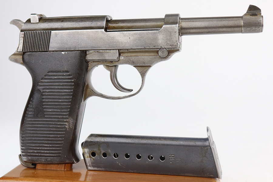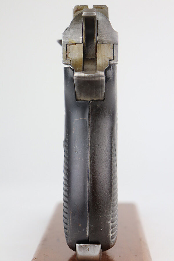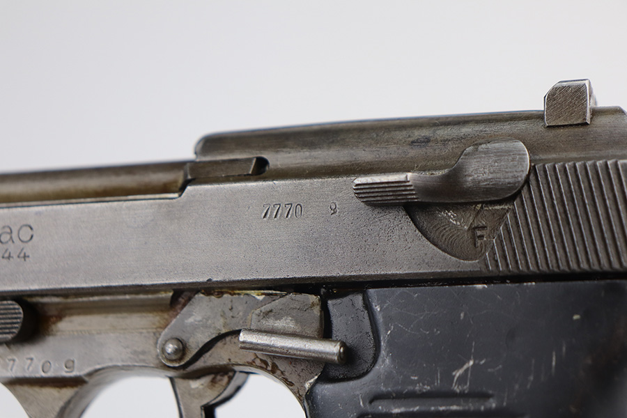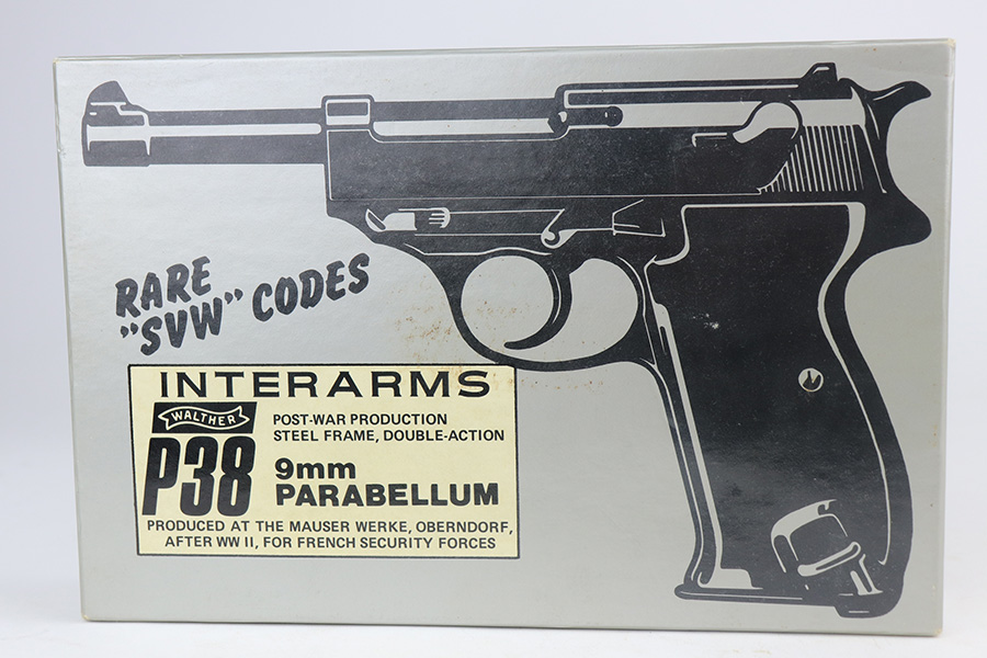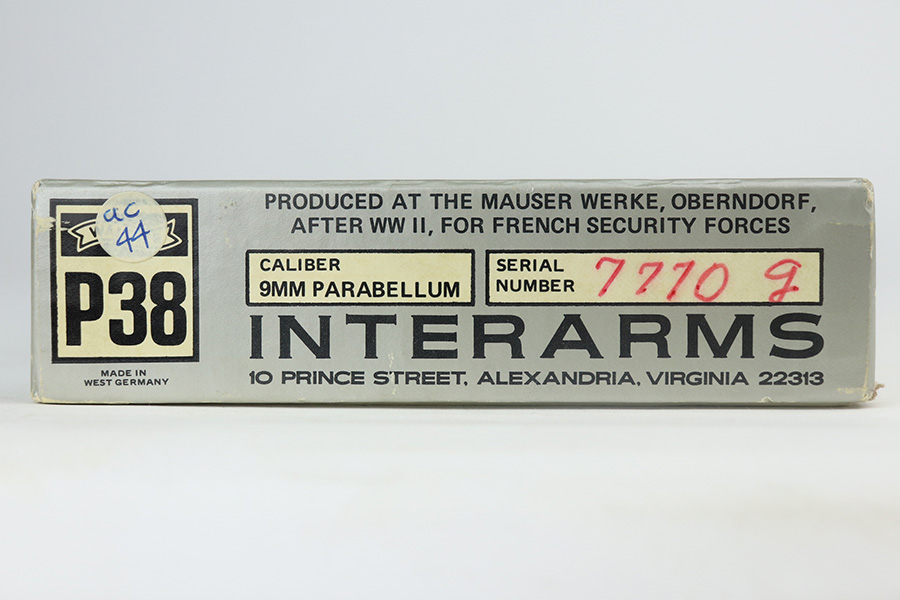 6/3/21 – This is an excellent example of a Mauser P.38 that was put together from parts after WW2 and issued to the French security services. They were then imported to the US by Interarms. This one comes with an original matching Interarms box and owners manual. The gun is all matching, has Waffen proof on some of the internal parts, and a French star on the right side of the slide. No import mark. It has a rare FN slide and an all-phosphate finish. The nature of this finish is difficult to rate, but our best guess is about 90-95% retention. There is minor thinning on the front strap and barrel. Areas of spotty oxidation throughout. Comes with nice post-war French grips. The lanyard loop is missing. Comes with a rare WW-era “U” makred waffen-proofed magazine. Mint bore. De-cocker is functional.