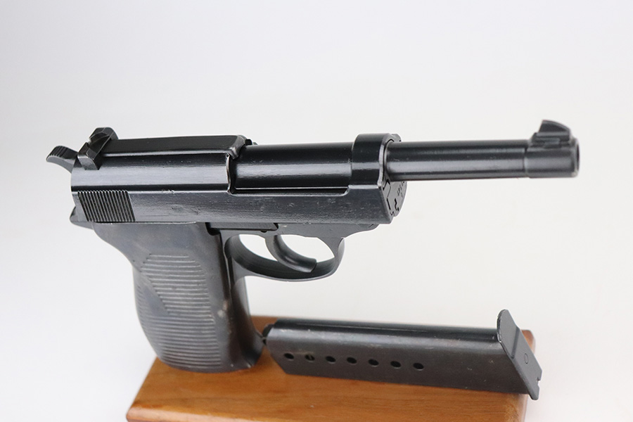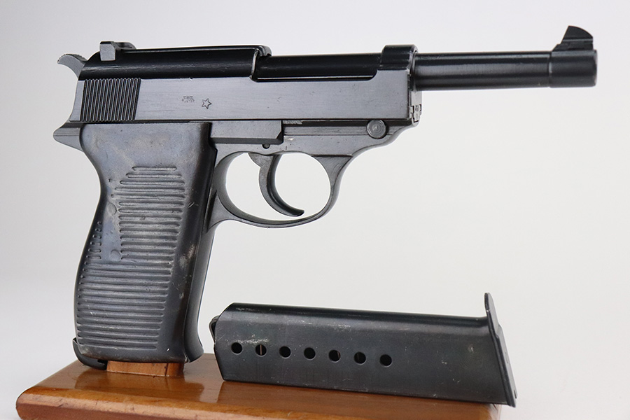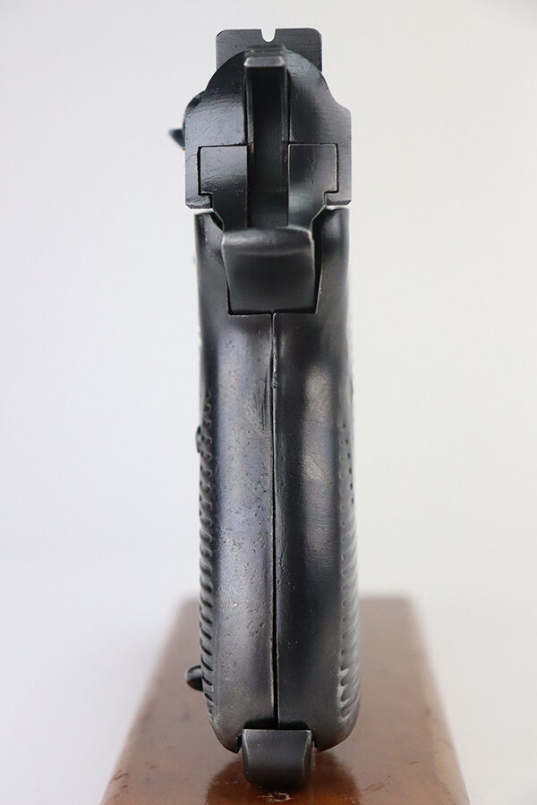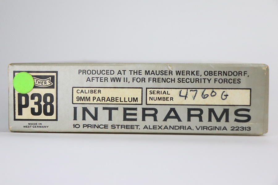 2/27/23 – This is a minty example of a Mauser P.38 that was put together from parts after WW2 and issued to the French security services. They were then imported to the US by Interarms. This one comes with an original matching Interarms box and owners manual. The gun is all matching, has Waffen proofs on the barrel and right side of the slide, and a French star on the right side of the slide. No import mark. It has retained more than 98% of its finish. There is a very light scratch on the left side of the slide, a small ding on the right side of the slide, and some small dings on the right side of the frame. Comes with post-war French grips and a WW2-era waffen-proofed magazine. The bore is shiny with strong rifling with just a hint of pin-pricking in the grooves. De-cocker is functional.