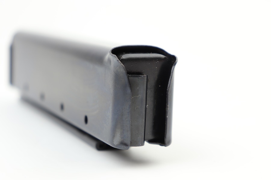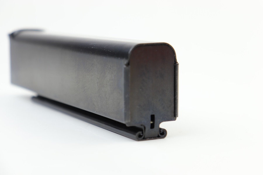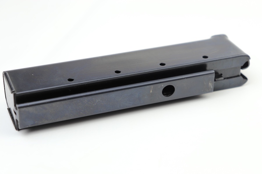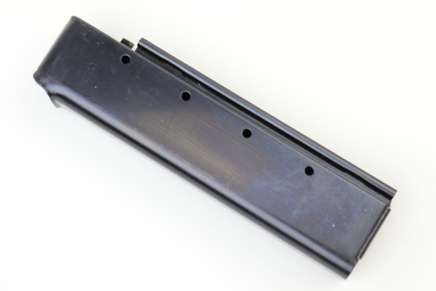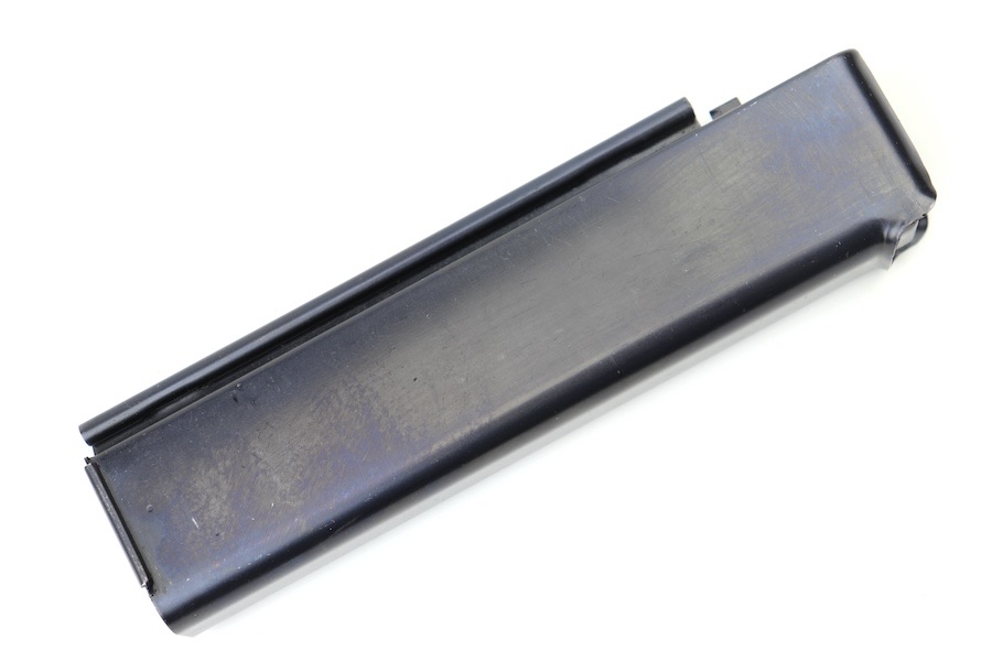 12/28/23 – This is an excellent condition post WW2 Thompson sub machine gun magazine. Bluing is 99% with just a couple of tiny surface scratches. Spring is strong with no hang up. Capacity is 20 rounds of .45 ACP. No visible markings or stamps on the magazine exterior.