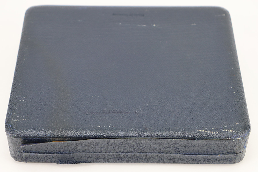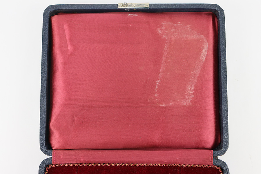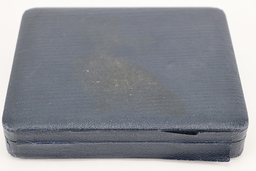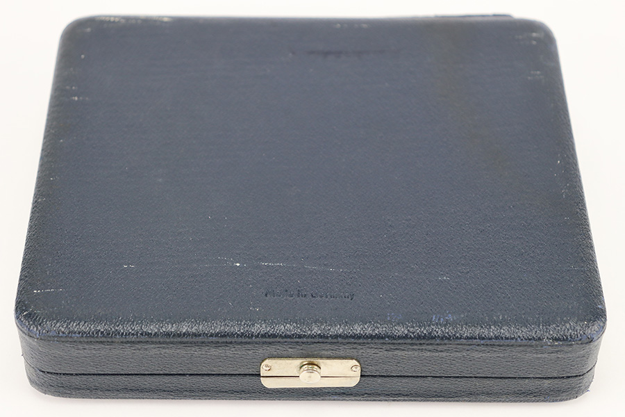 1/31/24 – This is a Post-War, Walther PPK display case. It does not have the Walther banner inside. This is the typical blue case with red interior. Condition is fair. The top, outside of the case has a bit of discoloration, and the back is marked “Made in Germany”. It holds a PPK with finger extension magazine and one spare magazine. There are no other items with the case.