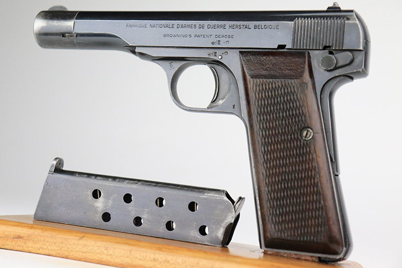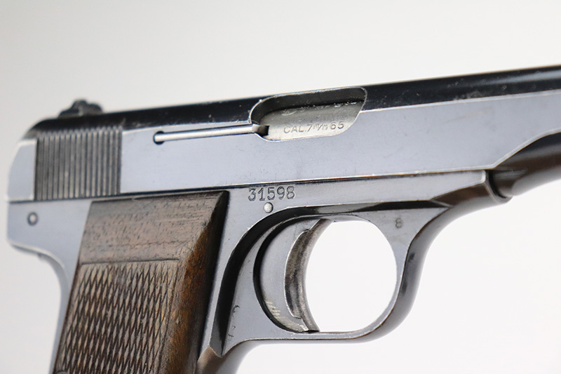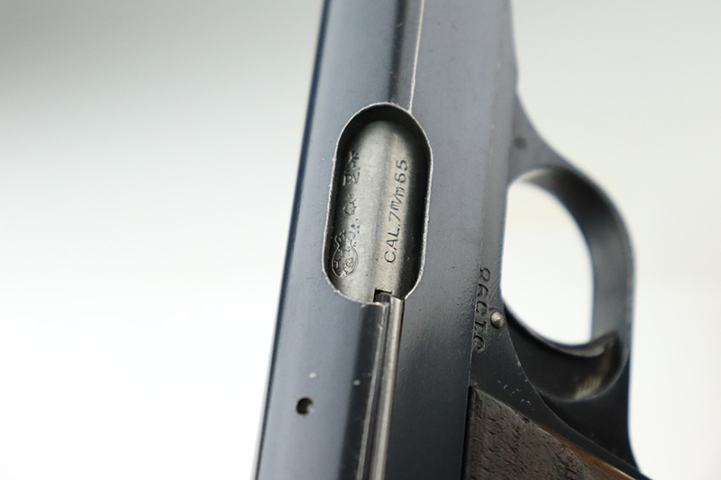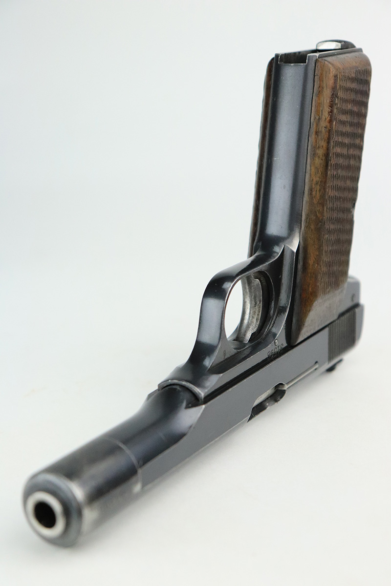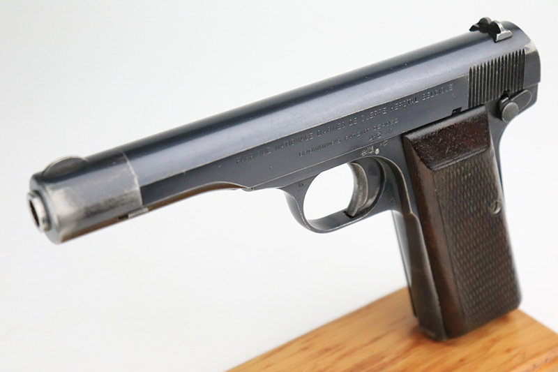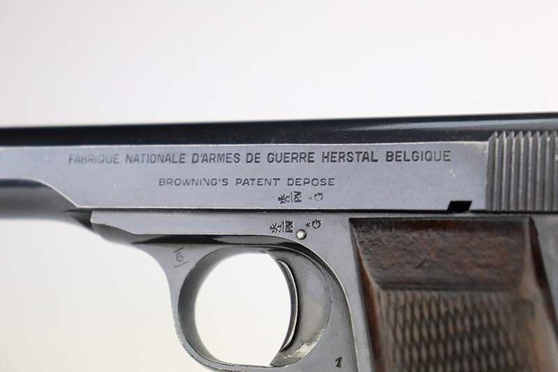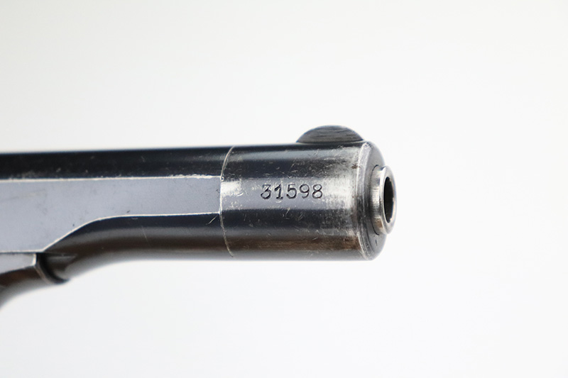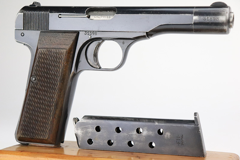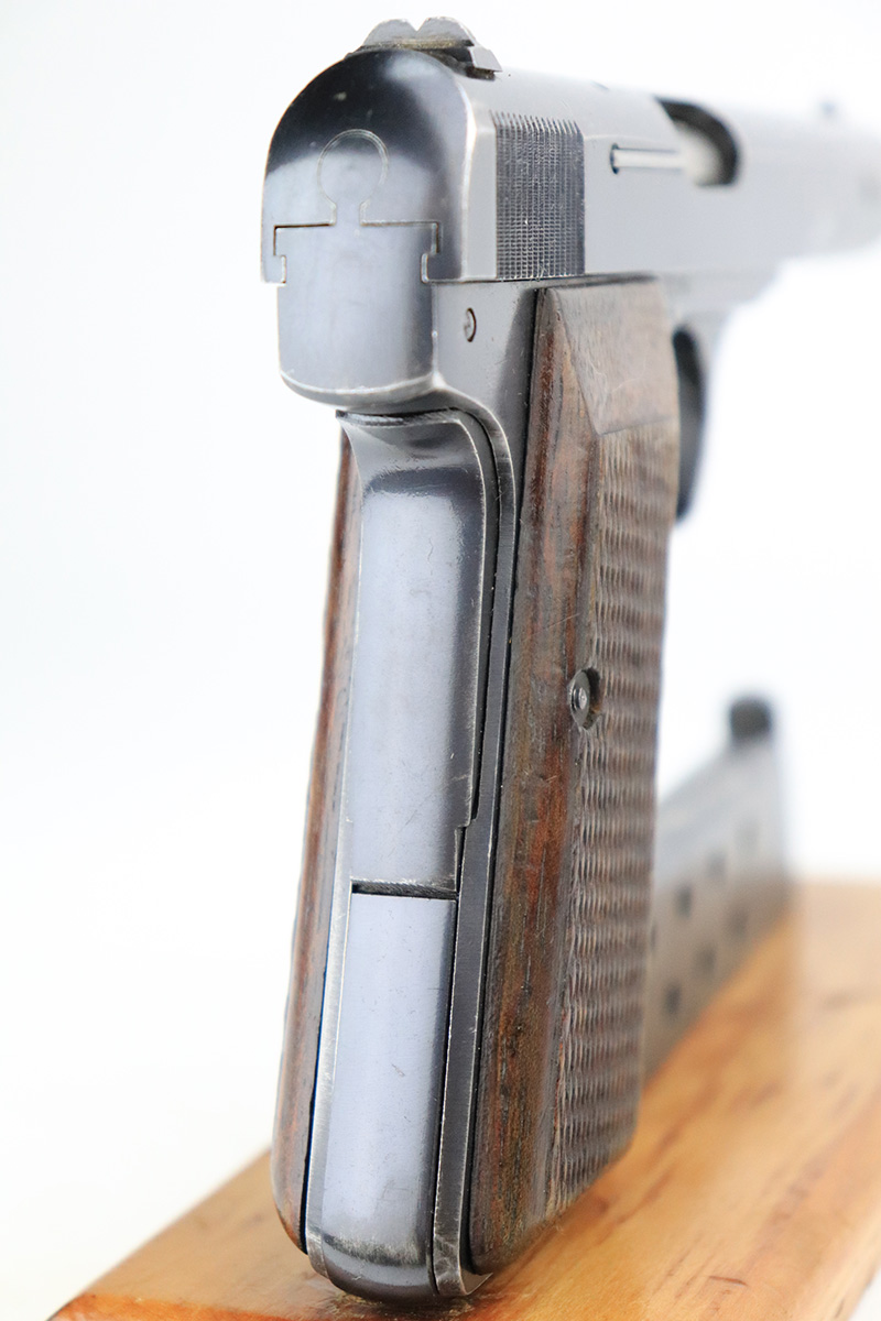 9/7/22 – This is a nice example of a post-WW2 FN Browning Model 1922. It is all matching and has the proper Belgian proofs. It has retained about 93-94% of its original bluing. Most of the wear is around the muzzle. There is also some minor wear along the slide concentrated around the high edges. A few light scratches around the muzzle and some tiny handling marks along the barrel and on the straps. Comes with very nice wood grips and one proper magazine. Mint bore.
