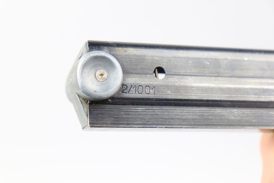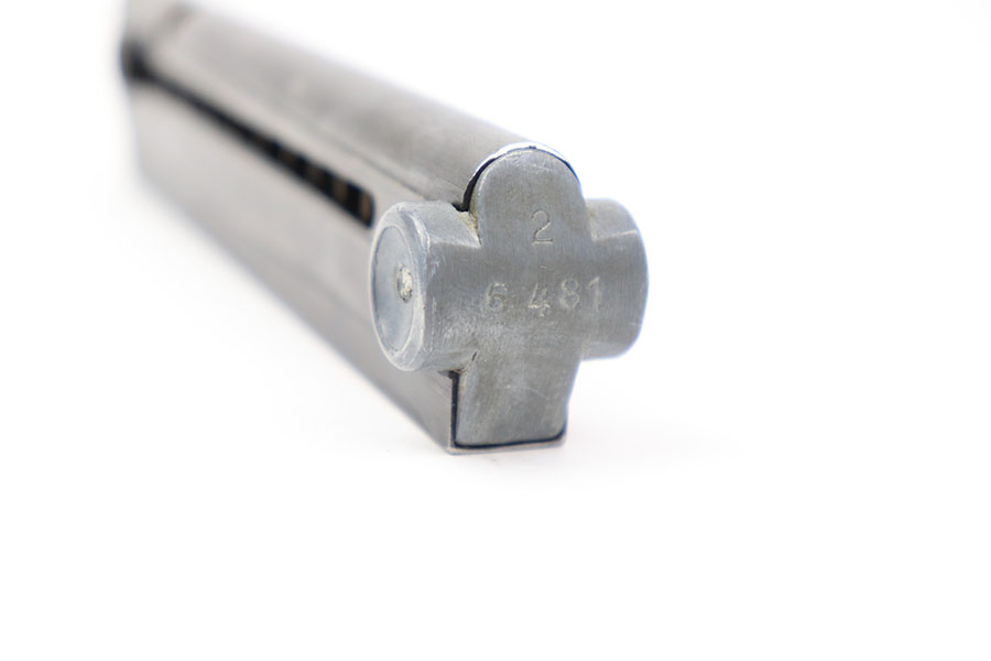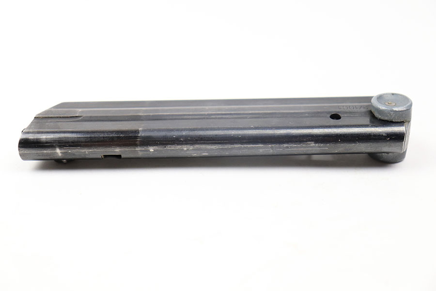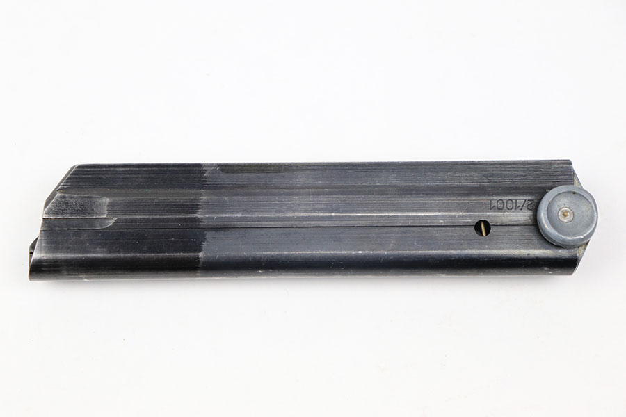 11/23/21 – This is an original luger magazine, likely made post WW2. The magazine is numbered on the tube 2/1001. The tube is blued and excellent with no rust or pitting. The aluminum base is numbered 6481 with a “2” above the serial. The spring is strong and fully functional.
