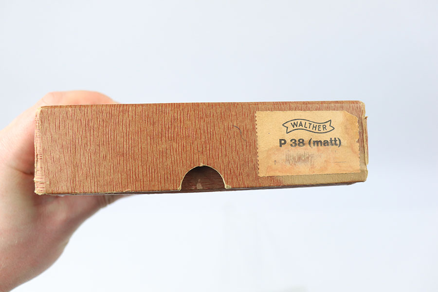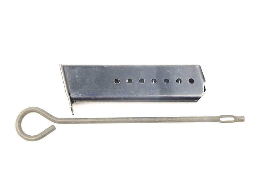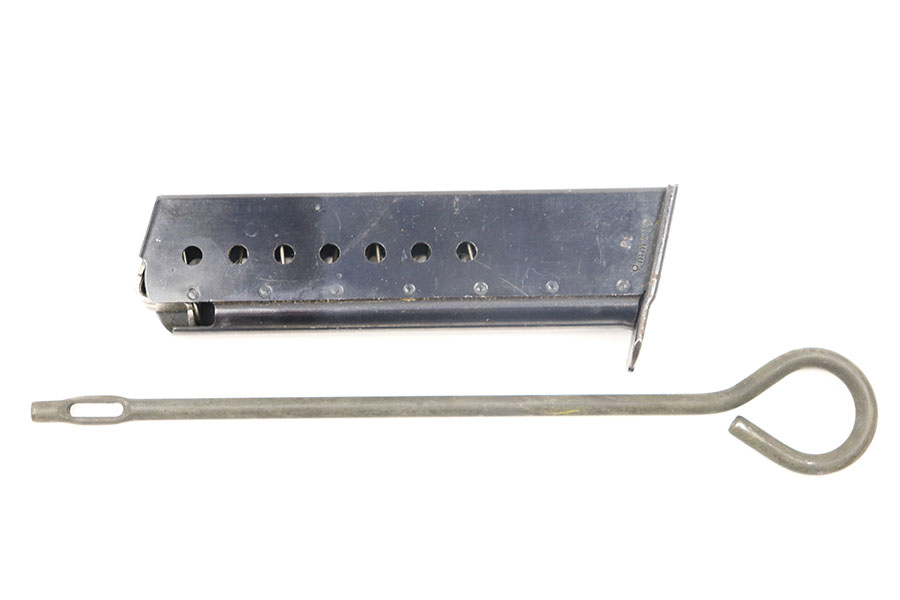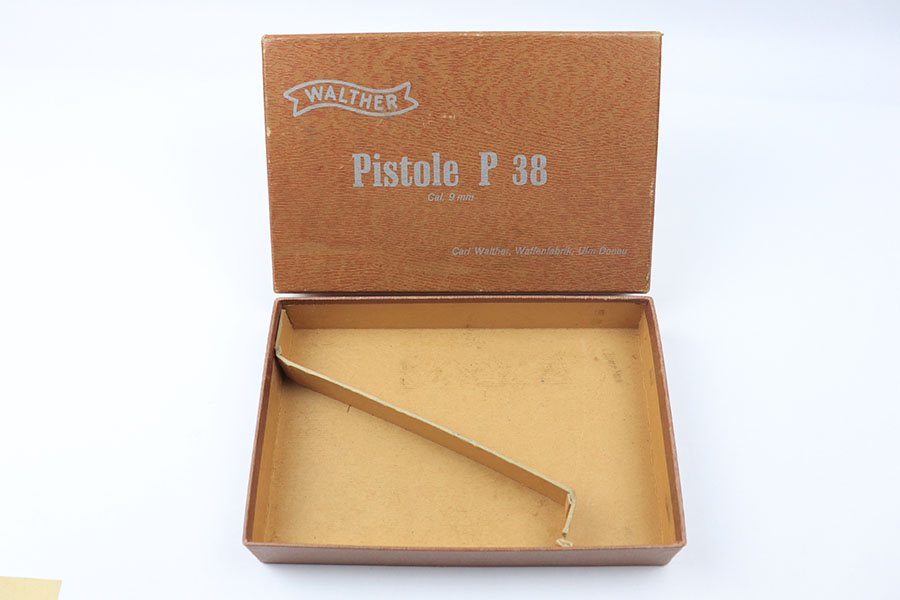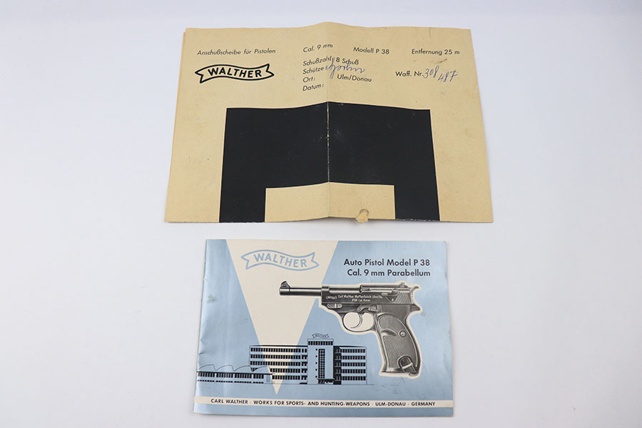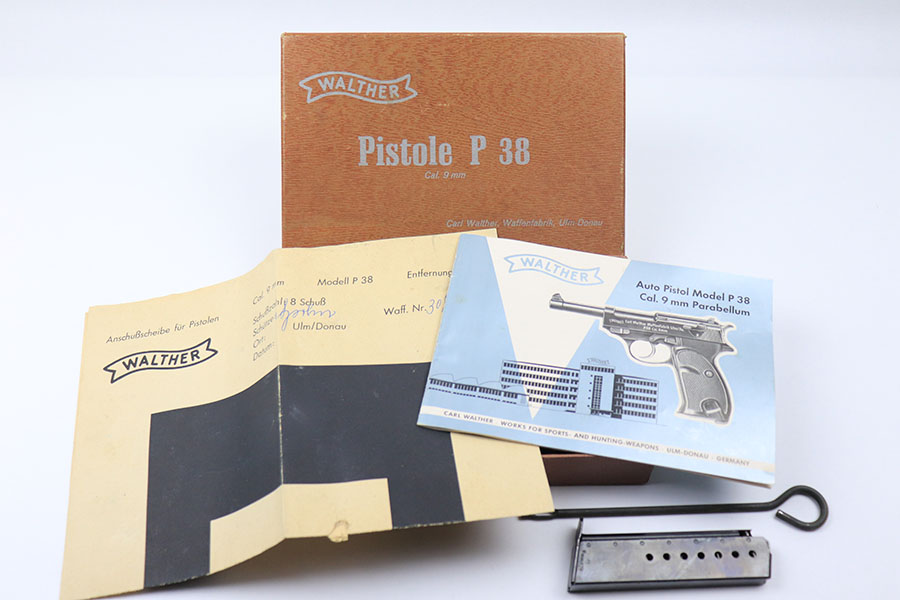 10/29/21 – This is an original Walther production P.38 box with factory target, manual, cleaning rod, and a Walther P1 magazine. These are post WW2 production extras that fit any standard P.38. All parts / pieces are in excellent condition overall with some mild signs of previous use and aging.