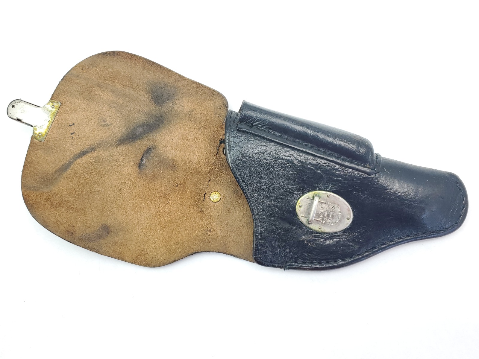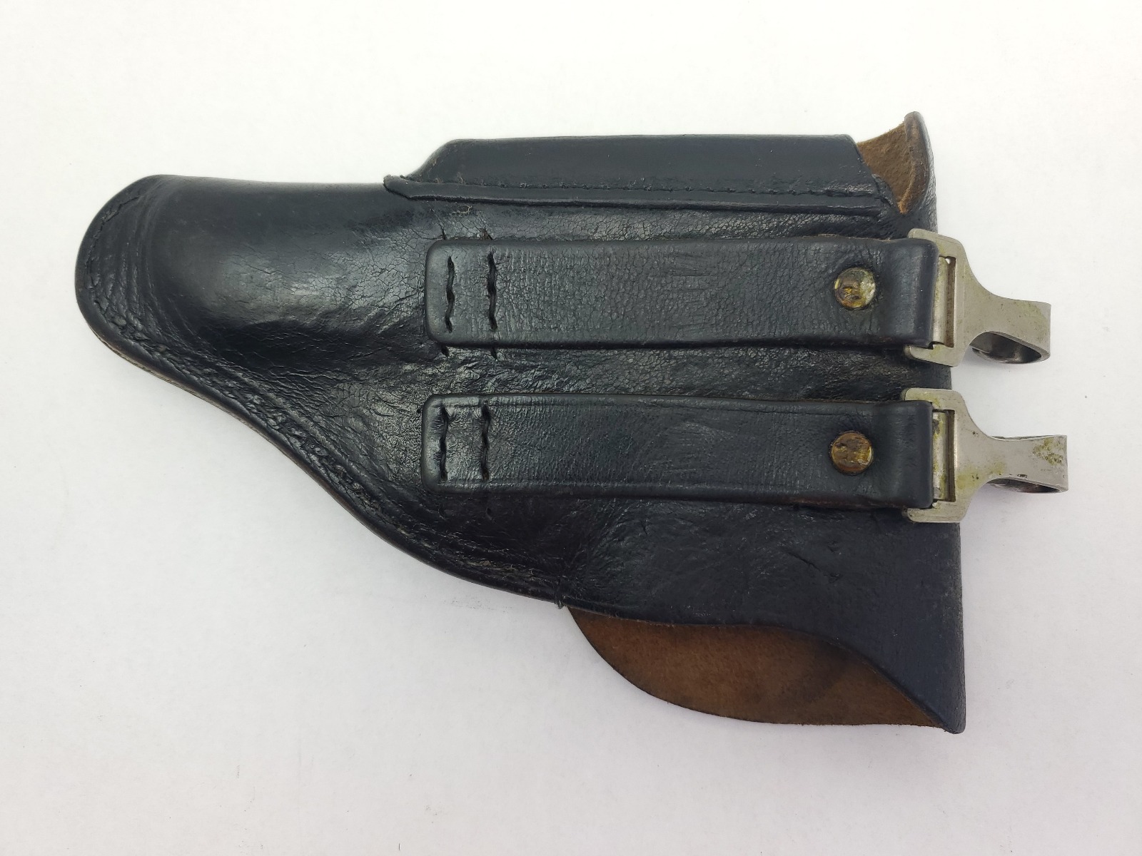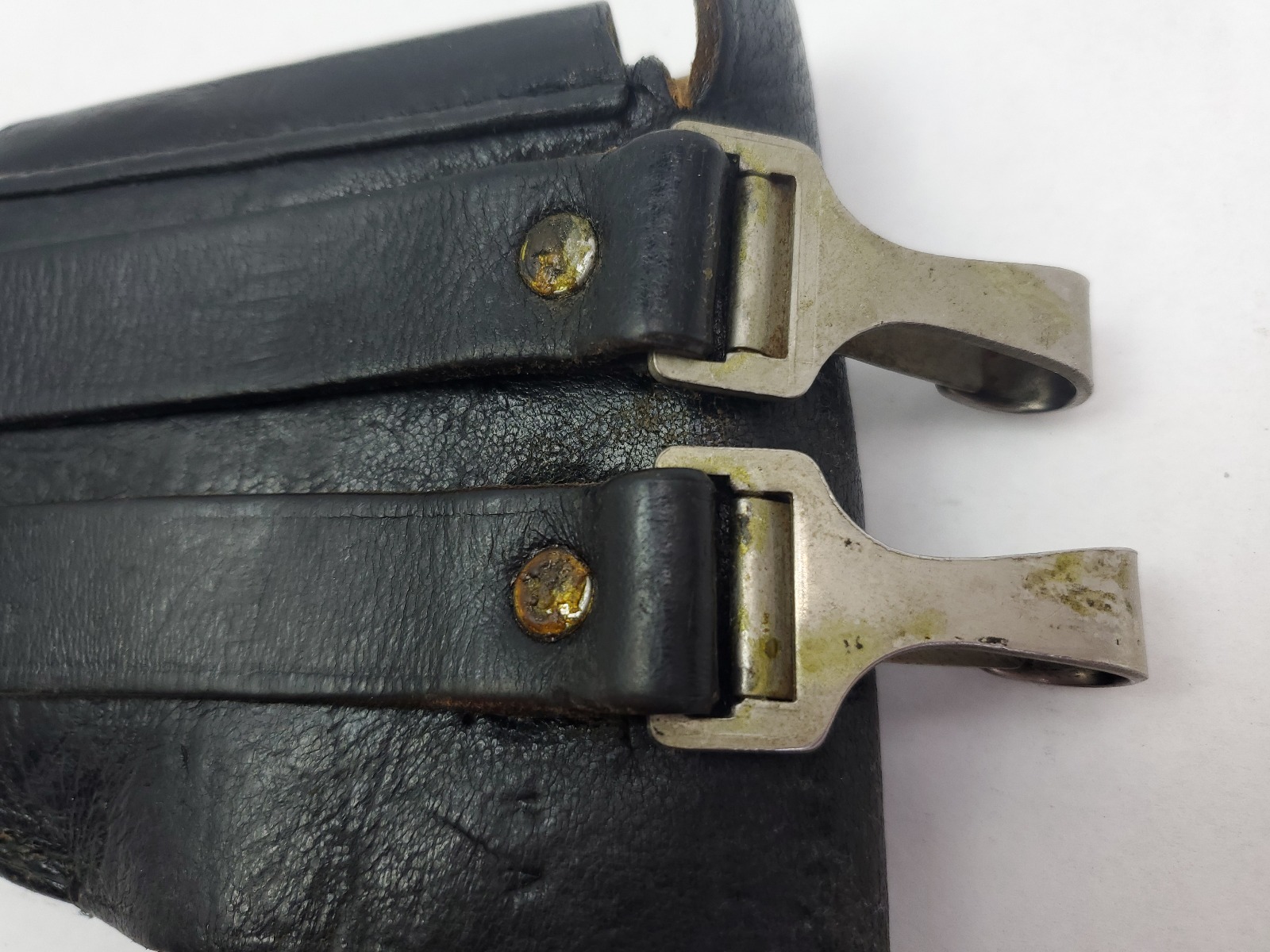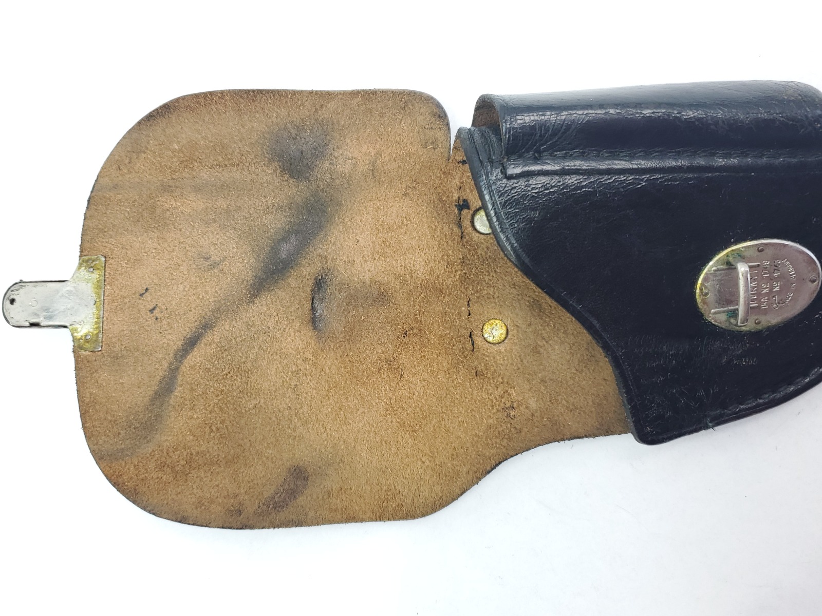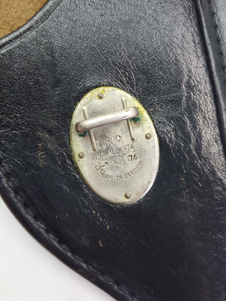 7/1/20 – This is a post WW2 production holster made in Germany for export to the United States. The holster fits a Walther PP, PPK, or similar sized 7.65mm pistol. The holster has two belt loops on the back and two hanger clips. The closure hook is stamped “TURNYT IKA No. 1748 No. 1763 Made in Germany” on the base. Leather and stitching is all original and in tact.