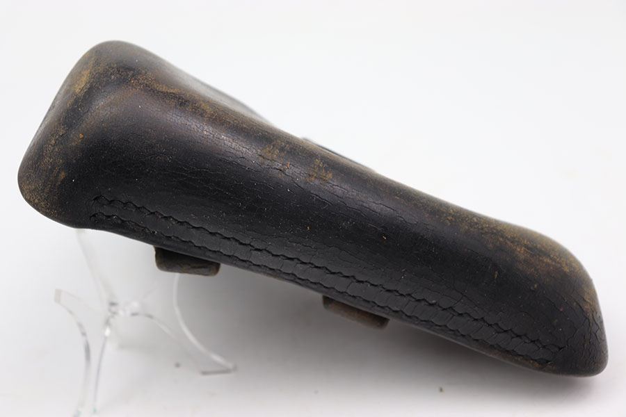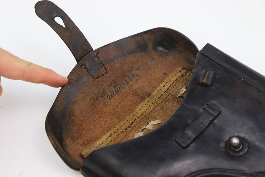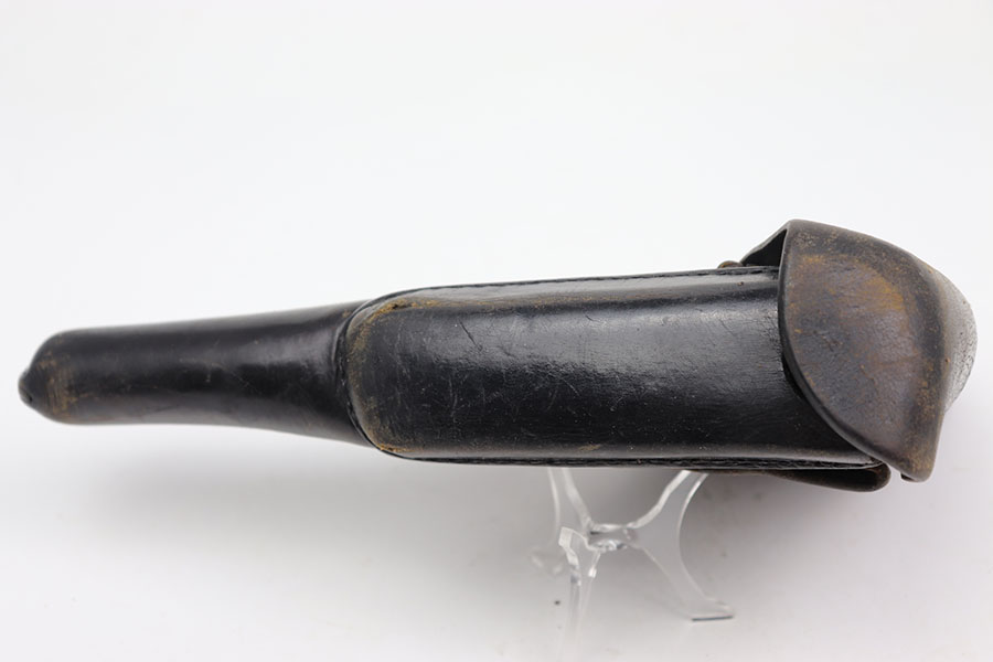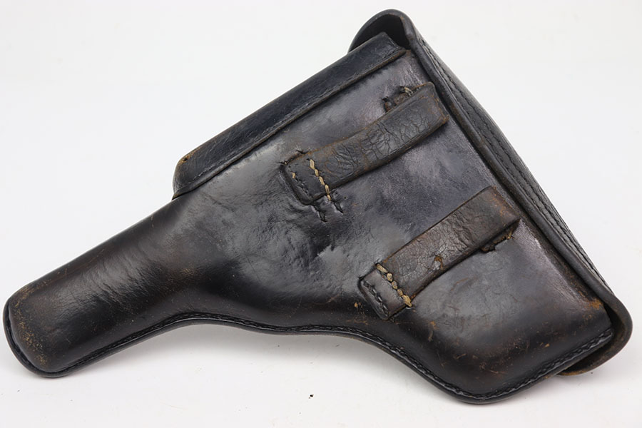 7/31/24 – This is an original Star Model B Holster. This WW2 era holster is in great condition with only some minor wear around the spare magazine pouch, the toe of the holster, and on top of the closure flap. There is a small crack on the spare magazine pouch that goes all the way through the leather. The black leather has some light wrinkling throughout but overall in good+ shape. Great pliability with all its original stitching intact. The inside of the holster is very clean and marked with a 15. This holster should also fit a Astra 600.