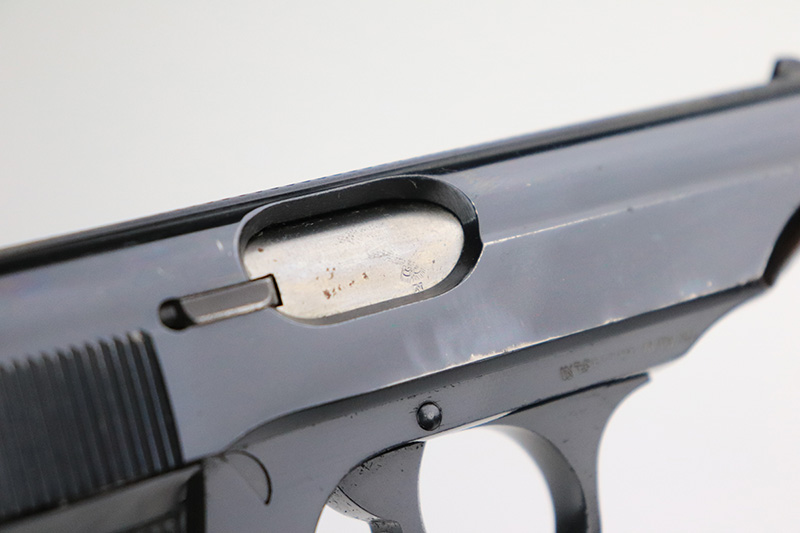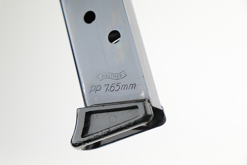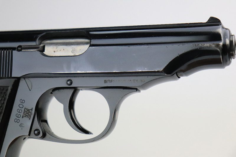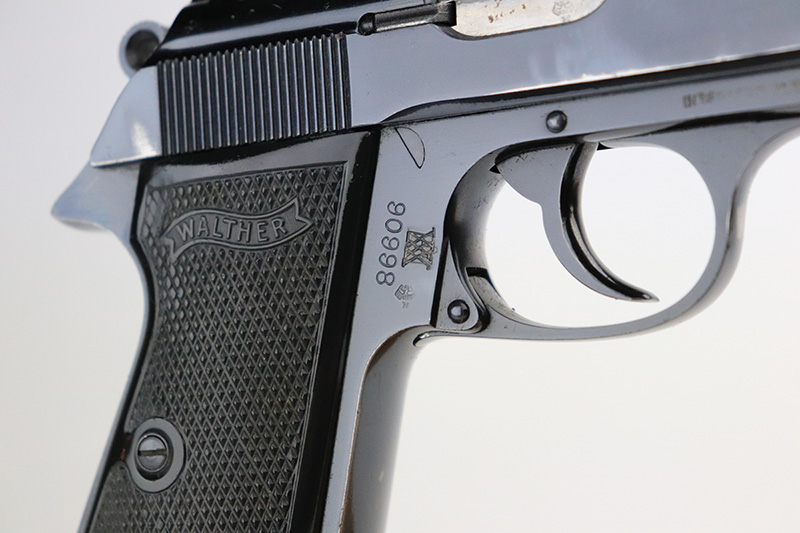 9/23/22 – This is an excellent example of a Walther PP, manufactured in about 1960 and chambered in 7.65mm. It is all matching and has the proper West German proofs. Small import mark on the right side of the frame. There is a marking on the right side of the frame that has been crossed-out. May have been a police unit marking. The gun has retained about 95% of its high polish finish. There is minor muzzle wear and light scratchy wear on both grip straps. Small spot of wear at the back right side of the slide. A few tiny marks along the round edges of the slide. Comes with nice black plastic grips and a proper finger extension magazine – some small dings in the magazine bottom. Minty bore.