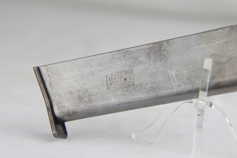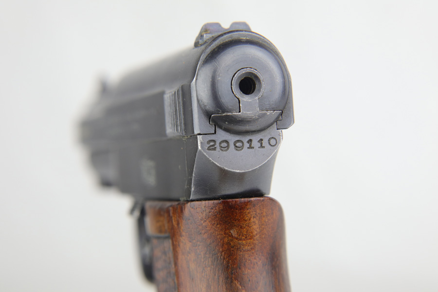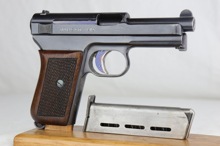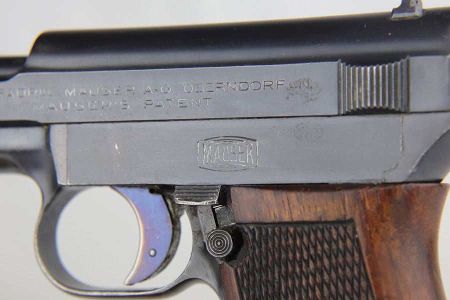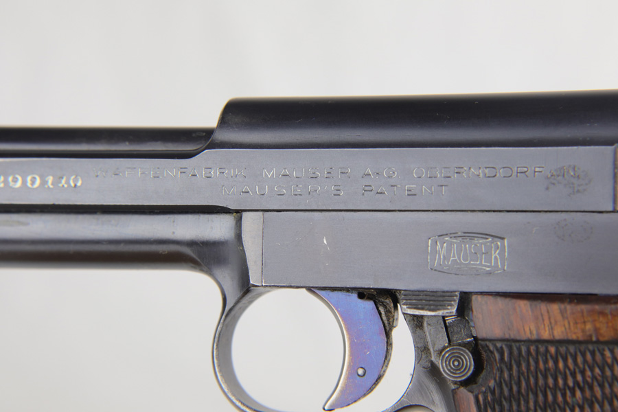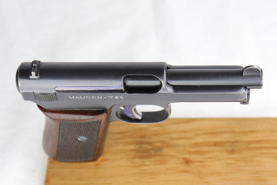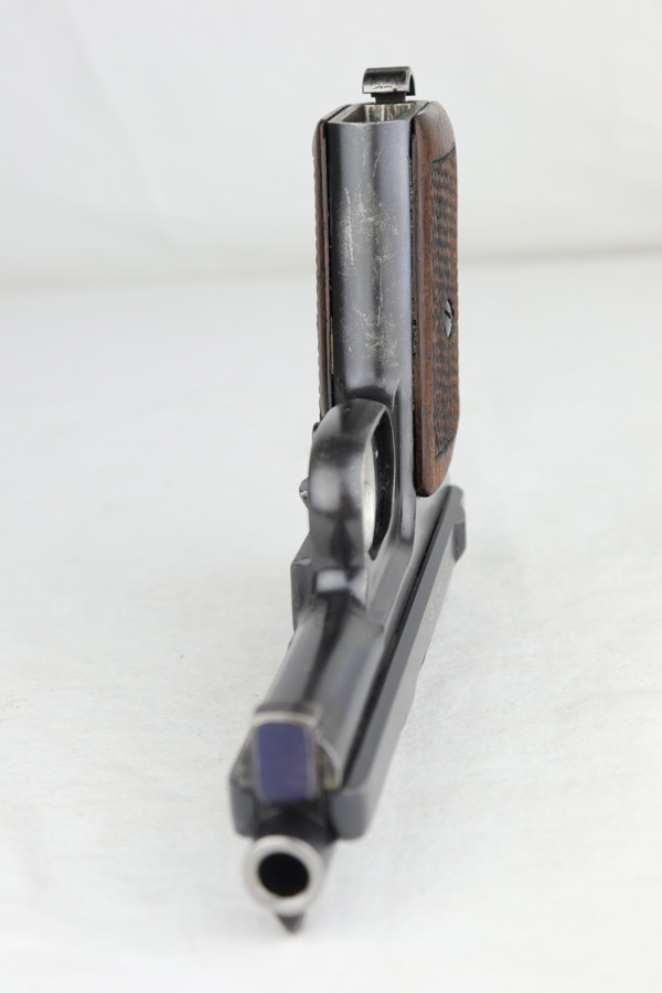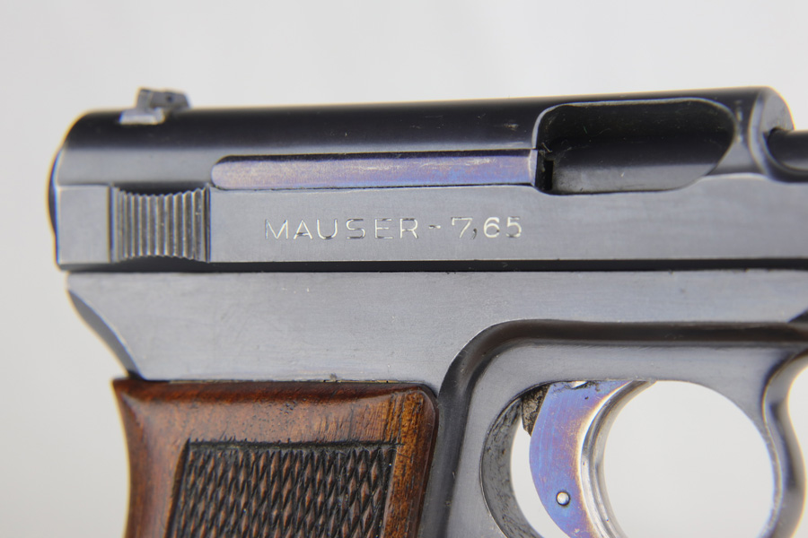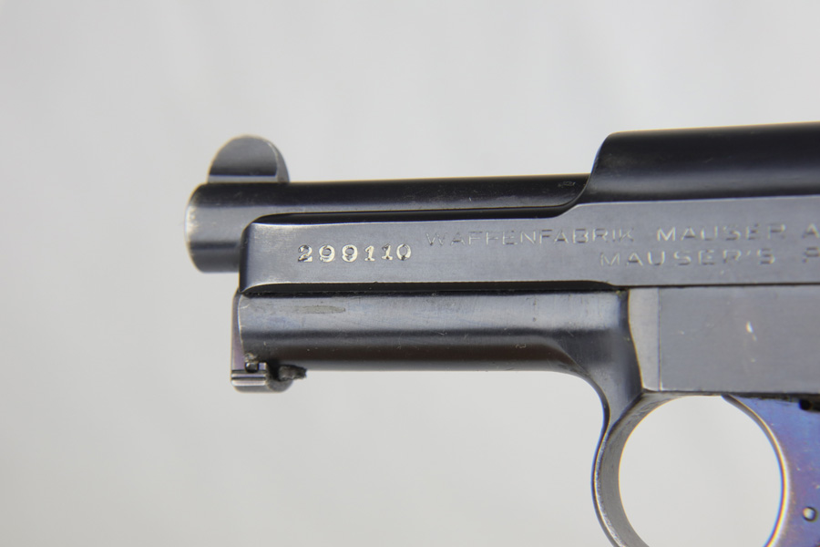 2/6/19 – This is an original Mauser model 1914 pistol. The pistol is in all original condition, 4th variant made shortly after WW1. The pistol is in about 93-94% condition with most of the wear on the front strap. This is typical finish loss, and there’s some normal edge / muzzle wear. All matching and correct with nice grips and an one original magazine. Note the base has a slight bend, but this doesn’t affect functionality. The bore is very nice with minimal patina 9/10 overall. Guaranteed original.