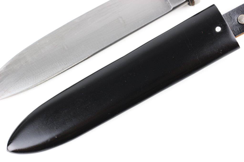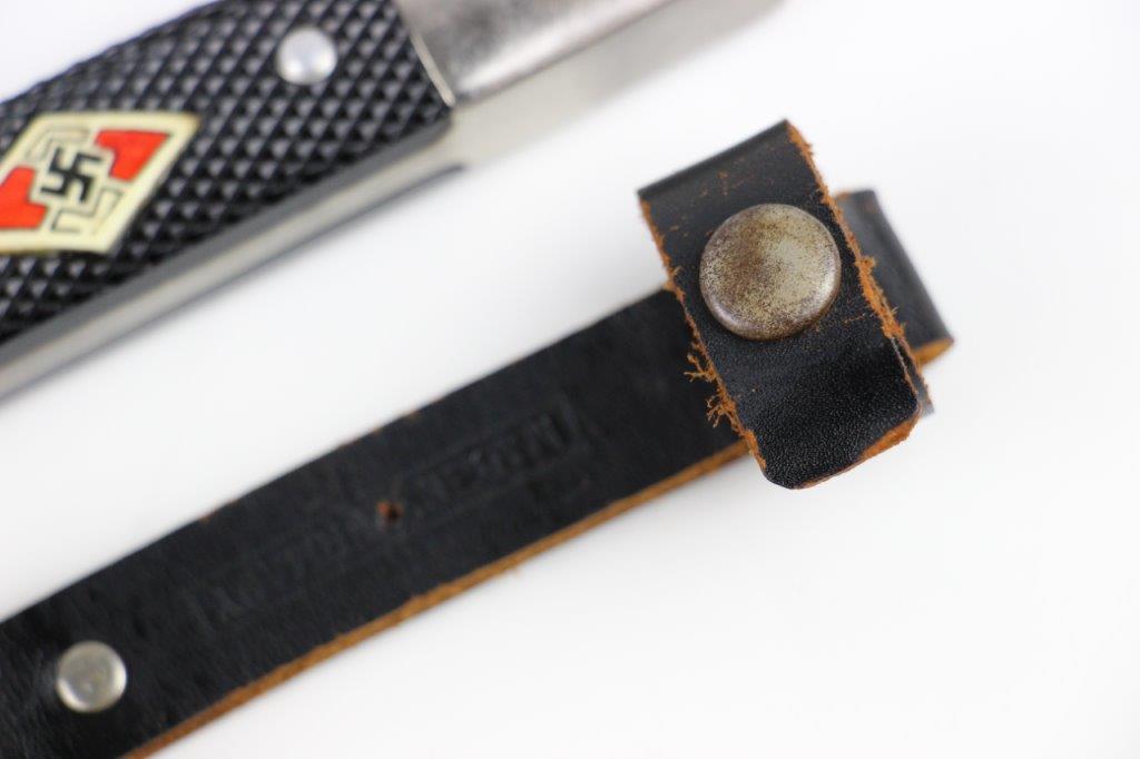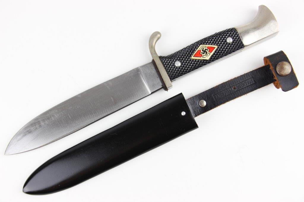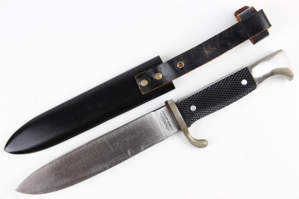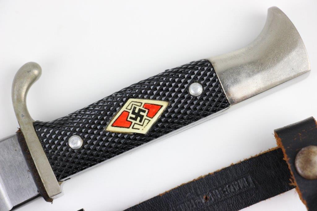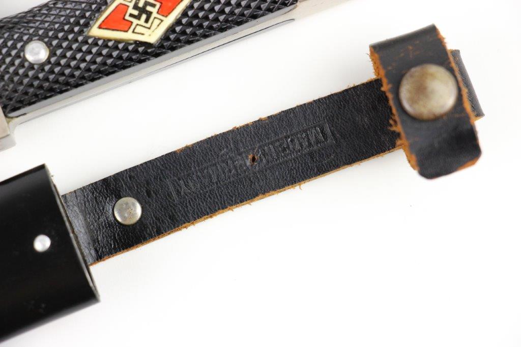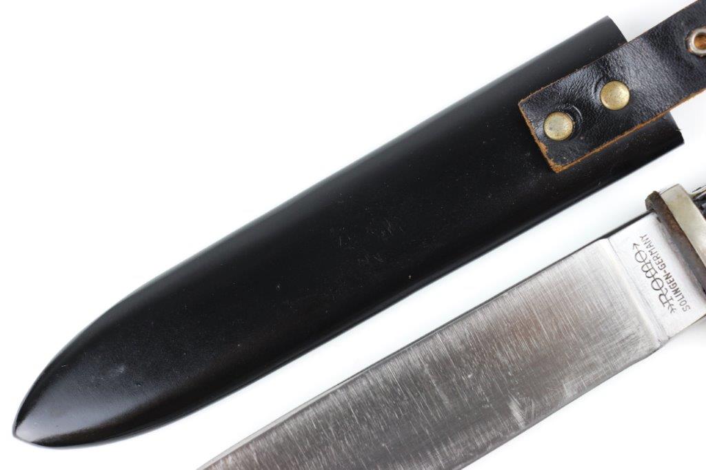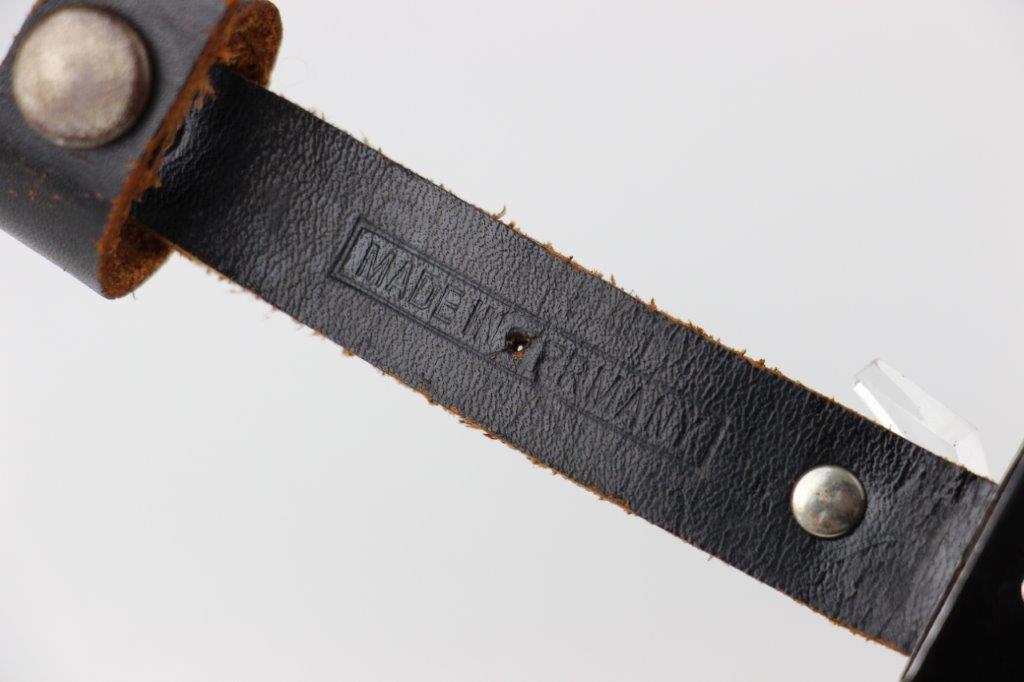 7/15/24 – This is an immediate postwar production Hitler Youth Knife by Romo. There isn’t a lot of information about these daggers, but general consensus we found is that these were made immediately postwar by entrepreneurial Germans using old factory equipment. The blade, handle, and scabbard feels and looks of the same quality as wartime production blades. This example shows clean cross-graining throughout the blade, with some mild surface scratches and scabbard rub wear. The ricasso is maker stamped on one side, “ROMO Solingen-Germany”. This “Germany” portion of the maker marking indicates these were made with the intention of export. The base of the blade retains a leather stopper, and the hooked hand guard shows light surface patina. Excellent diamond pattern on each grip panel, with one panel having a Hitler Youth emblem (although this is not the same style as the WW2 Hitler Youth emblems). Mild patina on the pommel as well. Comes with a mint condition scabbard and leather frog, which is stamped “MADE IN GERMANY”.