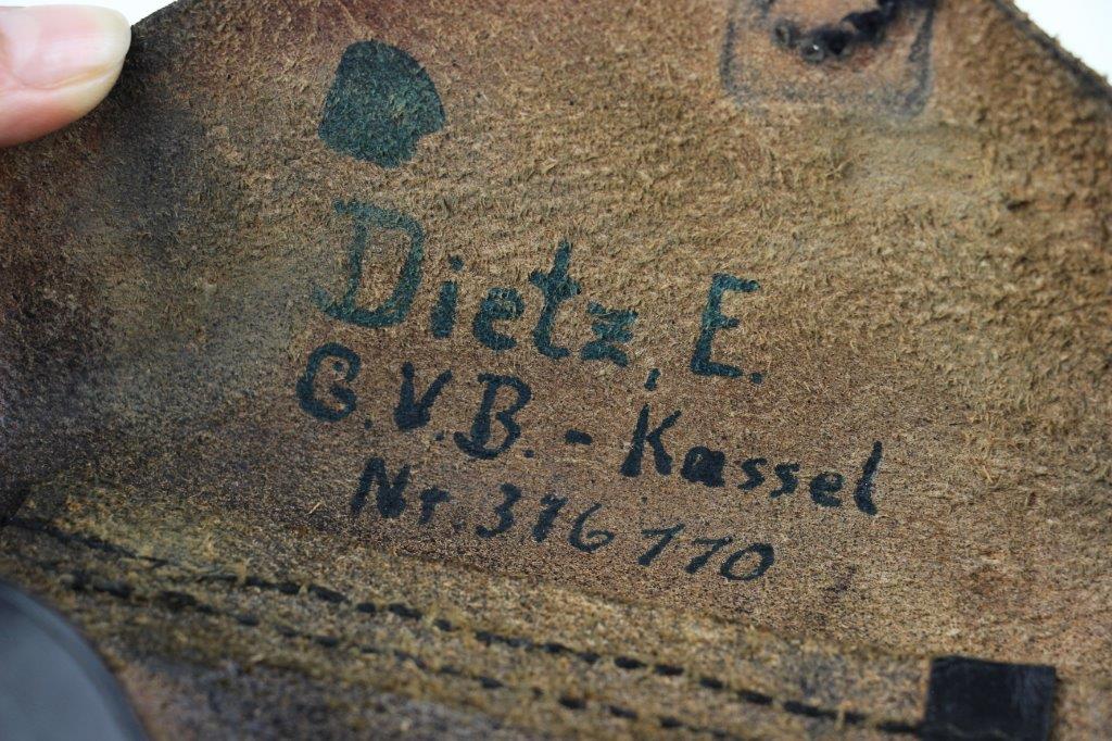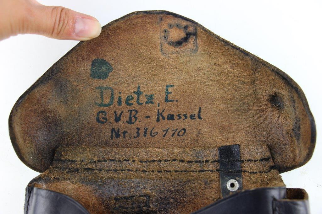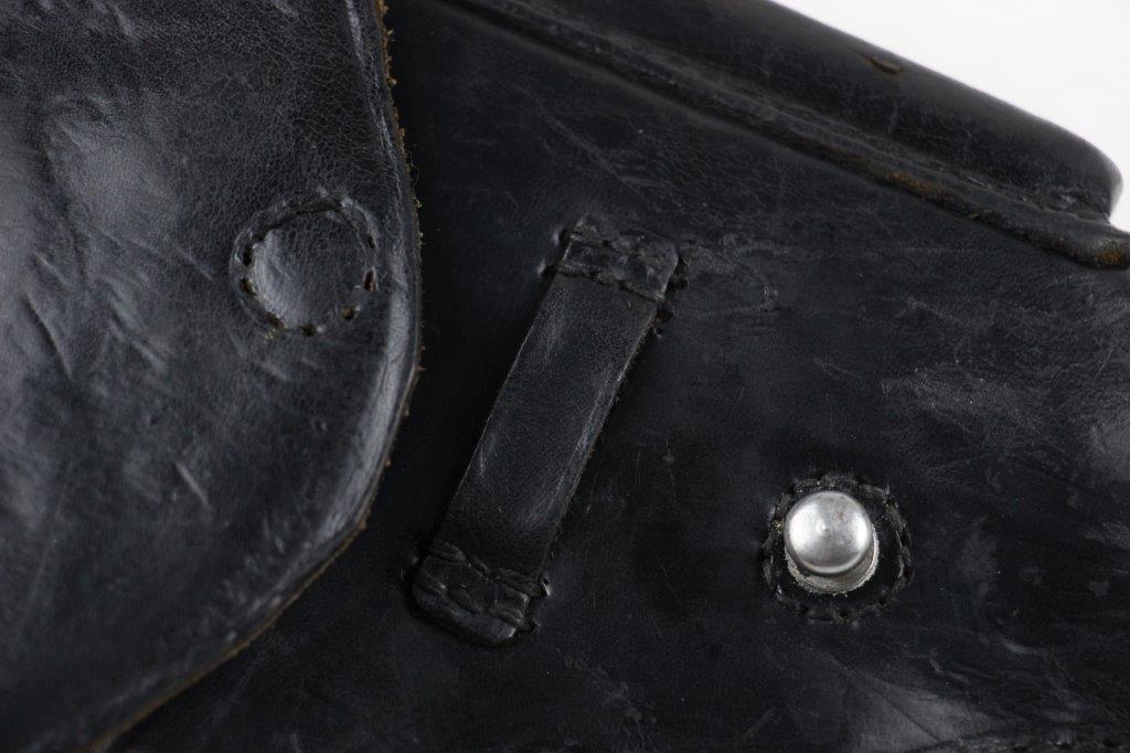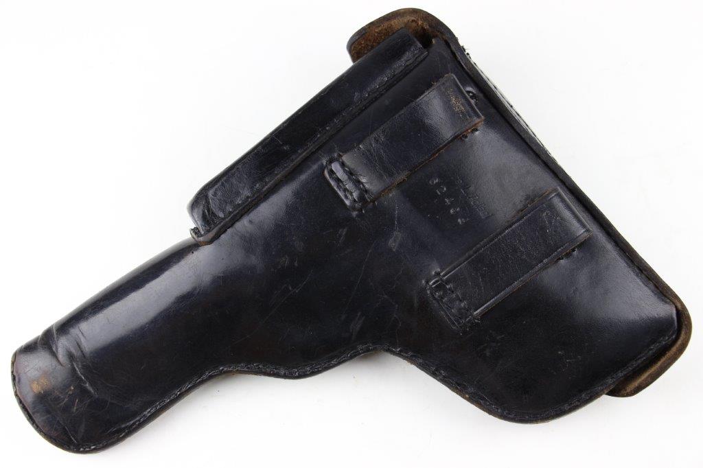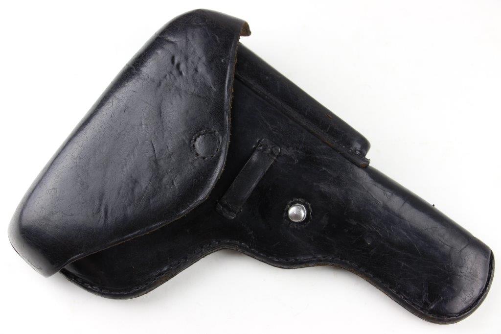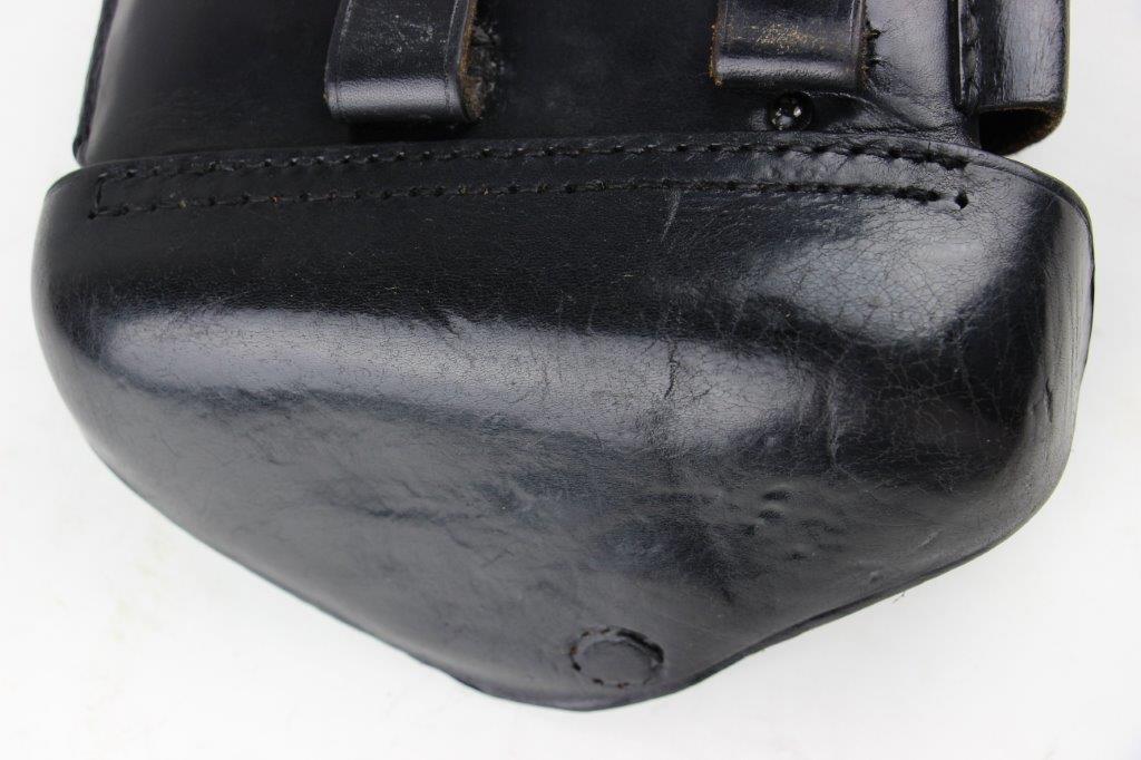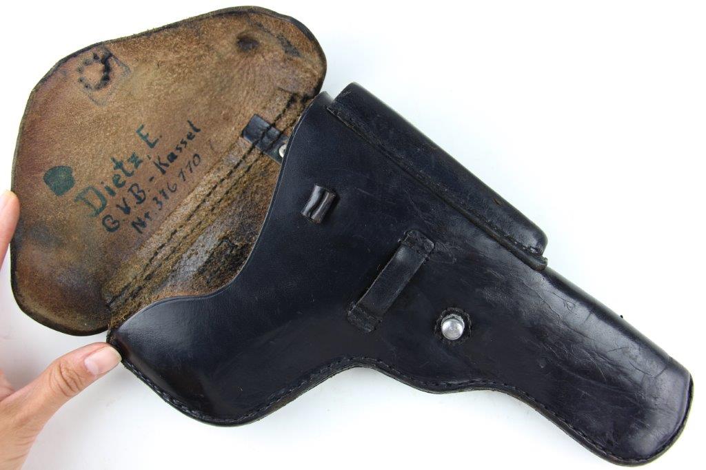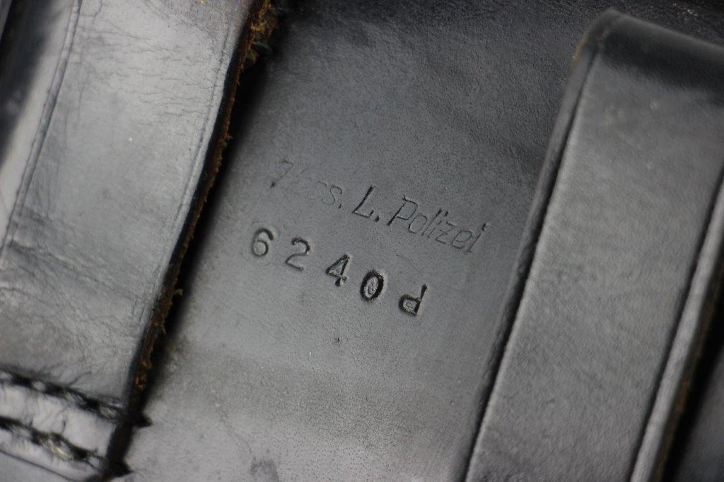 7/31/24 – This is a post-WW2 production P.38 Police / Walther P1 pistol holster. The holster is in great condition overall, but missing the front closure strap. Still remains closed on its own and has all original black leather and matching black stitching. Stamped on the back leather “Hess. L. Polizei 6240d”. A name and serial number is written on the interior leather. Normal pliability and light use wear.