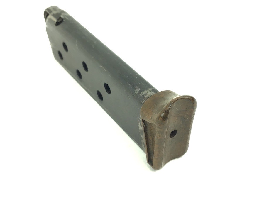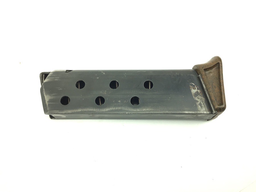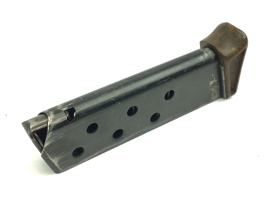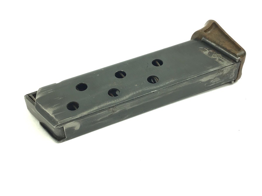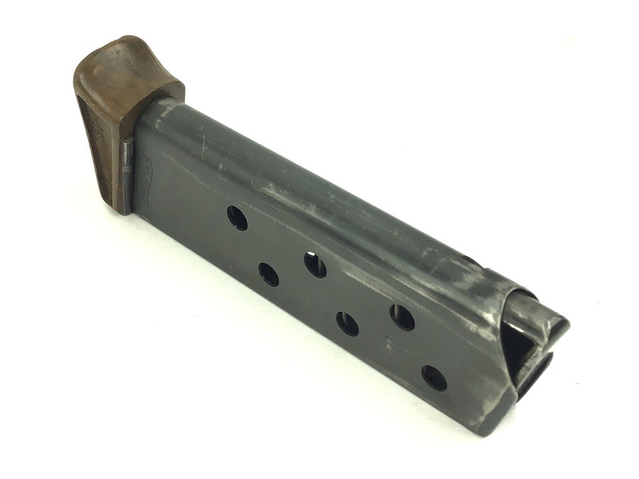 11/16/22 – This is a great, early / pre WW2 manufactured Walther PPK magazine. The magazine has a high polish finish with a Walther banner stamped on one side. Minor finish loss. The brown bakelite finger extension has excellent color with no chips or cracks. This is the early thin-lip style. Fully functional, strong spring.