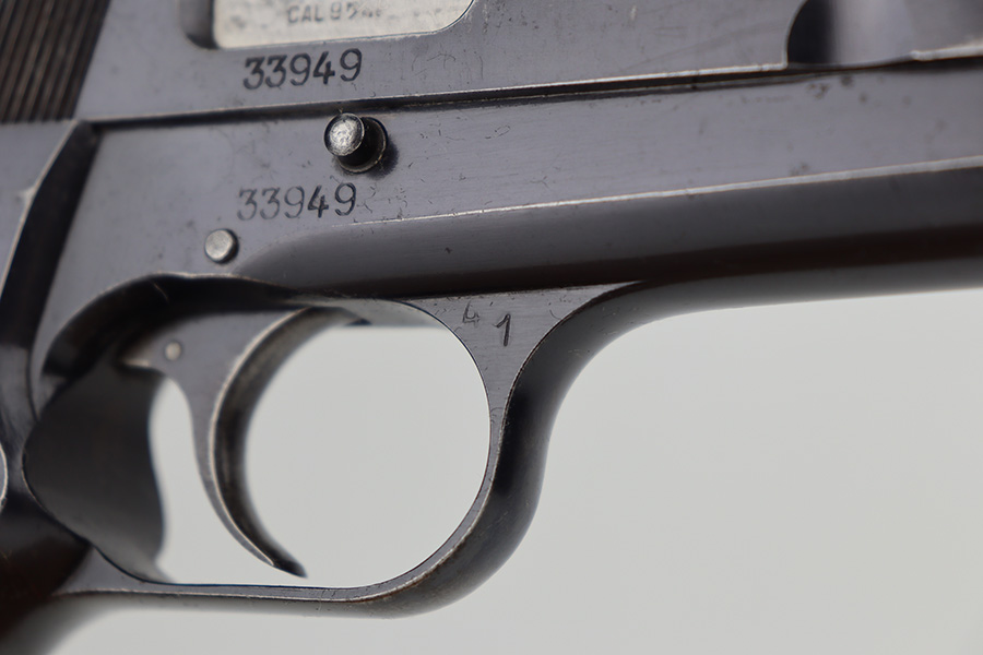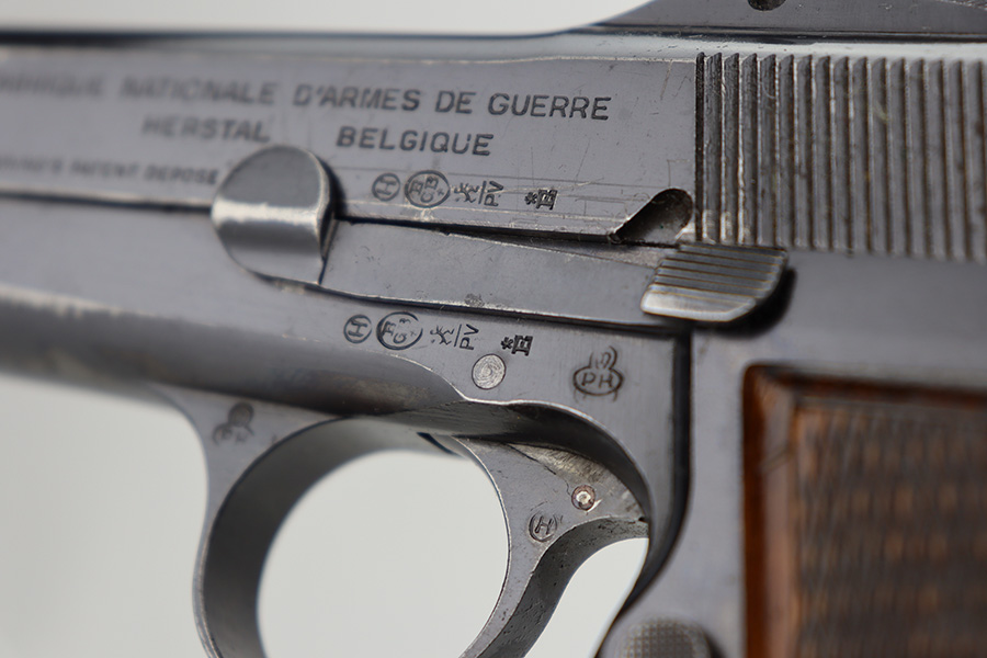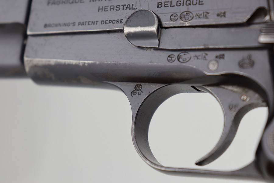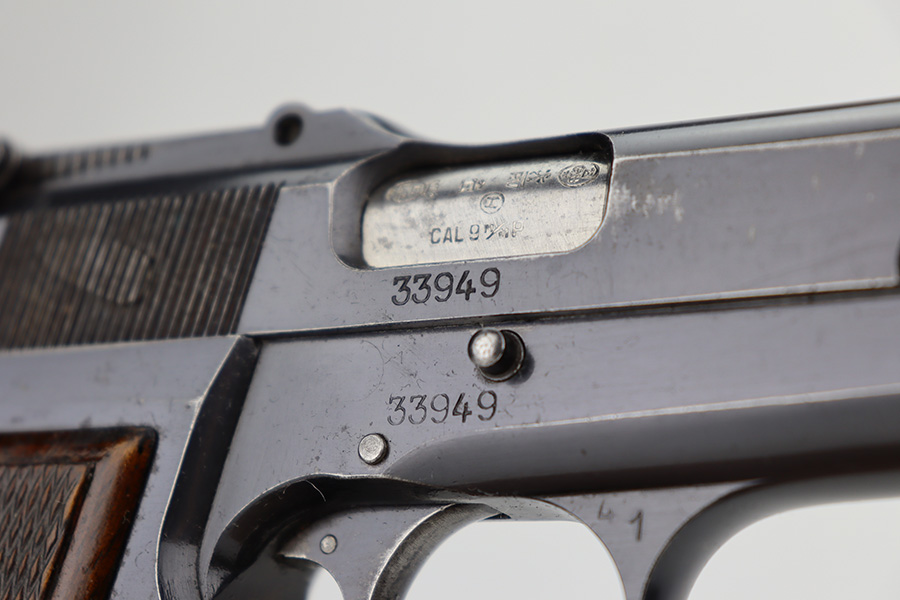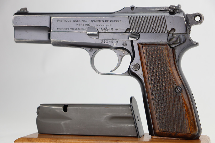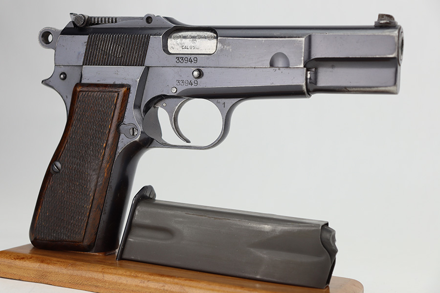 12/27/23 – This is a nice example of a Pre-WW2 Belgian FN Browning High Power. Correct early features – slotted frame with tangent rear sight. All matching with the proper Belgian proofs. The original high polish finish rates about 93% with general high edge wear and some dulling with light brown patina on the grip straps. Fitted with period-correct wood grips and comes with a proper magazine. The bore has good rifling with minor frosting in the grooves.