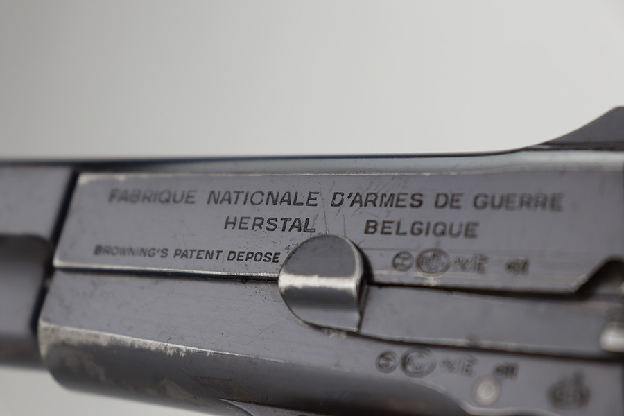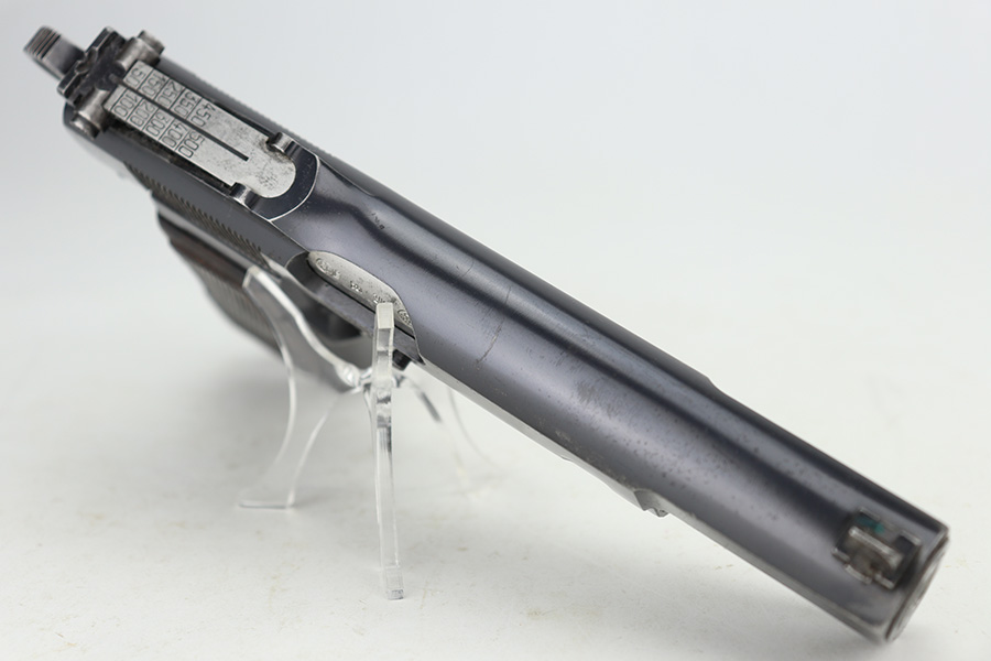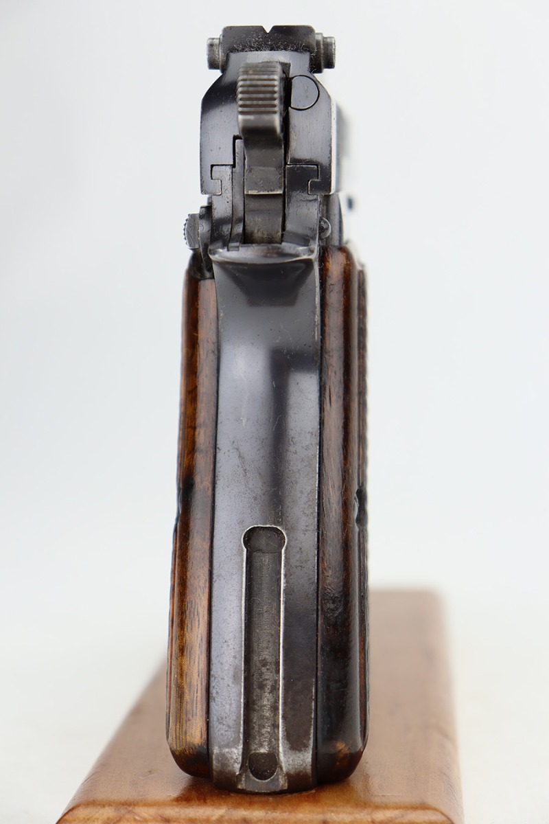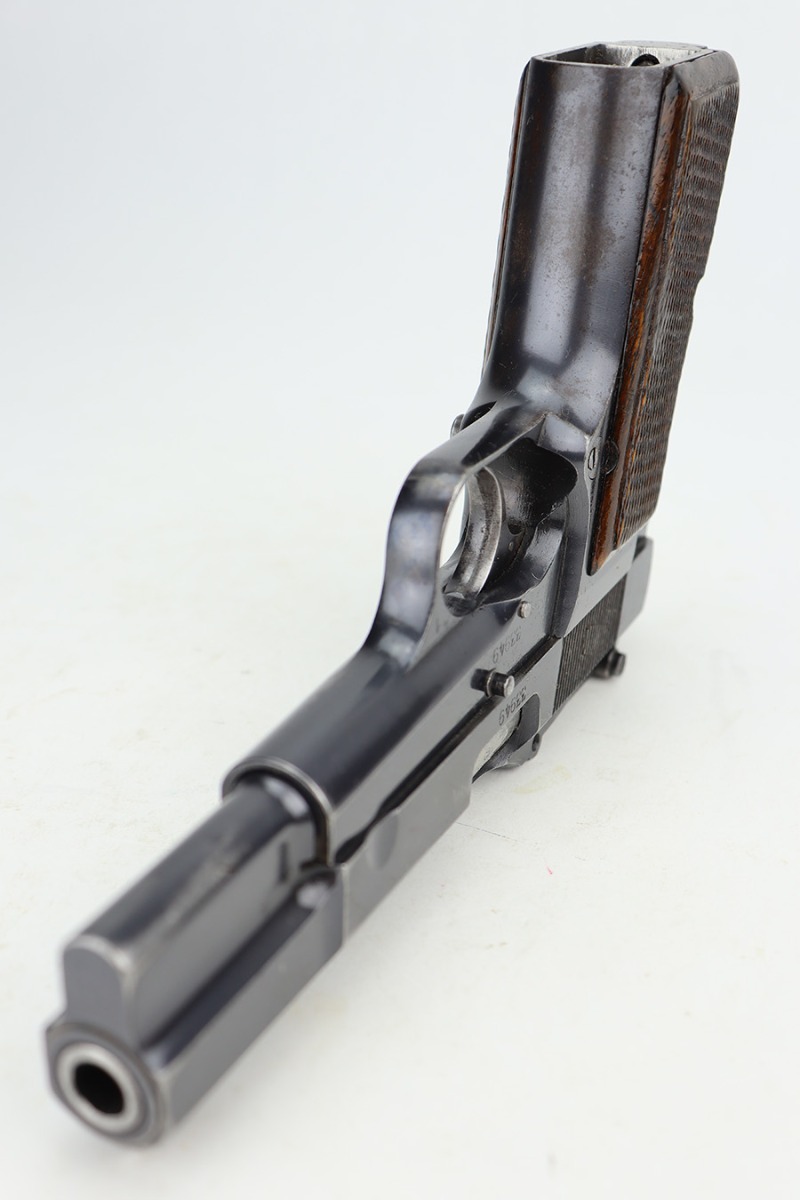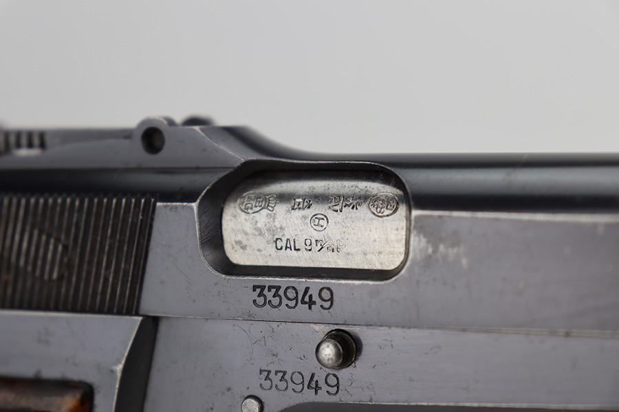 12/27/23 – This is a nice example of a Pre-WW2 Belgian FN Browning High Power. Correct early features – slotted frame with tangent rear sight. All matching with the proper Belgian proofs. The original high polish finish rates about 93% with general high edge wear and some dulling with light brown patina on the grip straps. Fitted with period-correct wood grips and comes with a proper magazine. The bore has good rifling with minor frosting in the grooves.