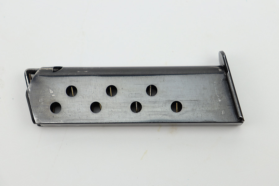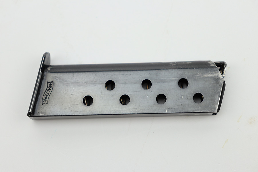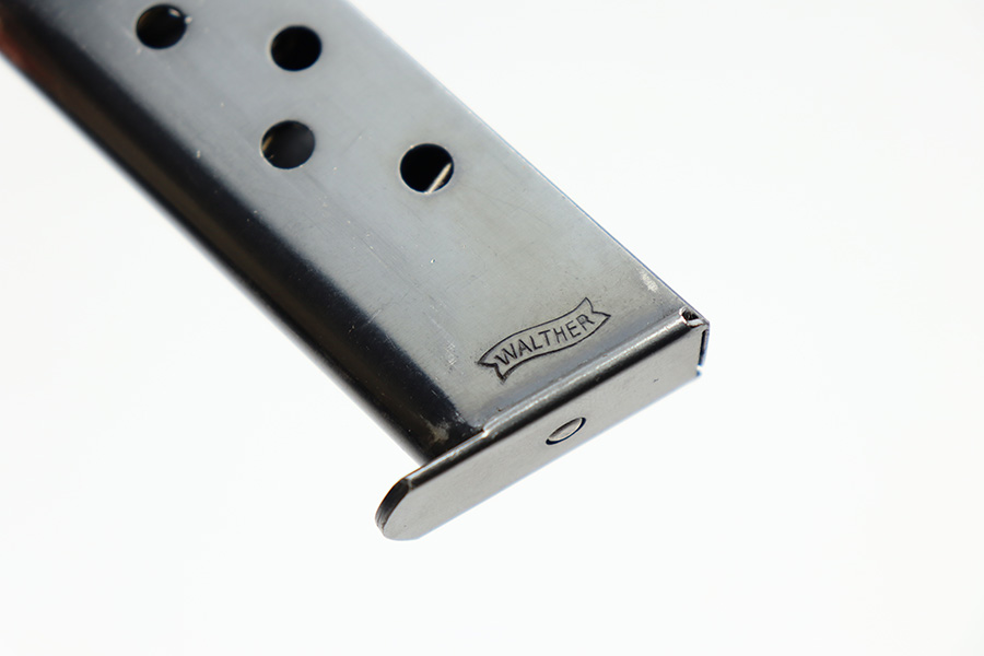 11/10/23 – This is an excellent Pre-WW2 Walther PP magazine with a Walther banner marking only. Flat bottom. Early high-polish finish. Excellent bluing with only a few small spots of minor wear. Fully functional with great spring.