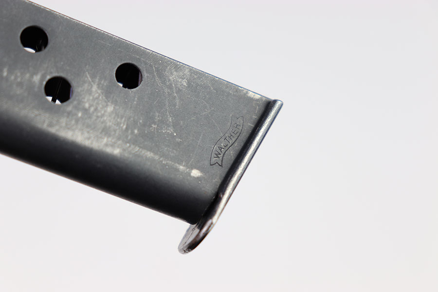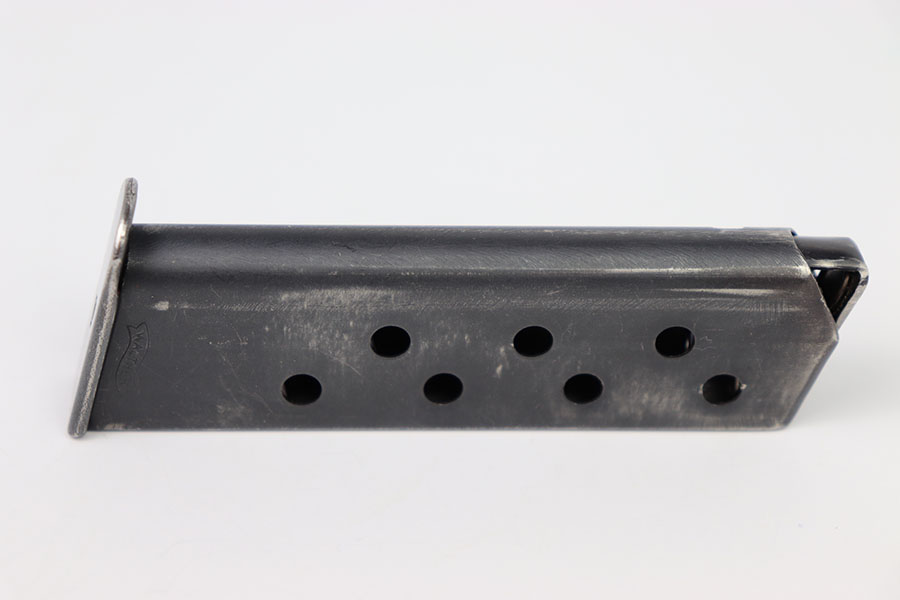 2/7/24 – This is a great Pre-WW2 Walther PP magazine with a Walther banner marking only. Original bluing is in great condition with most its wear on the right side, spine, and front edge of the magazine. There is no rust or pitting. The flat bottom base is high polish and in minty condition. The spring is strong and fully functional.
