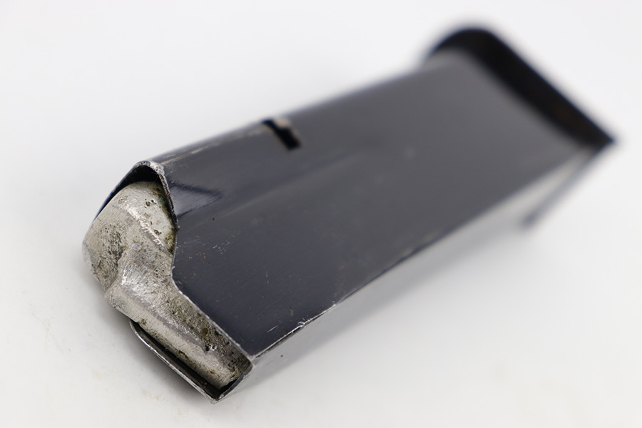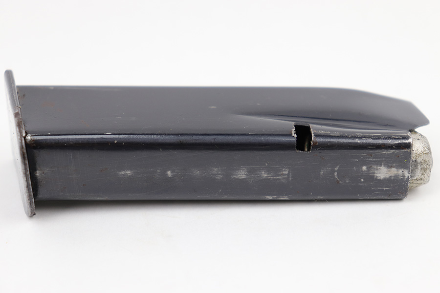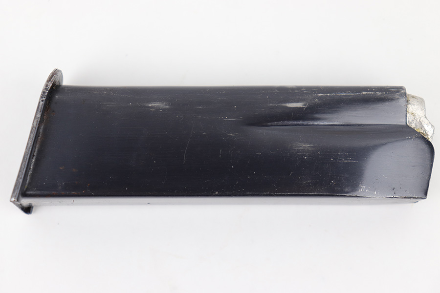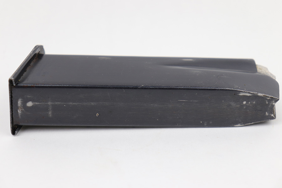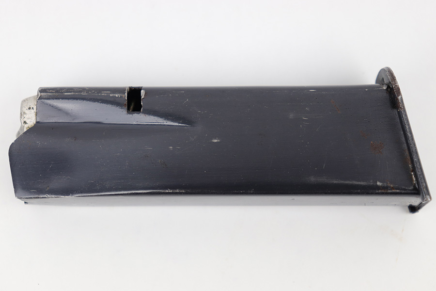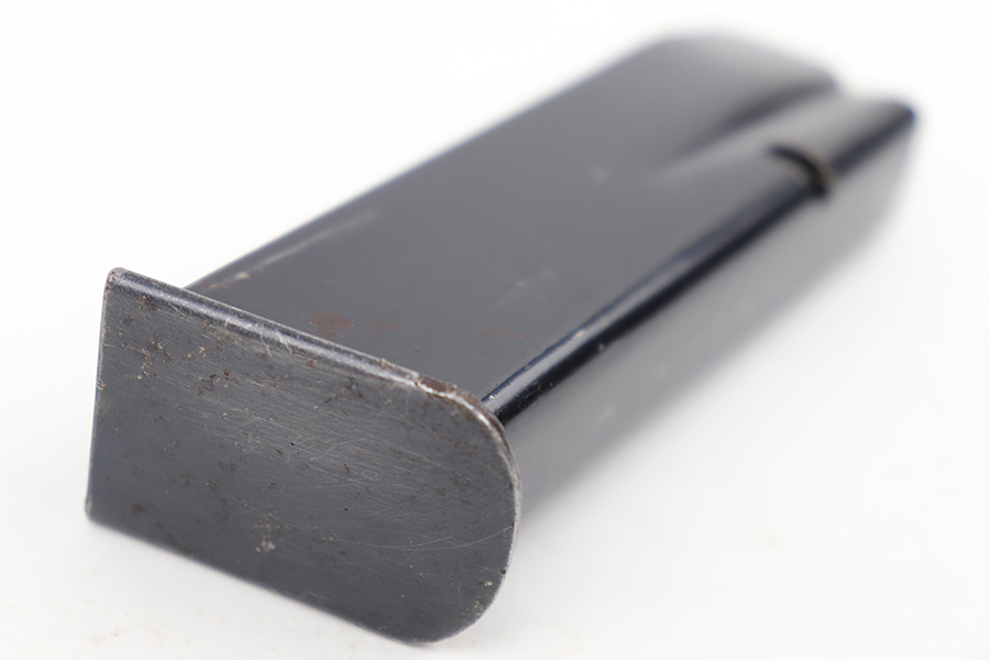 4/6/23 – This is a pre WW2 commercial High Power magazine. The magazine has a high polish blued finish that’s in great overall condition with some mild finish loss and spots of surface patina on the tube and base. Aluminum follower and fully functional spring.