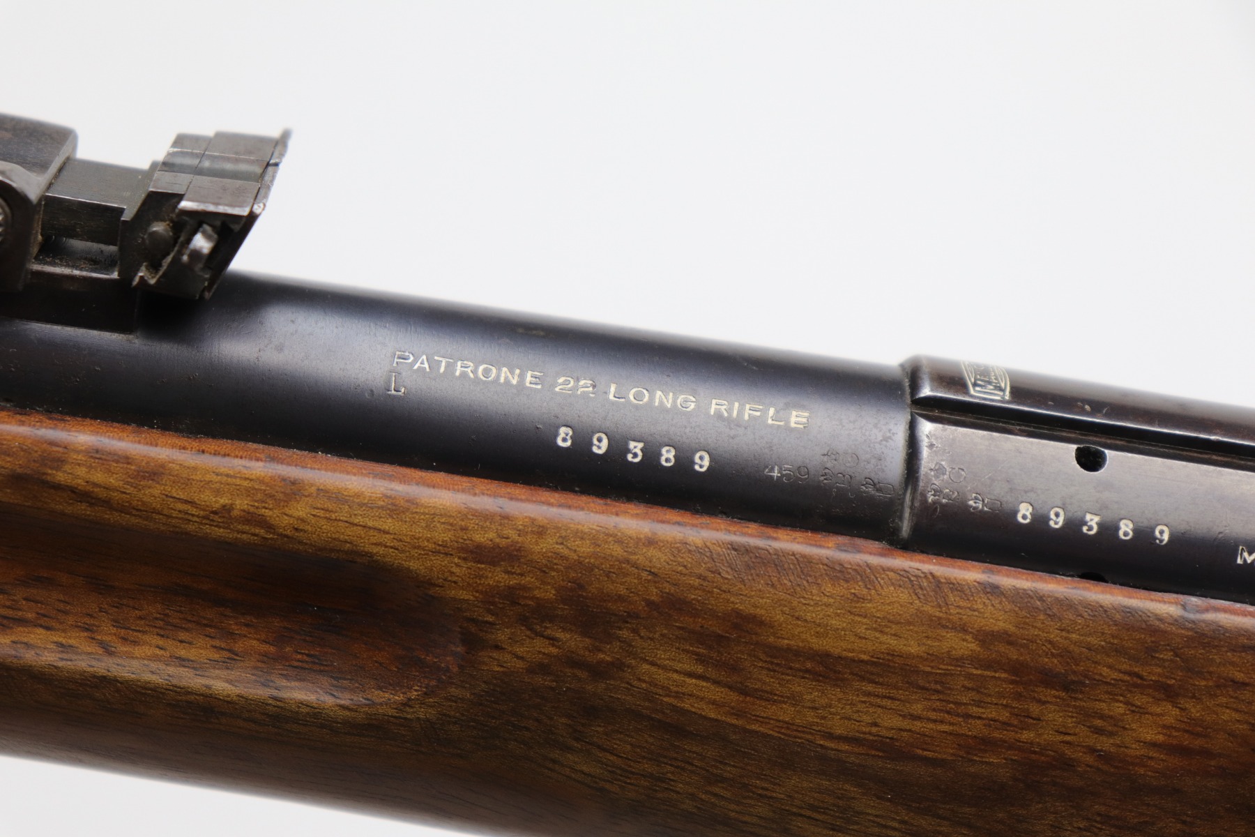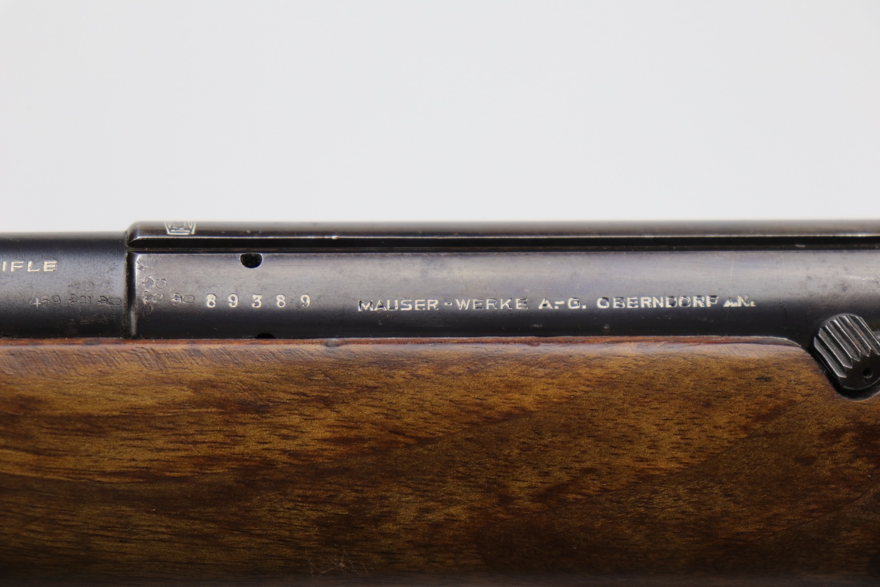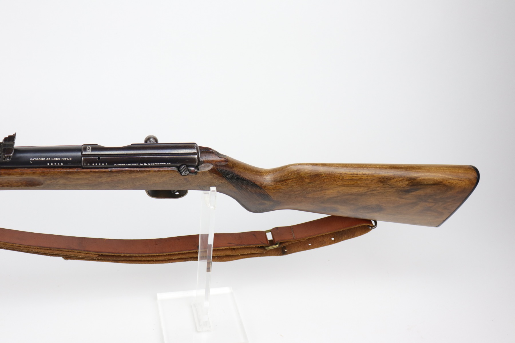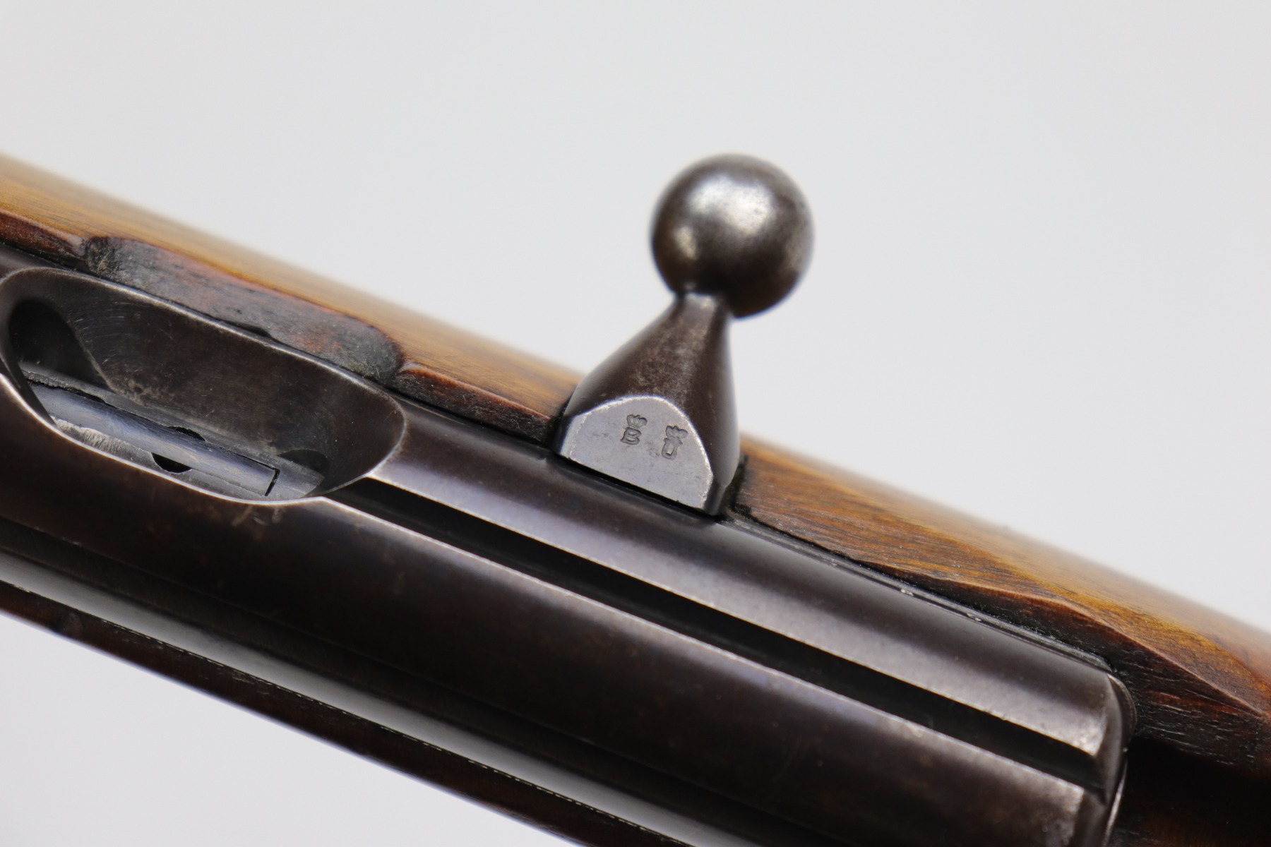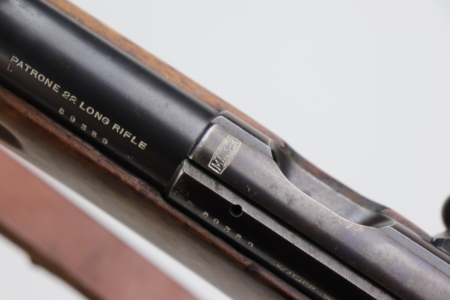 10/13/20 – This is an original Mauser Training Bolt Action Rifle, chambered in .22LR. It was made some time before WW2. It is all matching and has “Crown U” and “Crown B” proofs. It also has a brass trigger guard assembly. Overall, it has retained most of its original bluing. There is minor muzzle wear, a few spots of wear on the barrel, and some high edge wear on the receiver. There are small dots of oxidation along the barrel. The barrel also has a few handling marks. There is some brown patina showing through on the receiver where there is also some light freckling. The stock is hand-checker and excellent. It appears original but was likely lightly sanded. The bore is shiny and mint. The gun comes with a post-war leather sling.