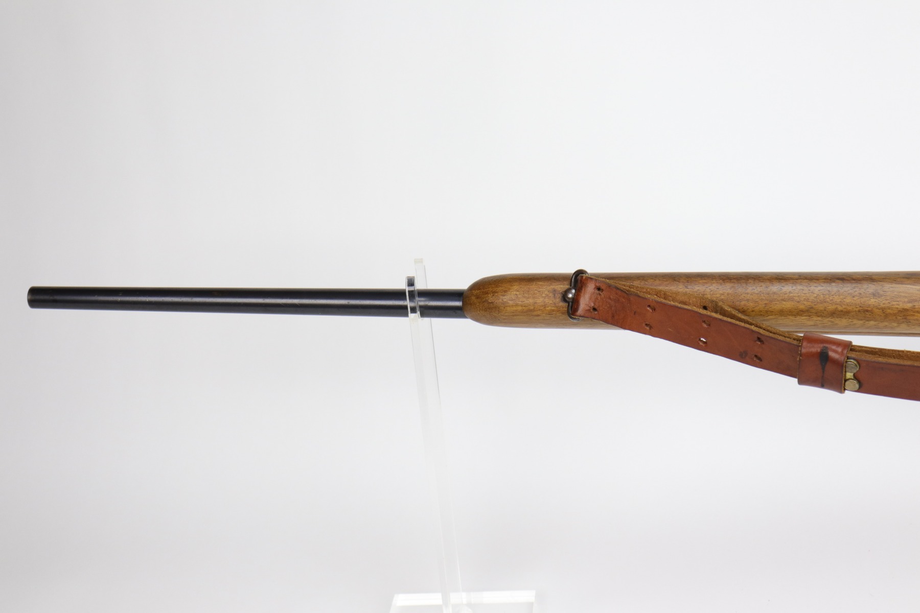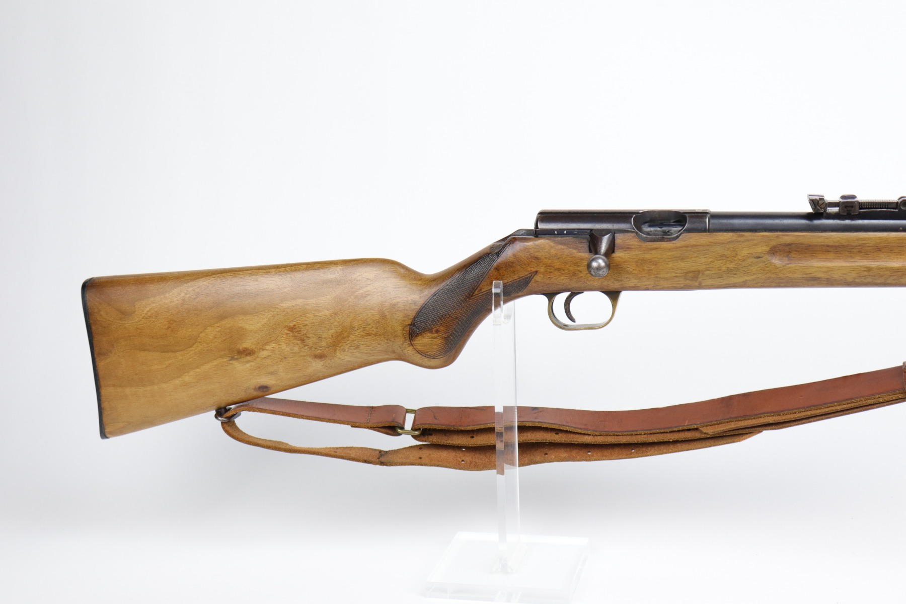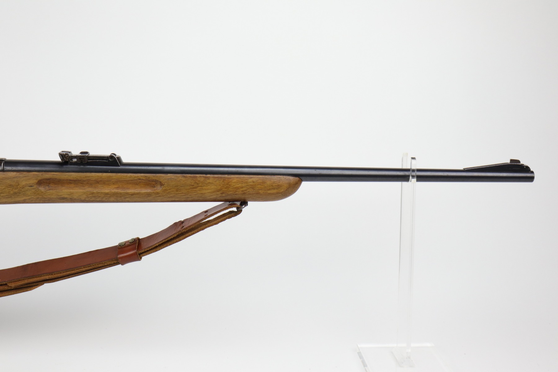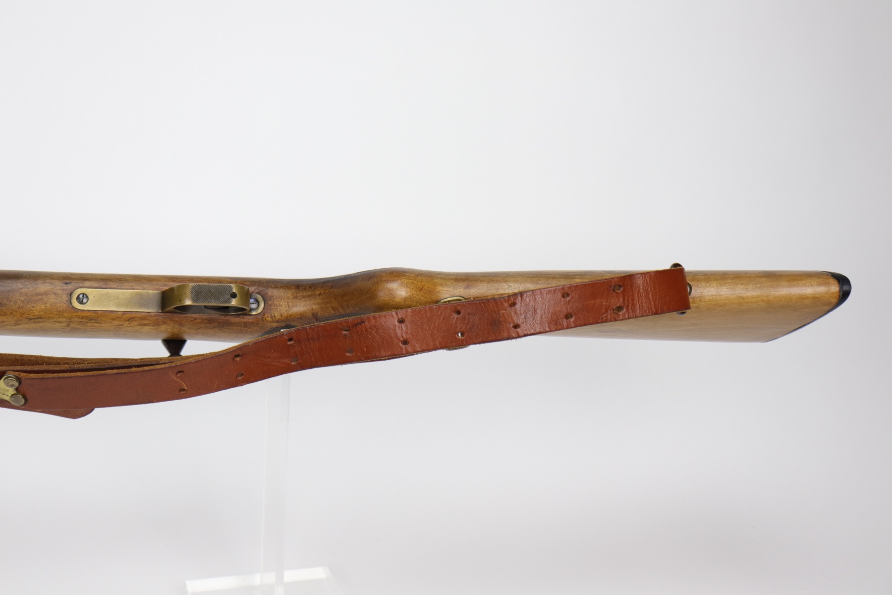 10/13/20 – This is an original Mauser Training Bolt Action Rifle, chambered in .22LR. It was made some time before WW2. It is all matching and has “Crown U” and “Crown B” proofs. It also has a brass trigger guard assembly. Overall, it has retained most of its original bluing. There is minor muzzle wear, a few spots of wear on the barrel, and some high edge wear on the receiver. There are small dots of oxidation along the barrel. The barrel also has a few handling marks. There is some brown patina showing through on the receiver where there is also some light freckling. The stock is hand-checker and excellent. It appears original but was likely lightly sanded. The bore is shiny and mint. The gun comes with a post-war leather sling.