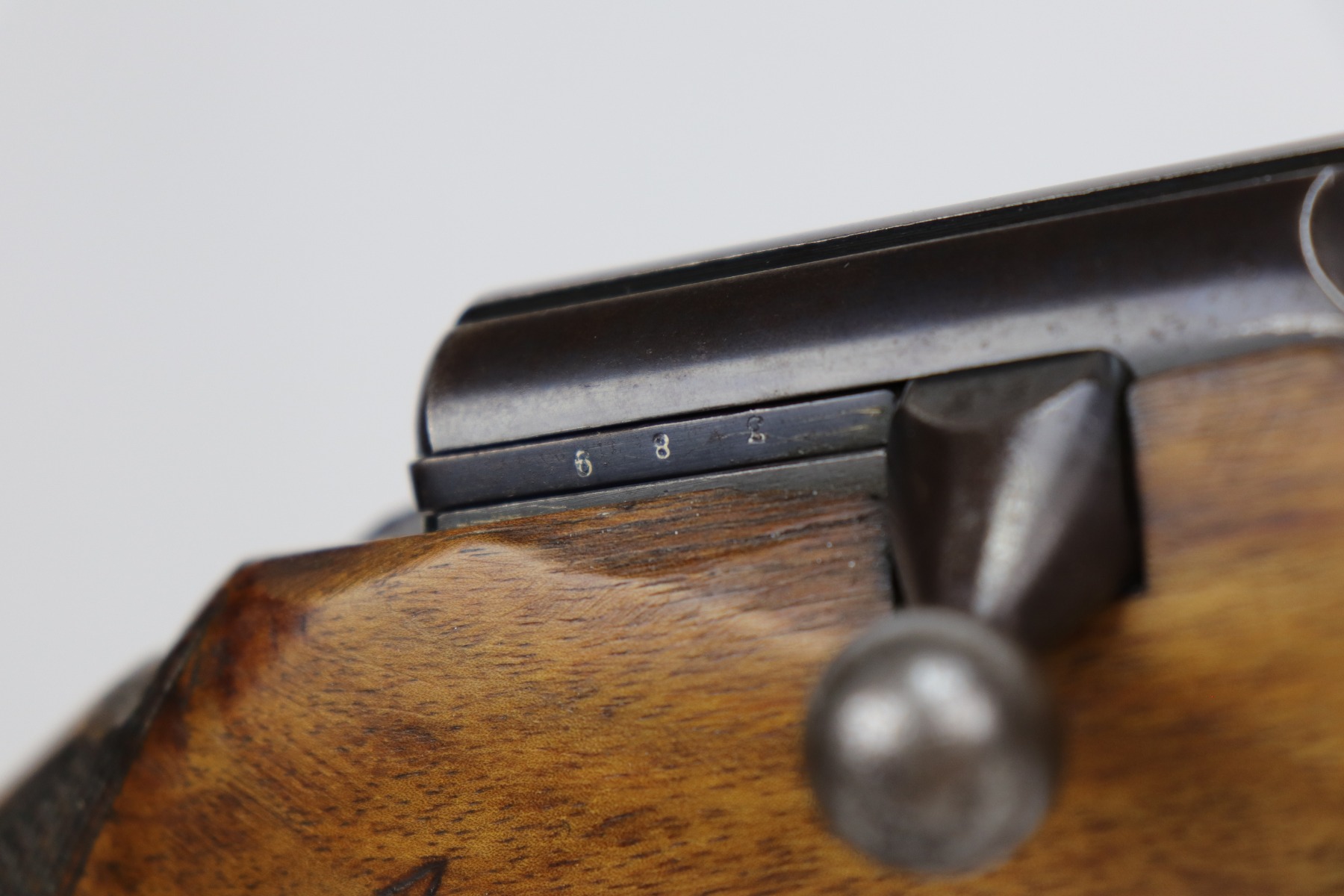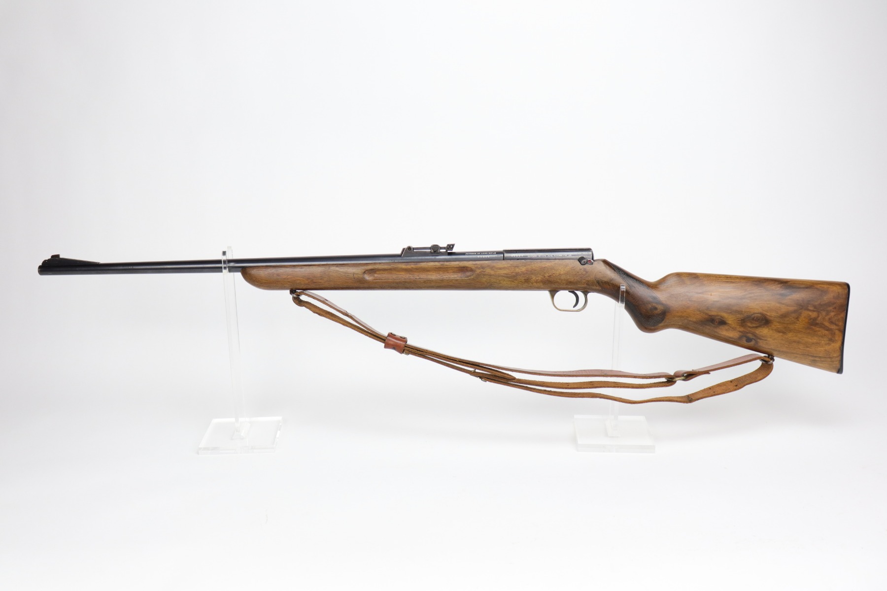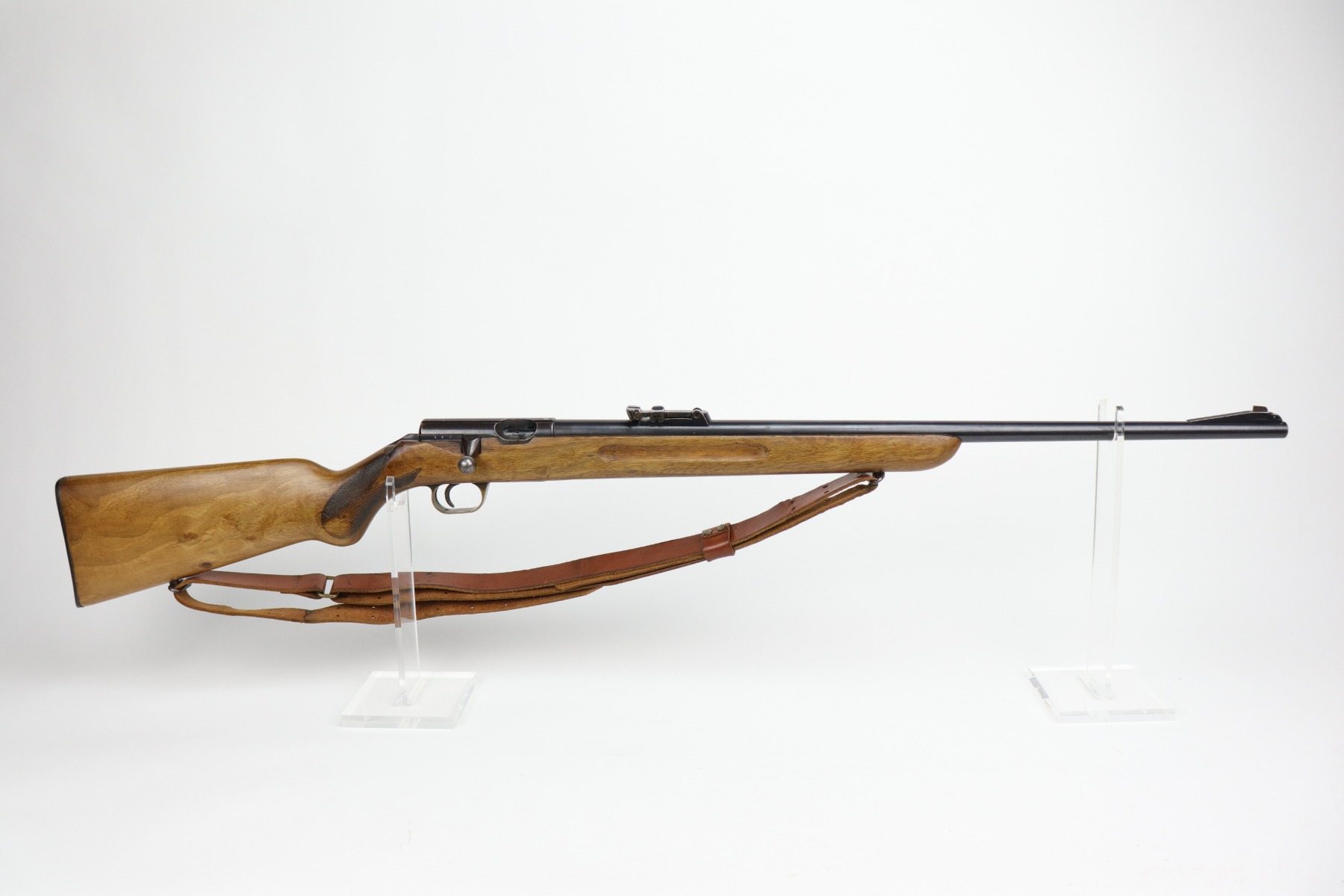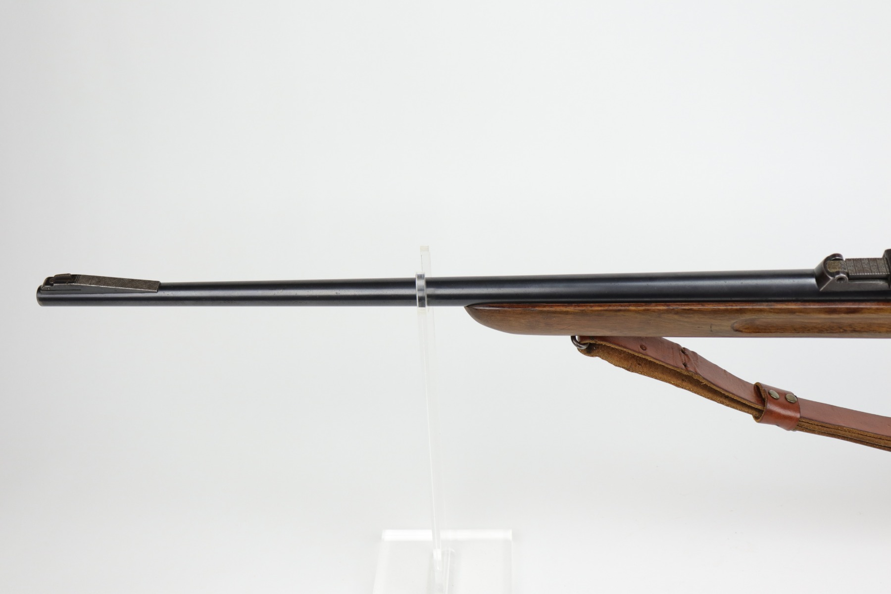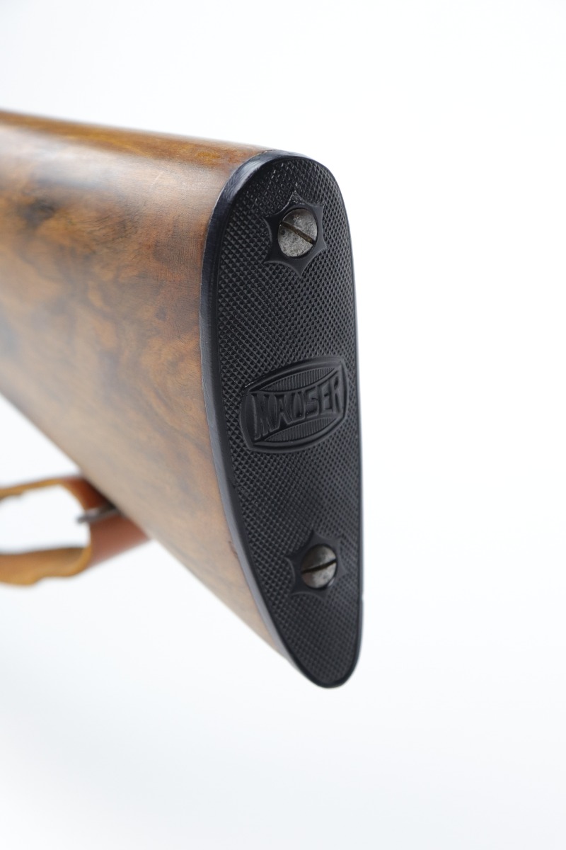 10/13/20 – This is an original Mauser Training Bolt Action Rifle, chambered in .22LR. It was made some time before WW2. It is all matching and has “Crown U” and “Crown B” proofs. It also has a brass trigger guard assembly. Overall, it has retained most of its original bluing. There is minor muzzle wear, a few spots of wear on the barrel, and some high edge wear on the receiver. There are small dots of oxidation along the barrel. The barrel also has a few handling marks. There is some brown patina showing through on the receiver where there is also some light freckling. The stock is hand-checker and excellent. It appears original but was likely lightly sanded. The bore is shiny and mint. The gun comes with a post-war leather sling.