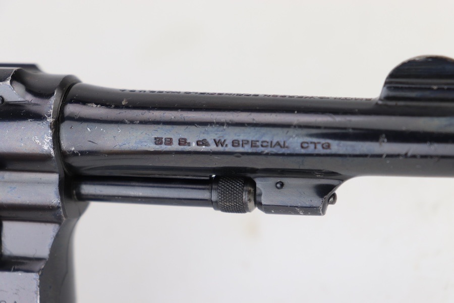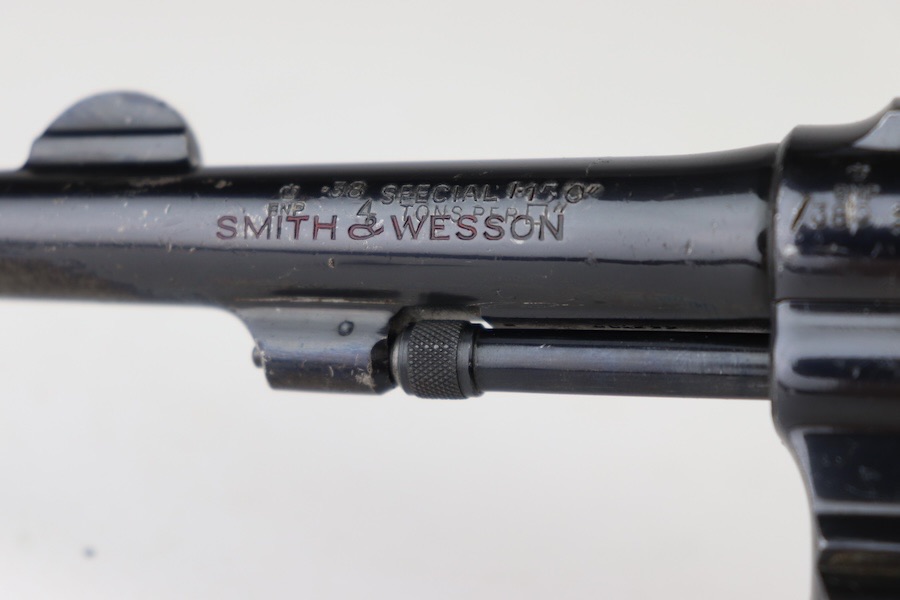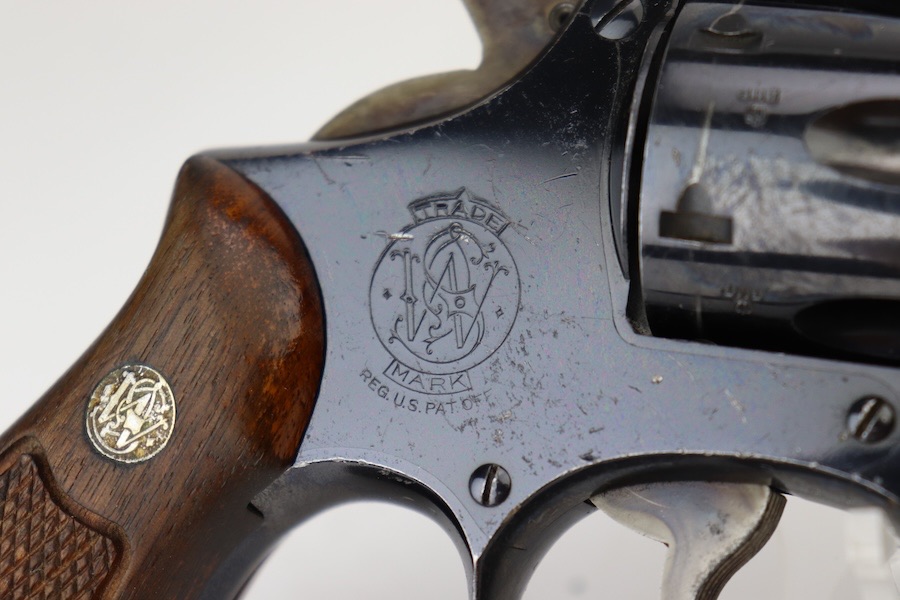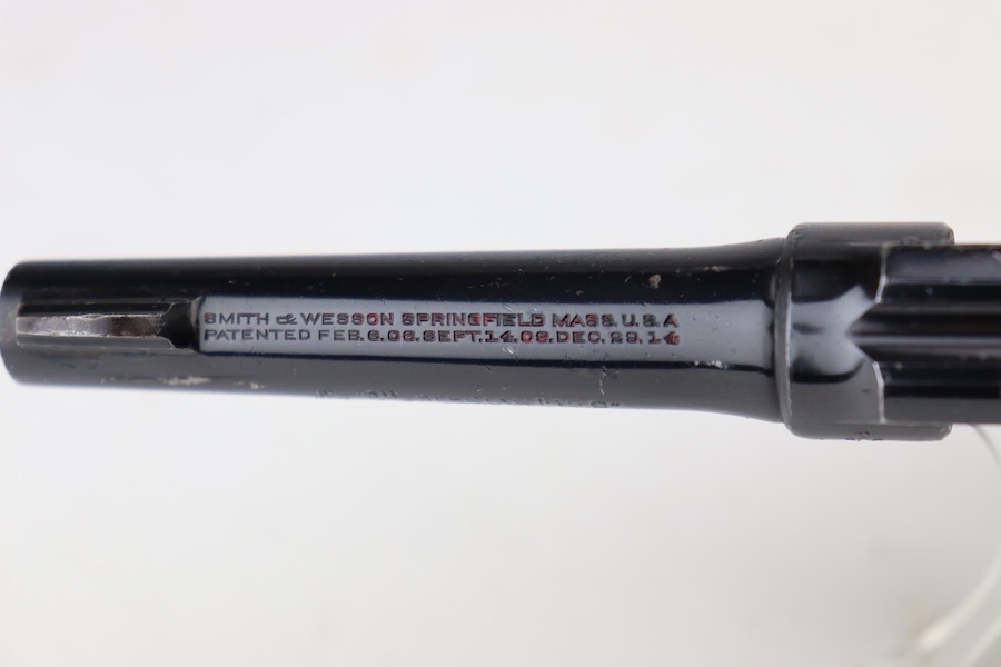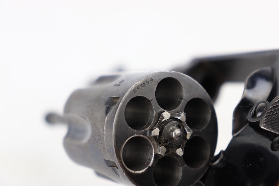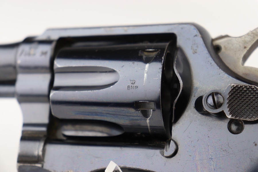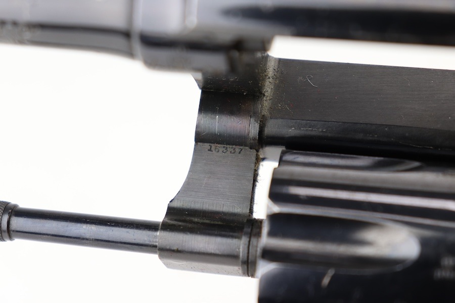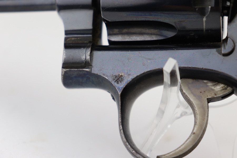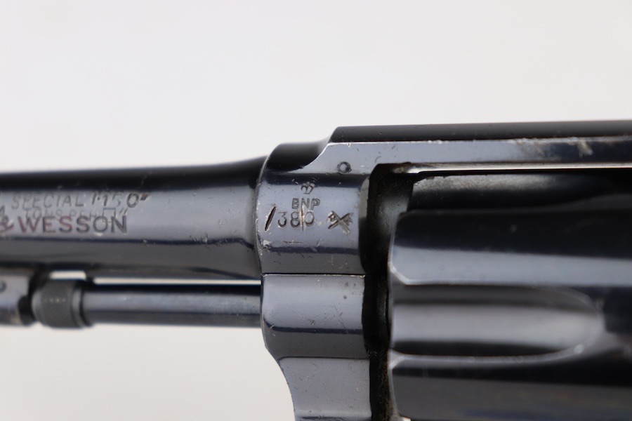 10/5/23 – This is an excellent example of a pre-WW2 S&W Model 10. There are minor scratches along both sides of the barrel and frame, with finish loss on the edges of the trigger guard—overall finish rates around 85-90%. British-proof marks are on the barrel, chamber, cylinder, and frame; they are likely added upon import or added after military use in the UK. Cylinder lock-up is tight and indexes correctly when the hammer is cocked. Cylinder and frame have matching serial numbers. The bore is very clean and rates a solid 9/10 with slight wear on the rifling. Fitted with nice brown checkered grips.