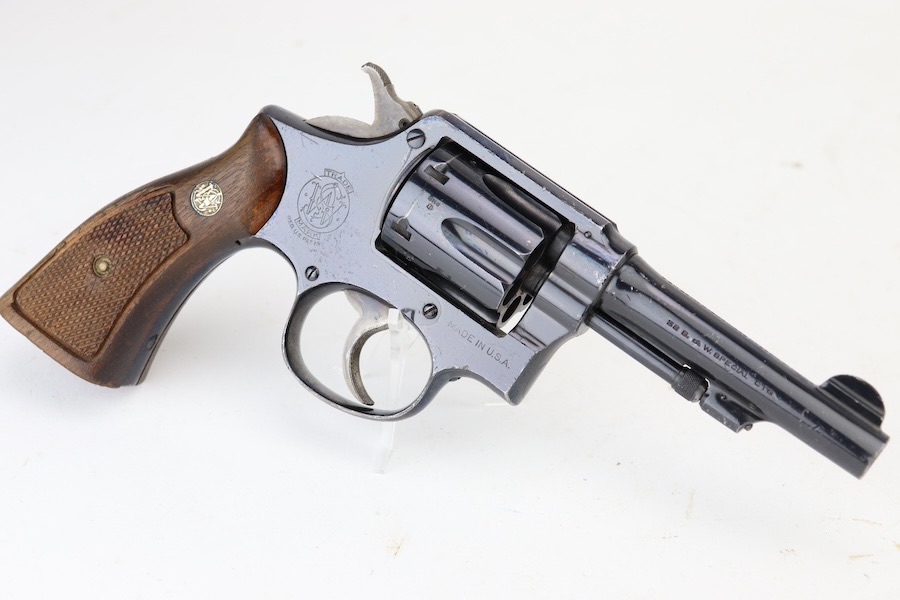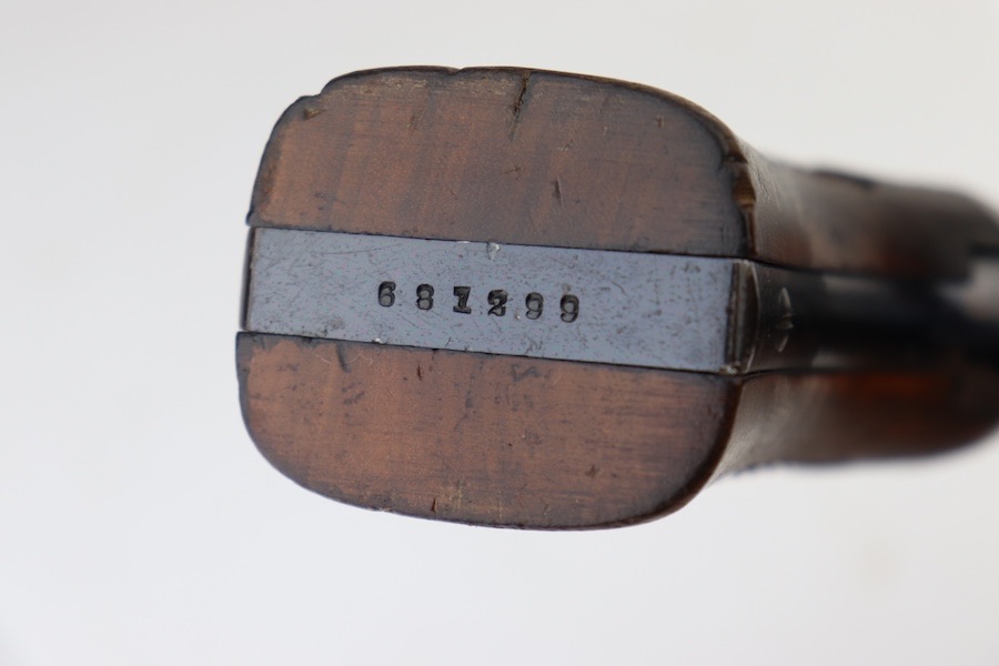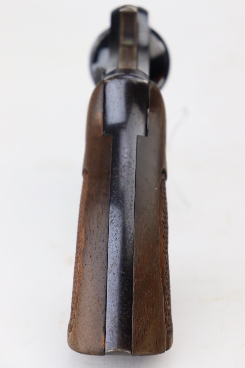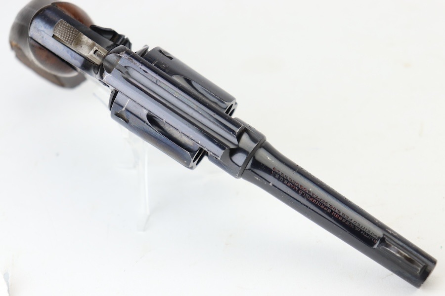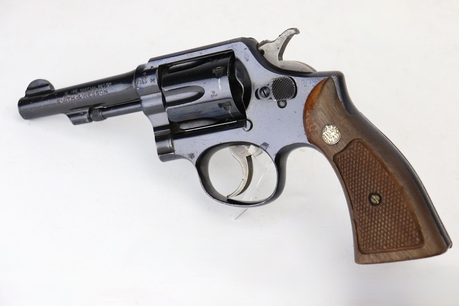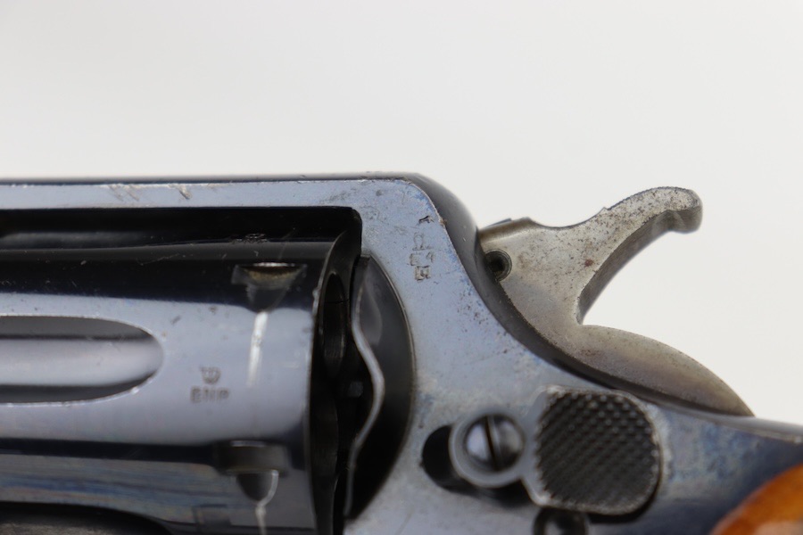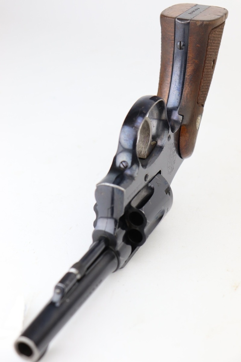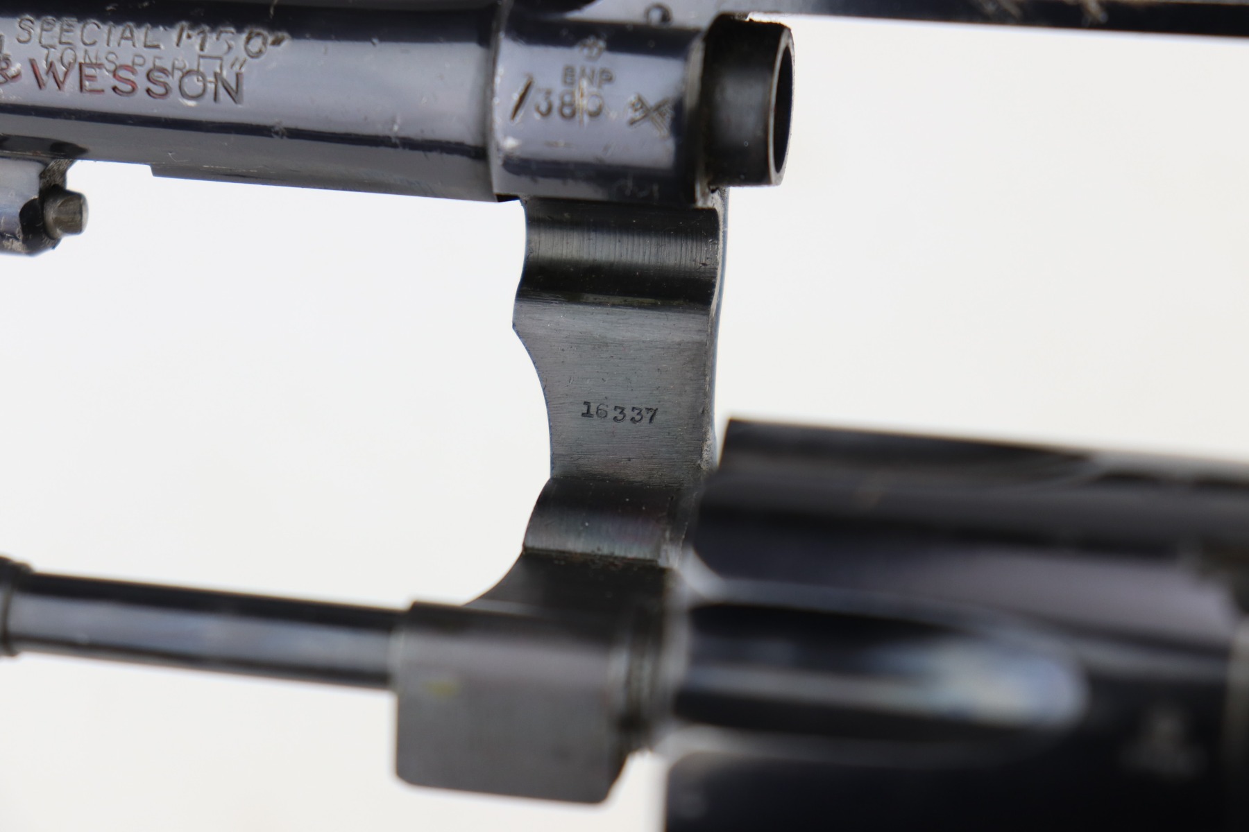 10/5/23 – This is an excellent example of a pre-WW2 S&W Model 10. There are minor scratches along both sides of the barrel and frame, with finish loss on the edges of the trigger guard—overall finish rates around 85-90%. British-proof marks are on the barrel, chamber, cylinder, and frame; they are likely added upon import or added after military use in the UK. Cylinder lock-up is tight and indexes correctly when the hammer is cocked. Cylinder and frame have matching serial numbers. The bore is very clean and rates a solid 9/10 with slight wear on the rifling. Fitted with nice brown checkered grips.