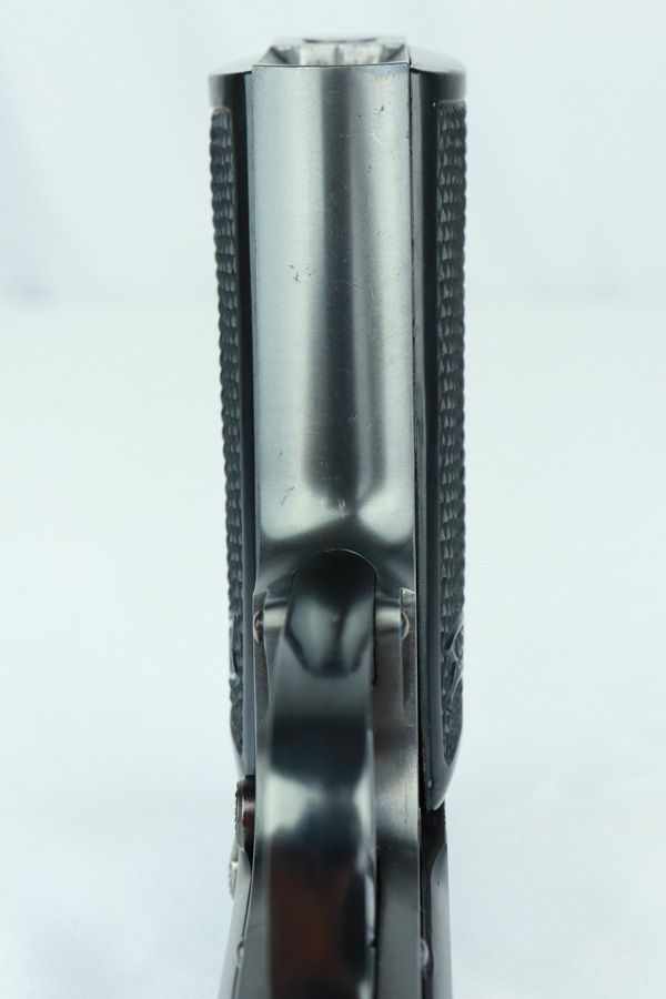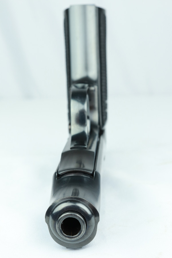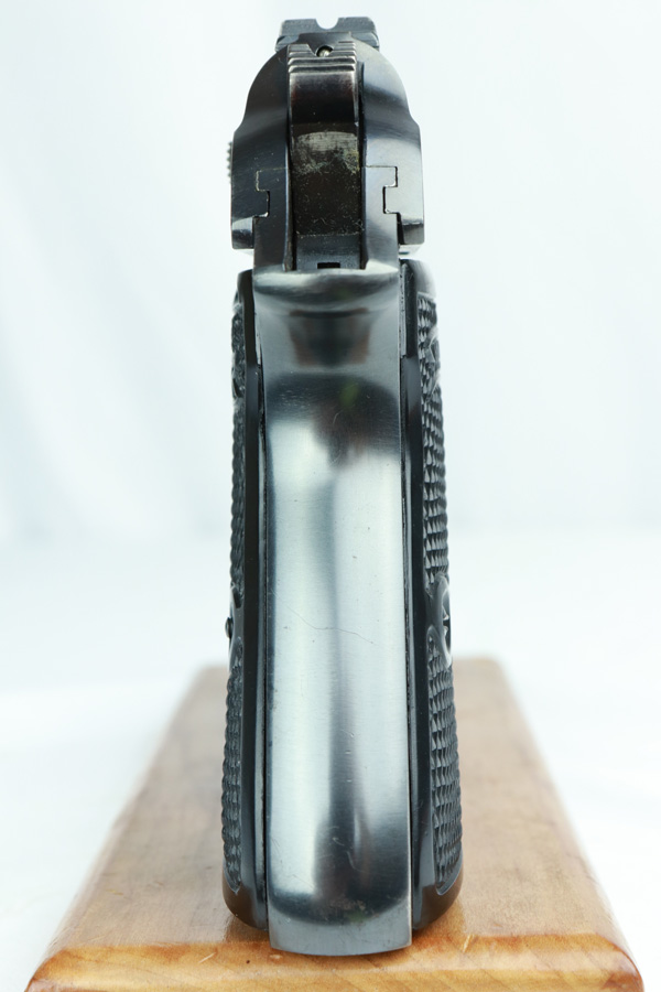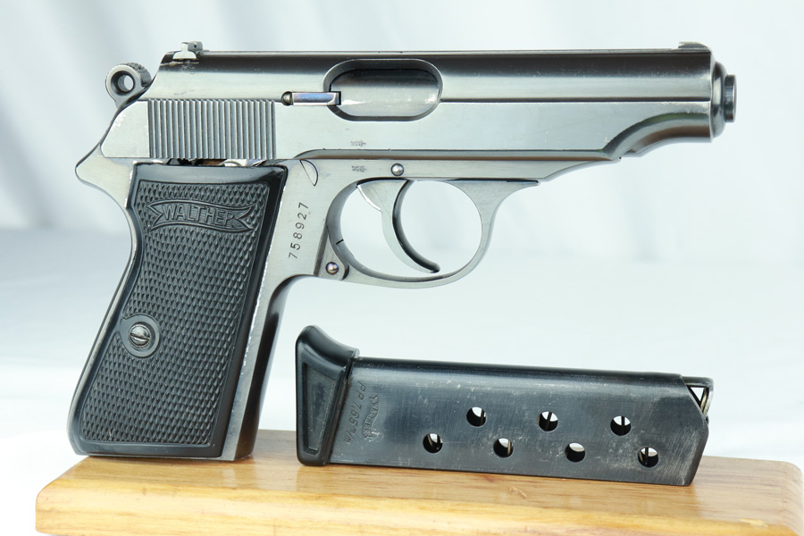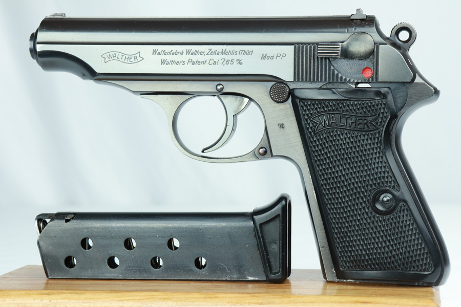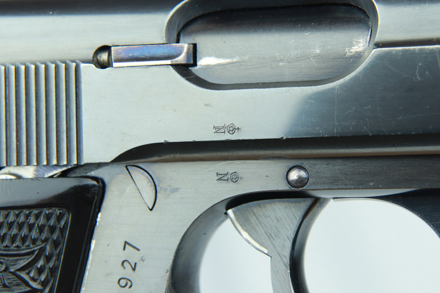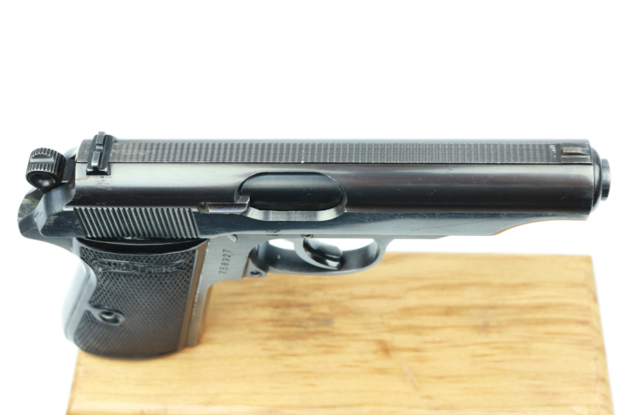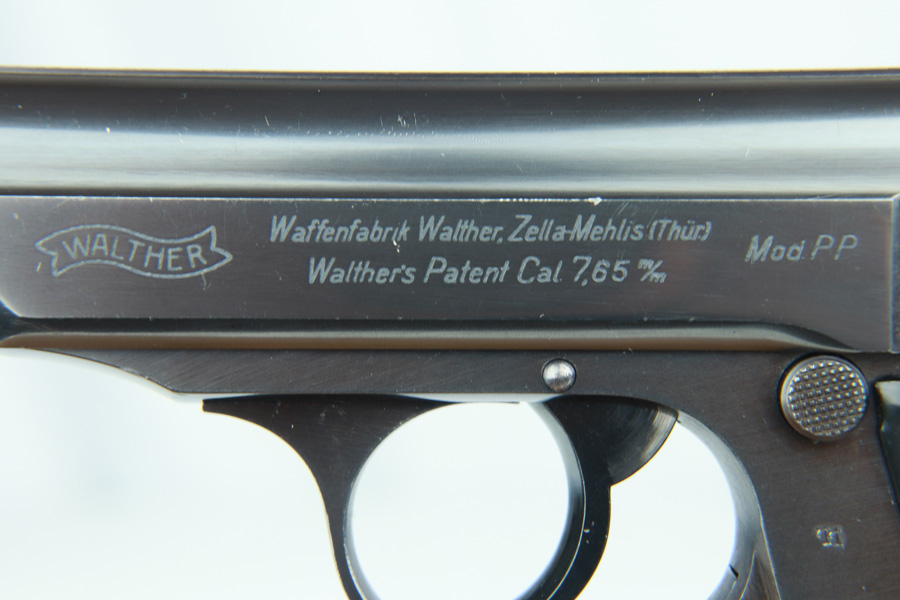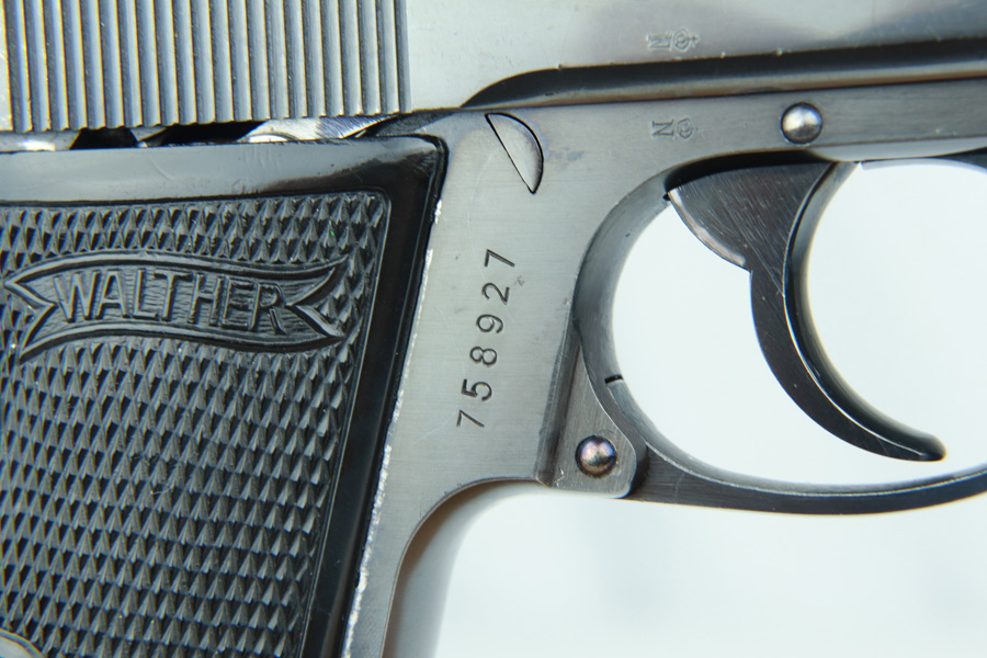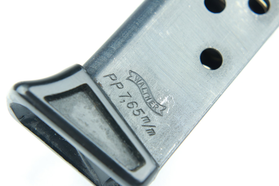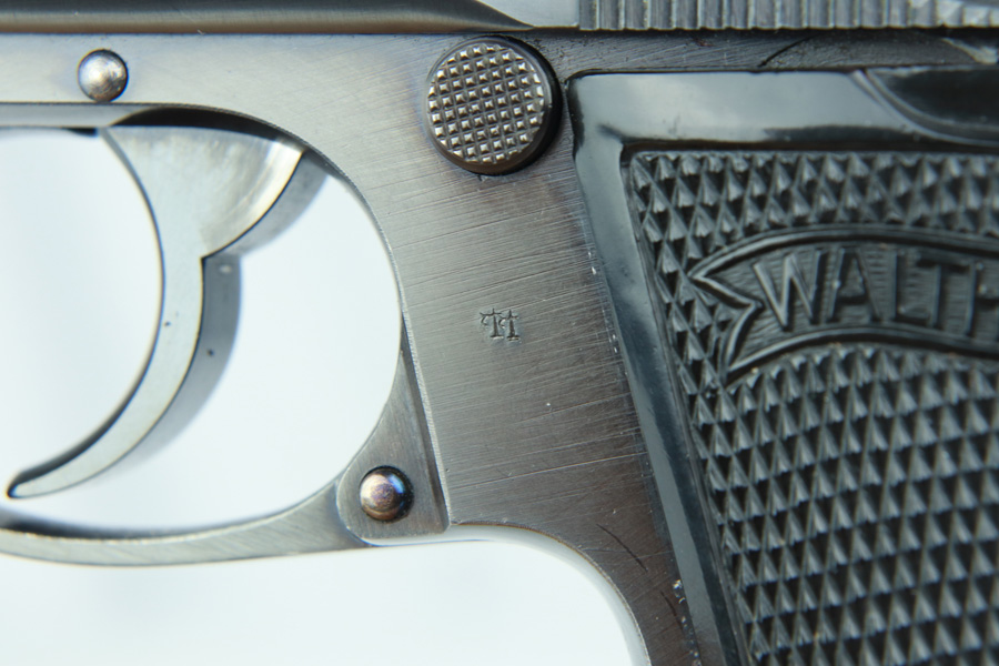 11/14/18 – This is an original, early production Walther PP in excellent condition. The pistol has very nice high polish bluing that’s in about 95-97% condition. There’s light muzzle wear and some wear near the rear of each side of the slide. Both sides of the slide have some “nicks” or light scratches near the rear sight. These are small but it appears maybe someone tried removing the rear sight. The straps are excellent with very minimal wear. Oddly, there’s an unknown stamp on the left side of the frame, just about where a police eagle/c stamp would be or waffen stamp. This looks like two backwards “r”s, or a “t” with a short right edge. Comes with an original wartime PP finger extension magazine. Guaranteed original and authentic.