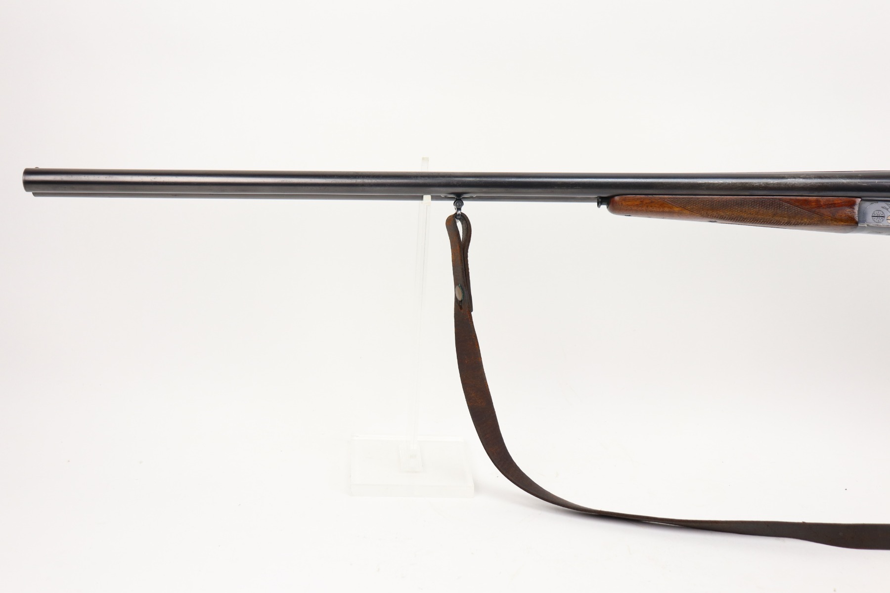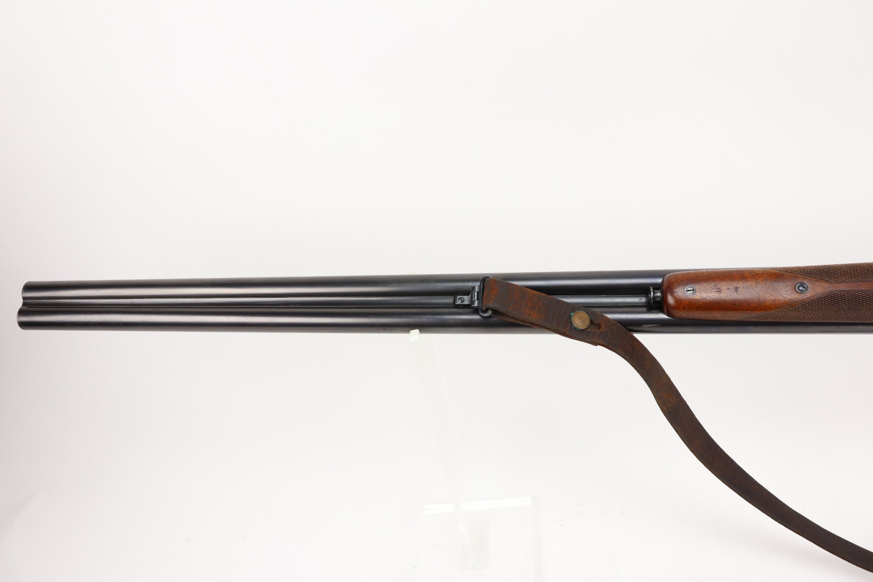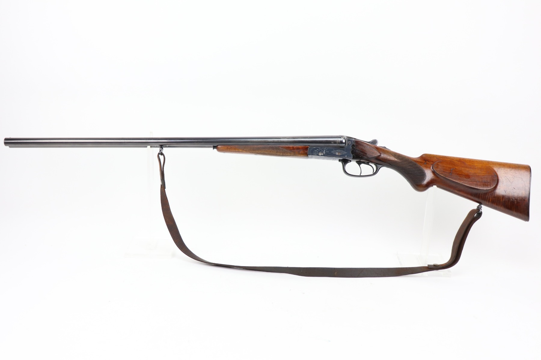 4/8/21 – This is a very nice example of a Walther Side by Side Shotgun, chambered in 16 GA. It was manufactured and sold in the commercial market in December of 1933. The gun is all matching and has the proper “Crown N” commercial proofs. The gun features a Walther banner and partial engraving on the sides of the receiver. It comes with a period-correct sling. The gun has retained most of its original finish. There is spotty wear here and there, especially on the high edges of the receiver and left side of the barrel. Spotty freckling along the barrel. The stock is excellent – just very minor dings and dents here and there. The bores are mint. 28.5 inch barrels. 14.5 inch LOP.
