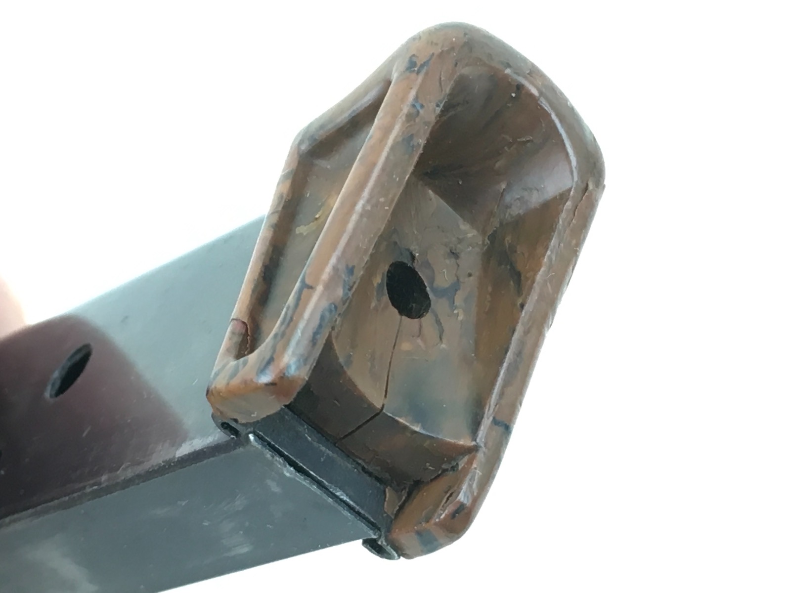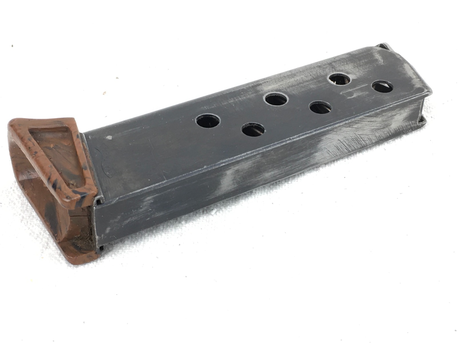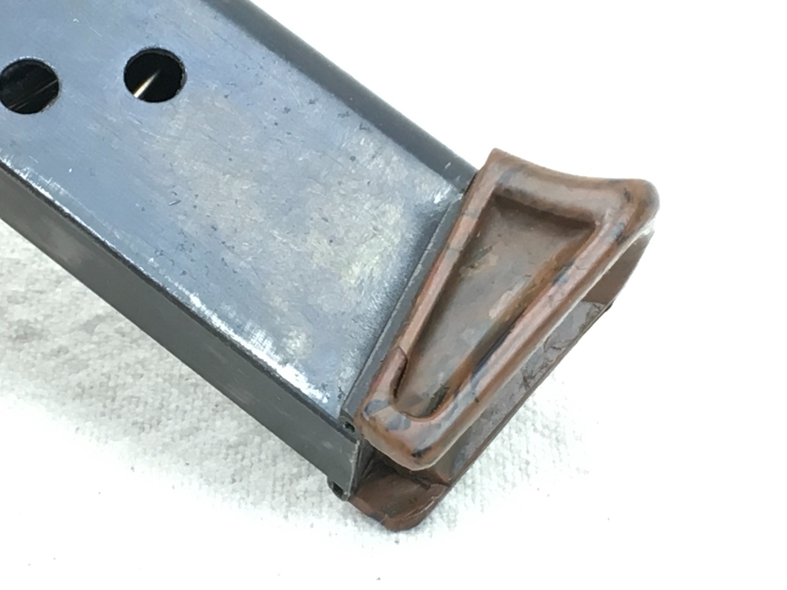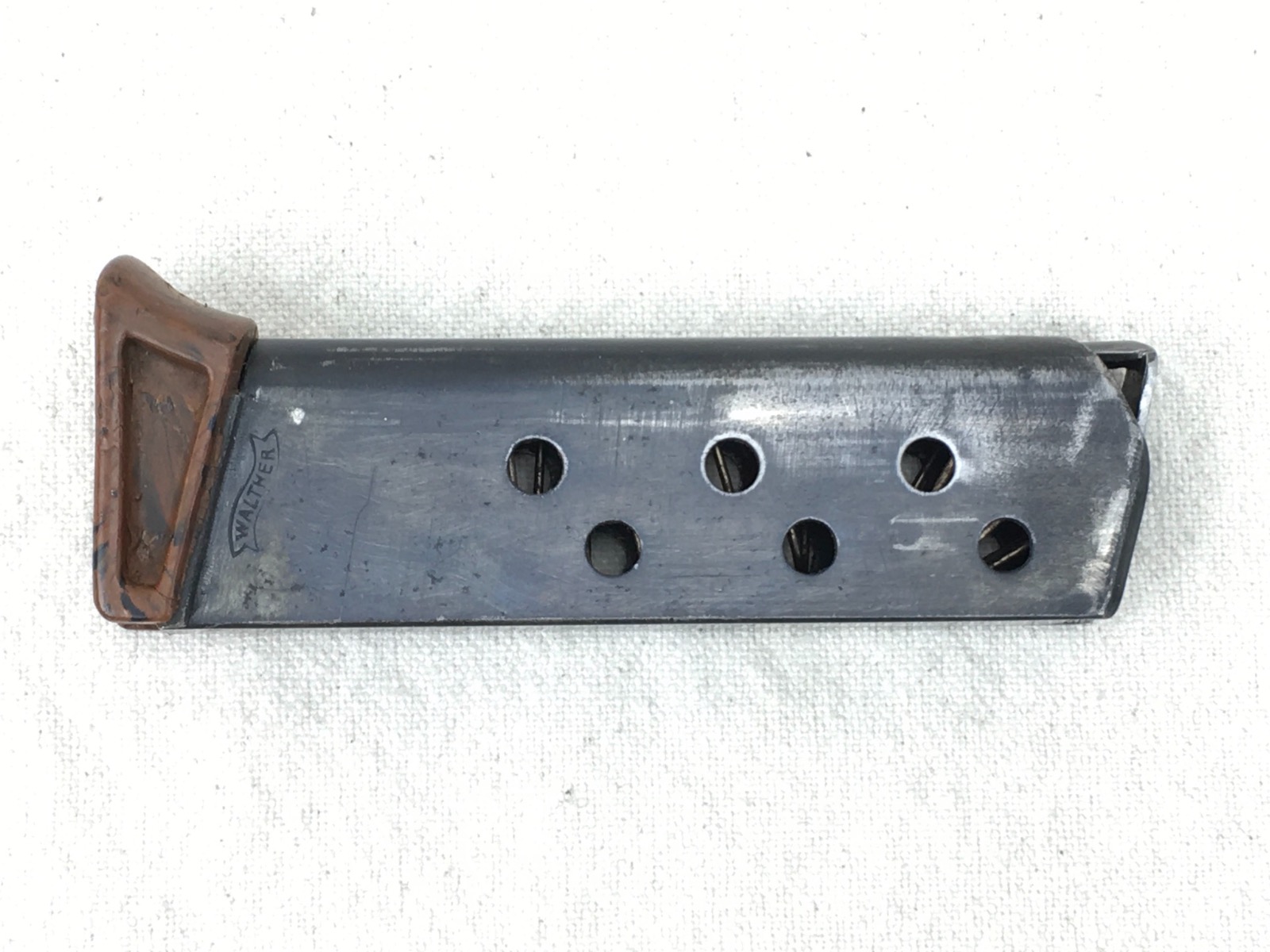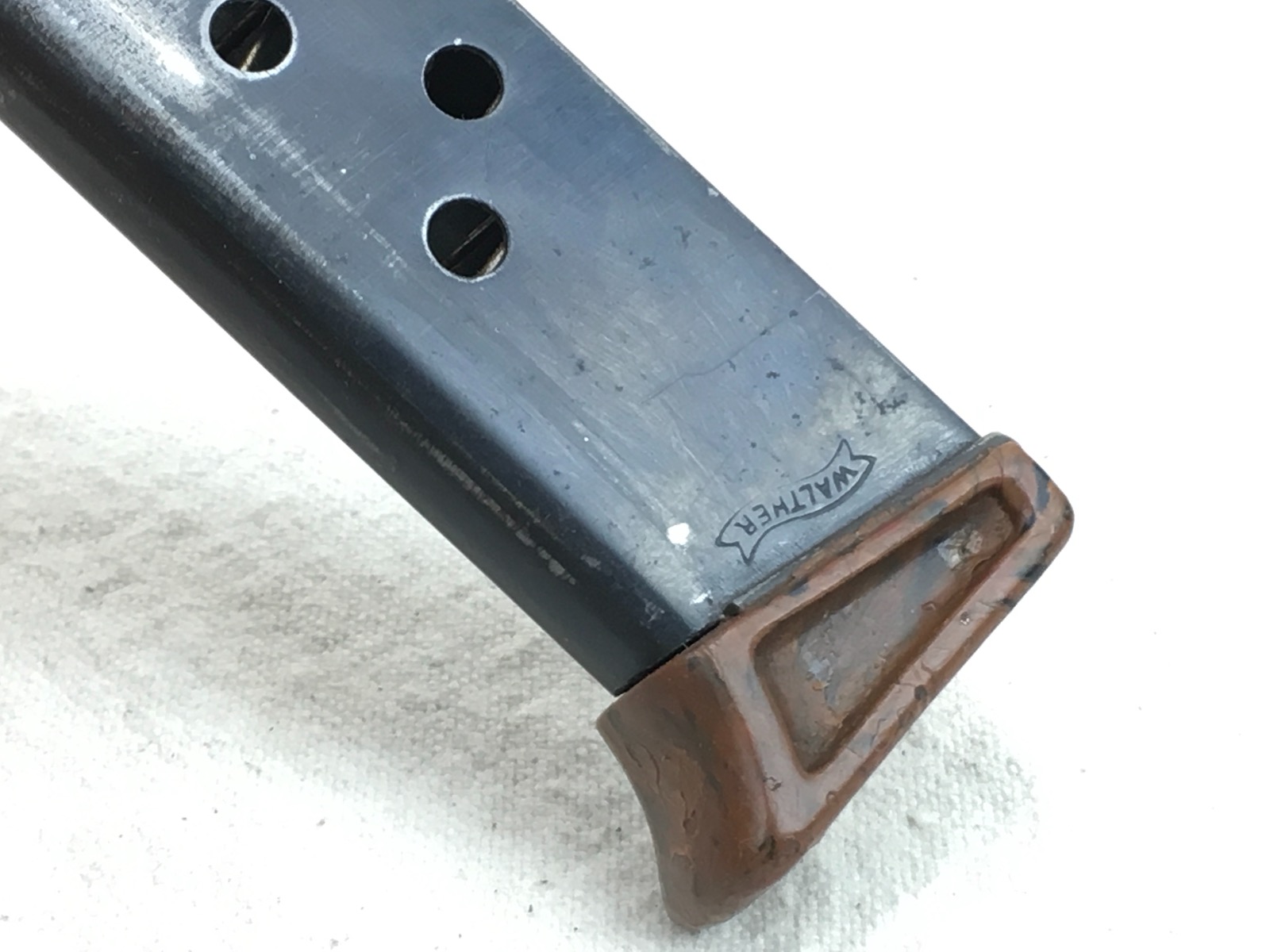 1/8/19 – This is a pre/early WW2 Walther PPK magazine with a mottled brown, thick lipped bakelite finger extension. The magazine is excellent except for a hairline crack in the brown bakelite base. Walther Banner only and high polish, which is early but the finger extension indicates late 1930s production. The banner stamp is upside down, which is unusual but we’ve seen this before. The spring is strong and fully functional. Guaranteed original and authentic.