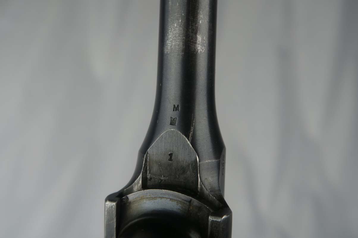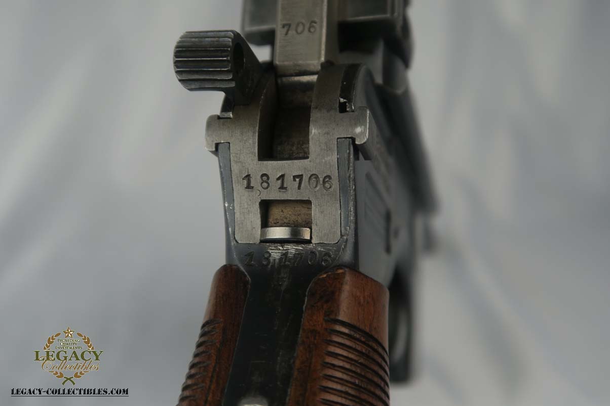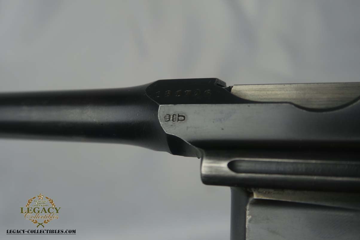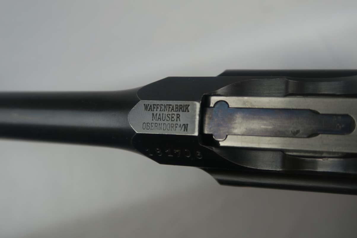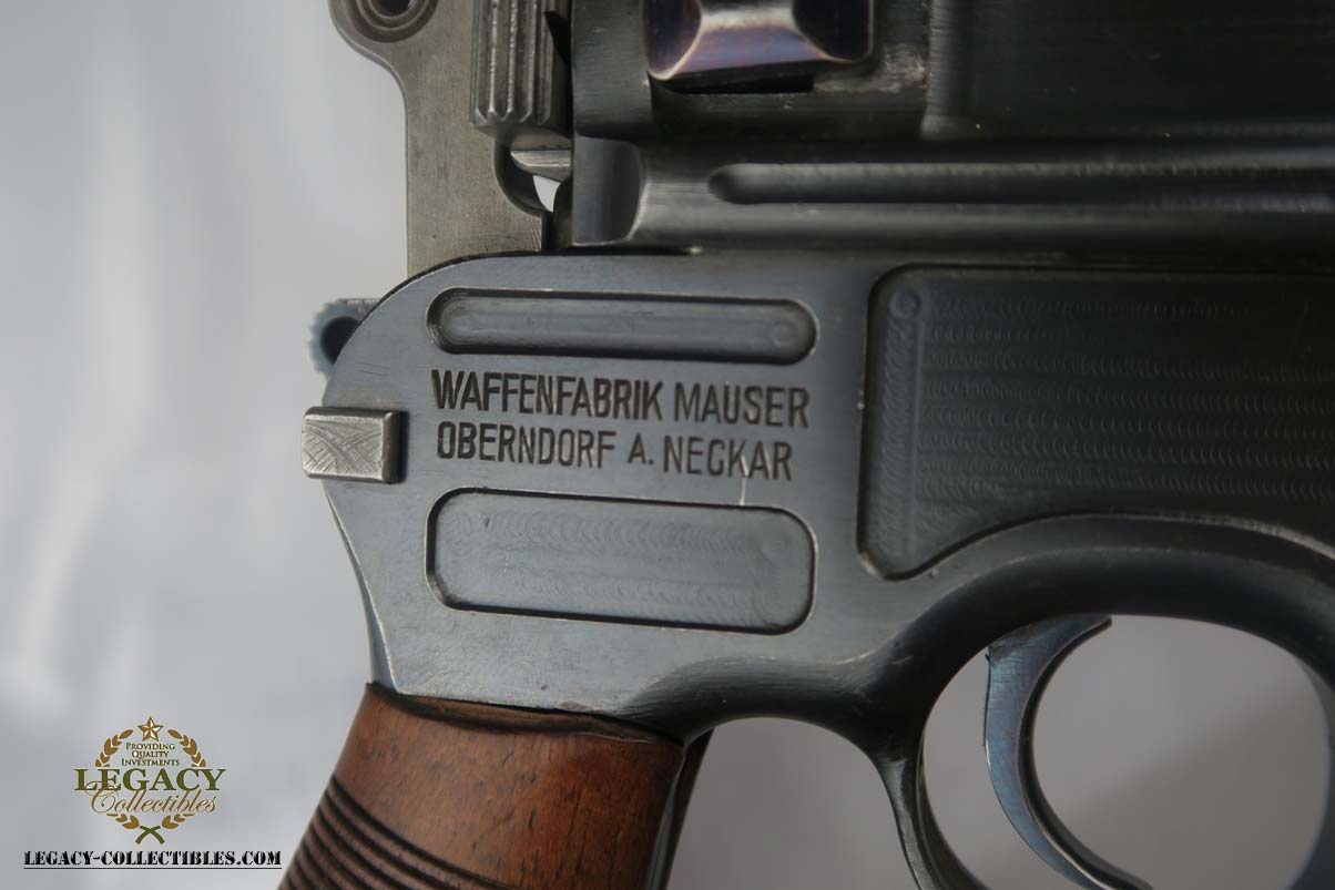 5/10/17 – This is a nice Prewar Commercial Mauser M1896, produced for the commercial market prior to WWI. It is all original and correct, with matching grips and about 93-94% blue remaining.  The wear is generally found on the high edges and barrel, likely from being in a stock.  The pistol shows proper features for a Prewar Commercial, such as 7.63mm, 50-1000 meter tangent sight, hole through safety knob, small ring hammer, 6 groove rifling in the bore, and serial in proper range.  Bore is excellent.  Just an honest, early example that doesn’t come around super often!