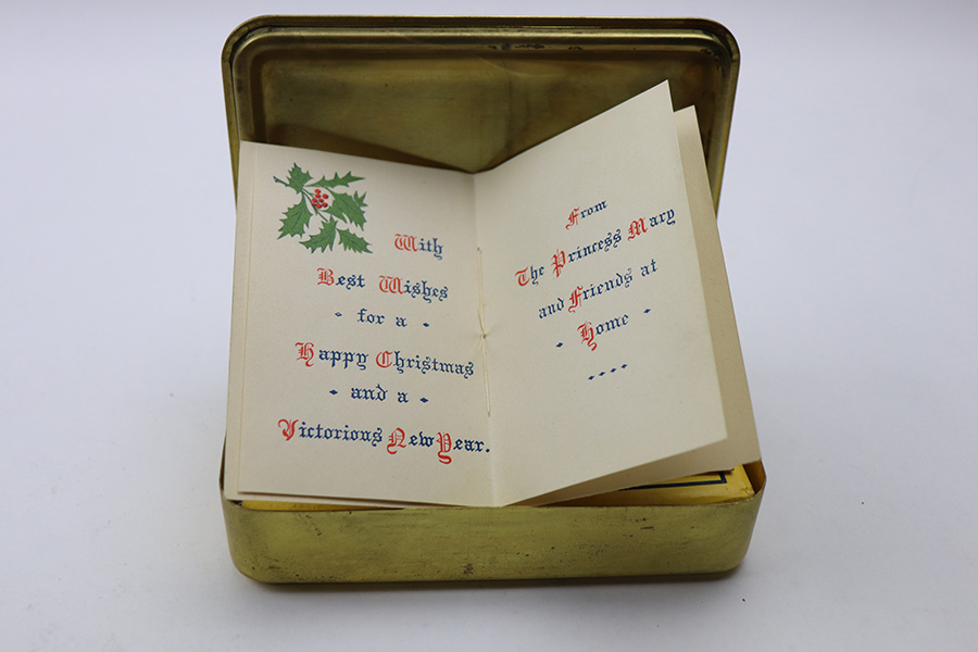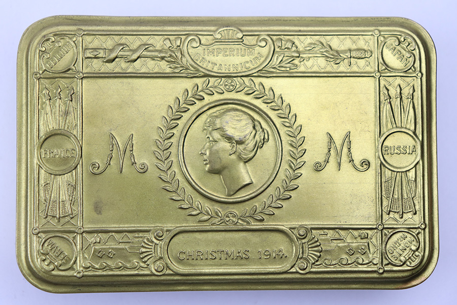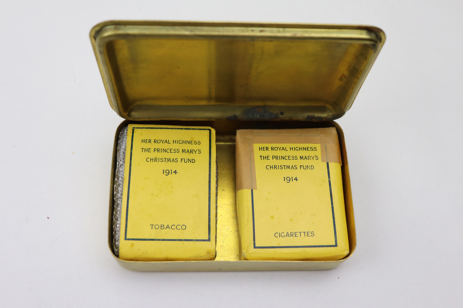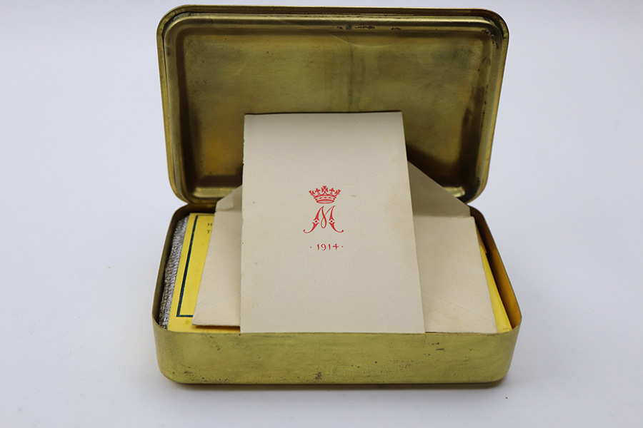 5/4/21 – This embossed brass box was intended as a Christmas present to English citizens serving at Christmas in 1914 and was paid for by a public fund backed by Princess Mary. Princess Mary’s original vision was to pay, out of her private allowance, for a personal gift to each soldier and sailor. It was later deemed impractical for her to do so, instead Princess Mary would lend her name to a public fund to raise the necessary support. Princess Mary addressed the nation in a letter from Buckingham Palace reading, “I want you now to help me to send a Christmas present from the whole of the nation to every sailor afloat and every soldier at the front. I am sure that we should all be happier to feel that we had helped to send our little token of love and sympathy on Christmas morning, something that would be useful and of permanent value, and the making of which may be the means of providing employment in trades adversely affected by the war. Could there be anything more likely to hearten them in their struggle than a present received straight from home on Christmas Day? Please will you help me?”. Due to surplus funds, distribution was extended and everyone that was serving, whether at home or abroad, prisoners of war, and the next of kin of 1914 casualties received a box. The boxes contained a variety of items like chocolate and tobacco. This example is in extremely good condition with both the tobacco and cigarettes within in sealed condition. The included envelope and note are both intact and in pristine condition. Certainly an interesting item to add to any collection of WW1 artifacts.