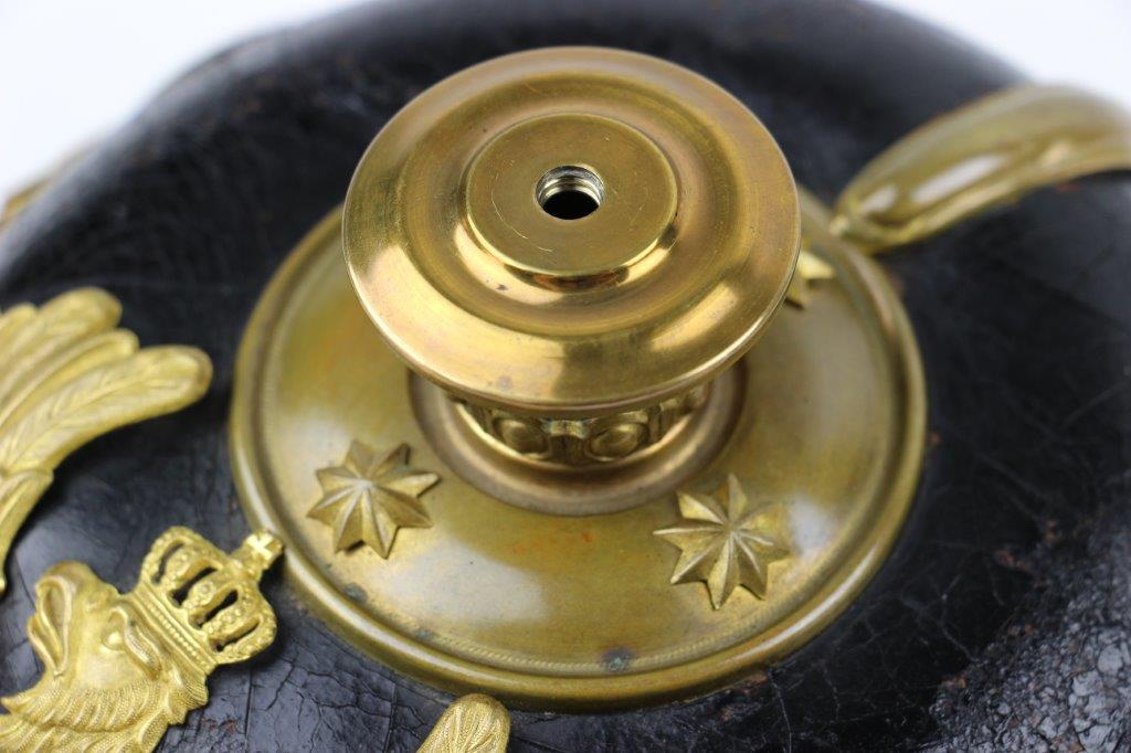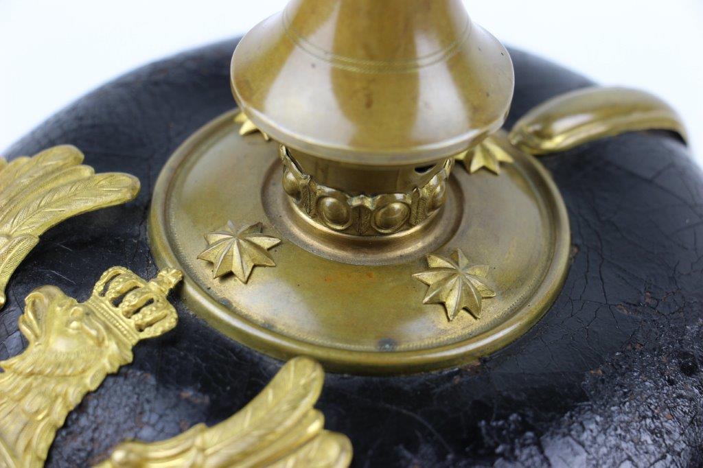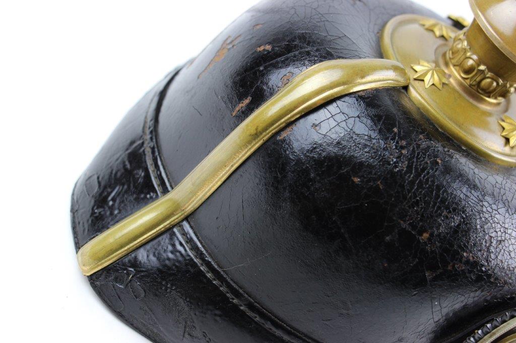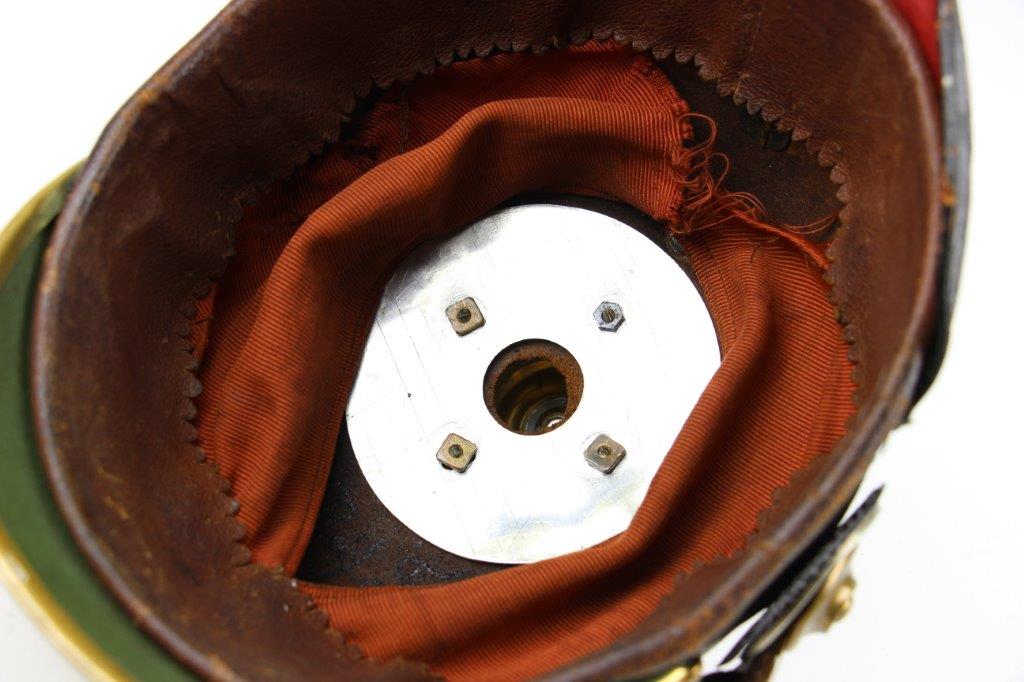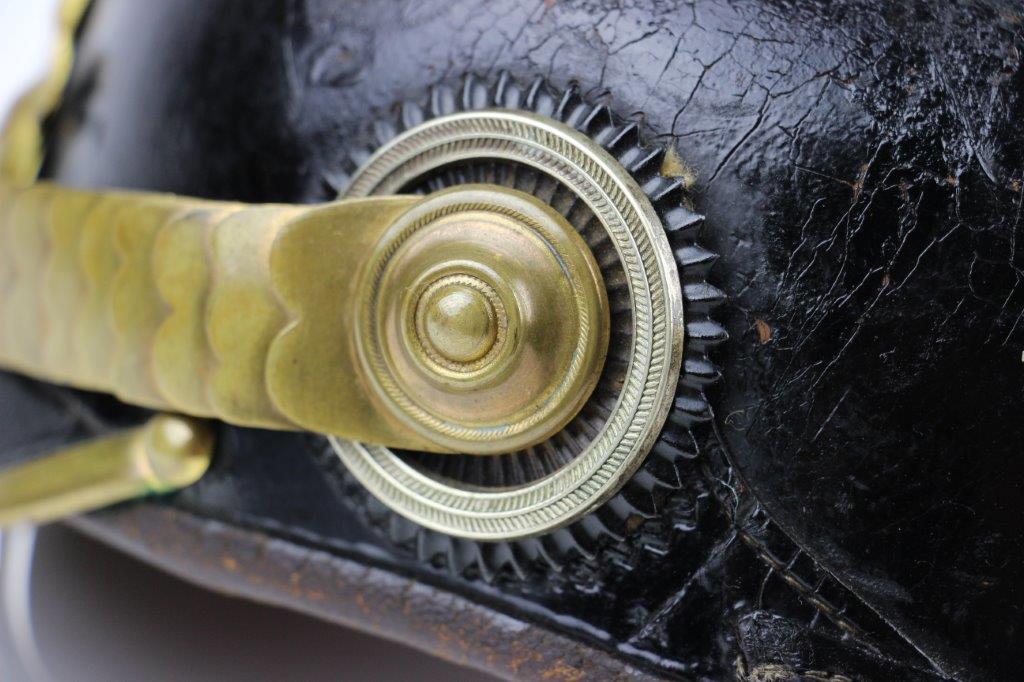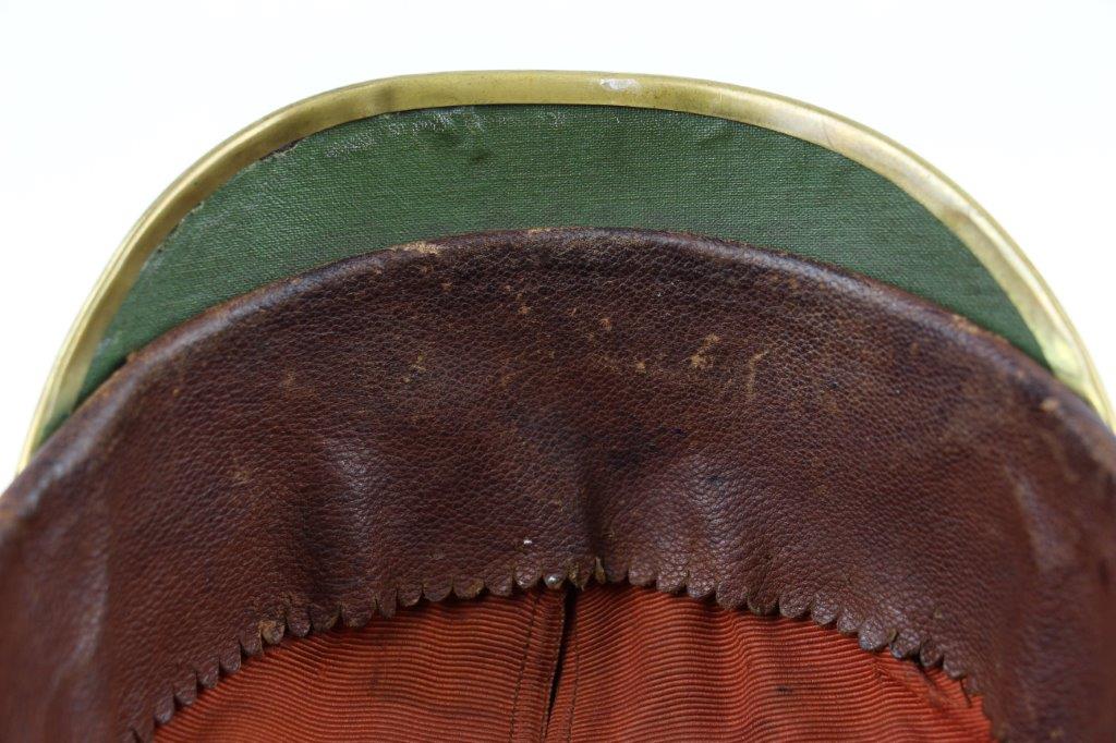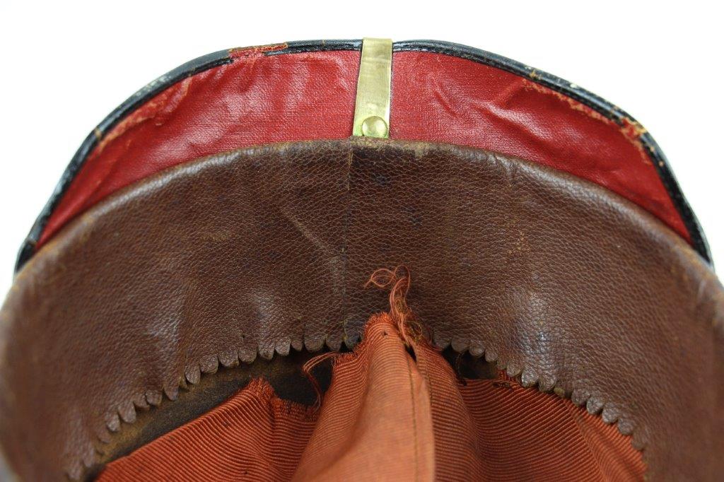 5/15/24 – This is a textbook example of a private purchase WW1 Prussian Infantry Officer’s Pickelhaube. The helmet shell is pressed blackened leather with some typical exterior cracking and wrinkling throughout. The backside shows a few scuffs and areas of discoloration and texture. This is generally mild however, and the shell is in great overall condition with mild pliability. The crown features 4 star-shaped rivets (each star with 8 points) and a removeable top spike. The back spine of the shell is unvented and has a small dent but is in great overall condition. All of the metal fixtures are bronze and have a natural aged look. The front Prussian imperial eagle is in great condition and secure. The (correctly) magnetic cockades are original and have excellent color. The chinstrap has black and brown leather base which is topped by bronze scales. The front visor is lined with bronze as well. The interior is all original and in great shape. The back visor has some mild deformity, but the rest of the helmet shape is nice. The stitching of the interior two-piece retractable liner is missing around the backside, leaving the cloth somewhat loose inside, but about half of the stitching is still intact so the liner is secure. Overall a great condition example of a Prussian Officer Pickelhaube.