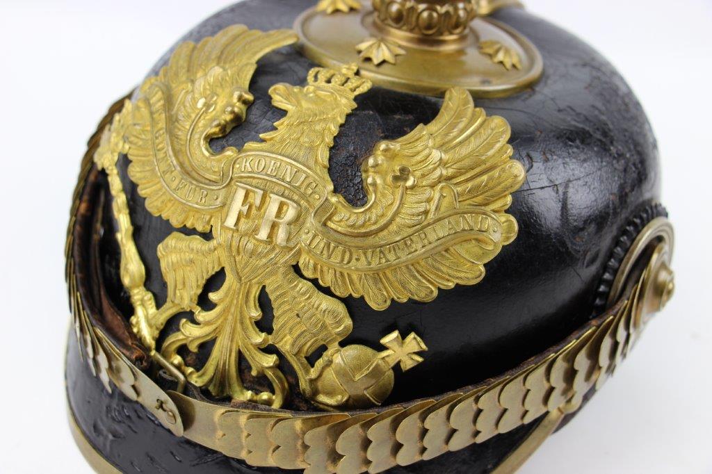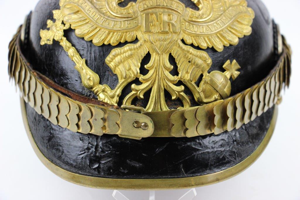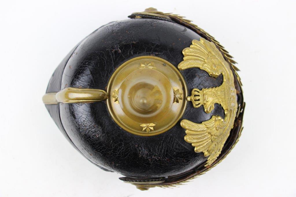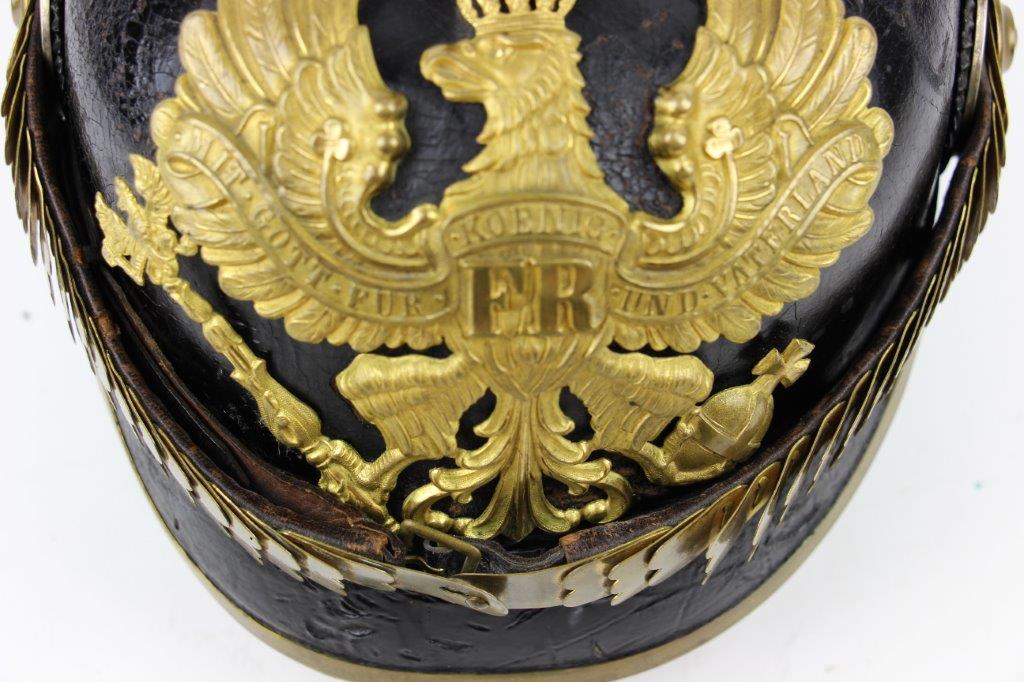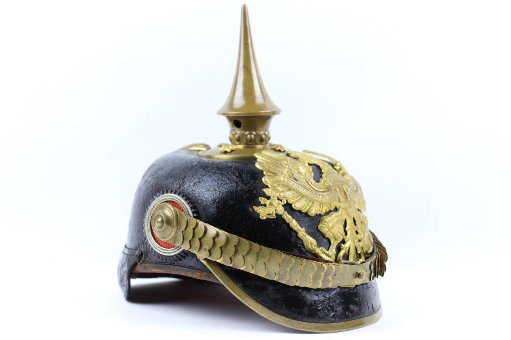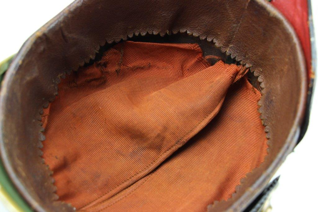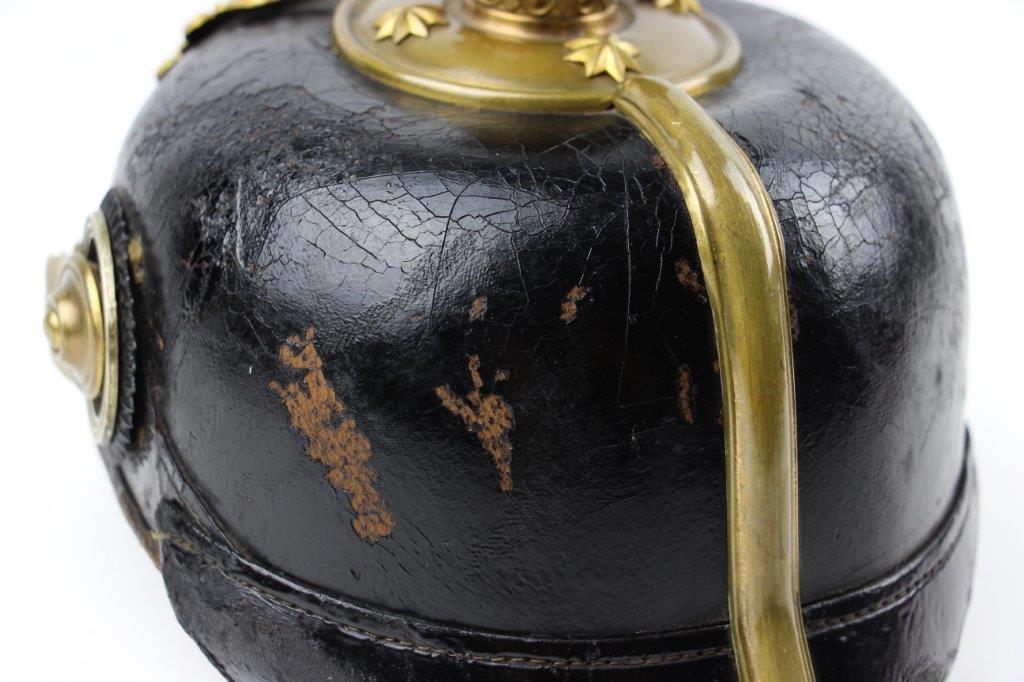 5/15/24 – This is a textbook example of a private purchase WW1 Prussian Infantry Officer’s Pickelhaube. The helmet shell is pressed blackened leather with some typical exterior cracking and wrinkling throughout. The backside shows a few scuffs and areas of discoloration and texture. This is generally mild however, and the shell is in great overall condition with mild pliability. The crown features 4 star-shaped rivets (each star with 8 points) and a removeable top spike. The back spine of the shell is unvented and has a small dent but is in great overall condition. All of the metal fixtures are bronze and have a natural aged look. The front Prussian imperial eagle is in great condition and secure. The (correctly) magnetic cockades are original and have excellent color. The chinstrap has black and brown leather base which is topped by bronze scales. The front visor is lined with bronze as well. The interior is all original and in great shape. The back visor has some mild deformity, but the rest of the helmet shape is nice. The stitching of the interior two-piece retractable liner is missing around the backside, leaving the cloth somewhat loose inside, but about half of the stitching is still intact so the liner is secure. Overall a great condition example of a Prussian Officer Pickelhaube.