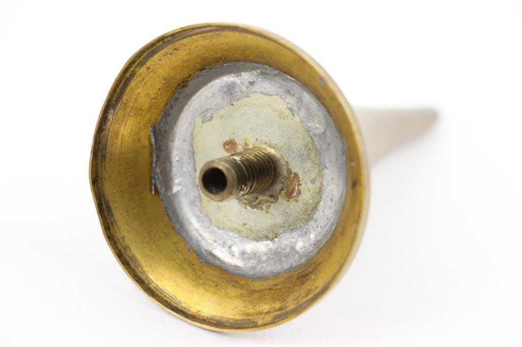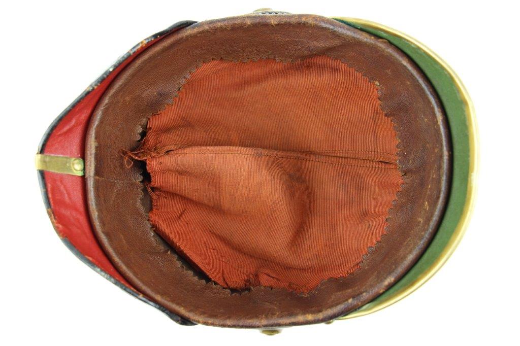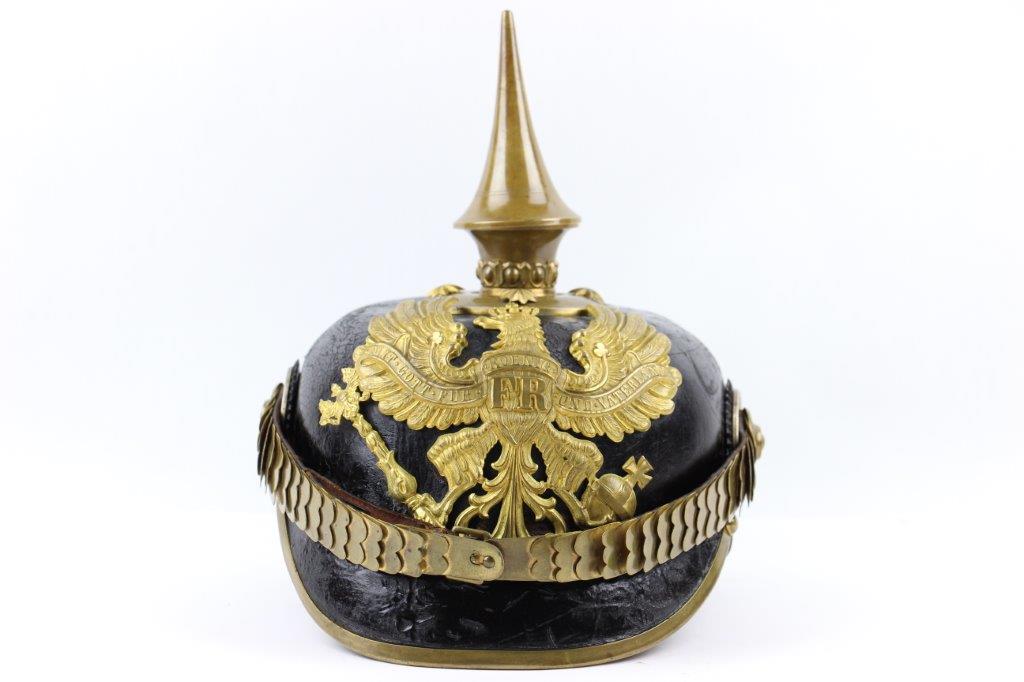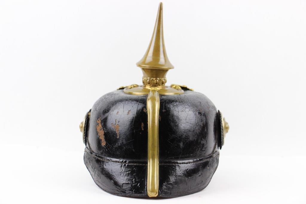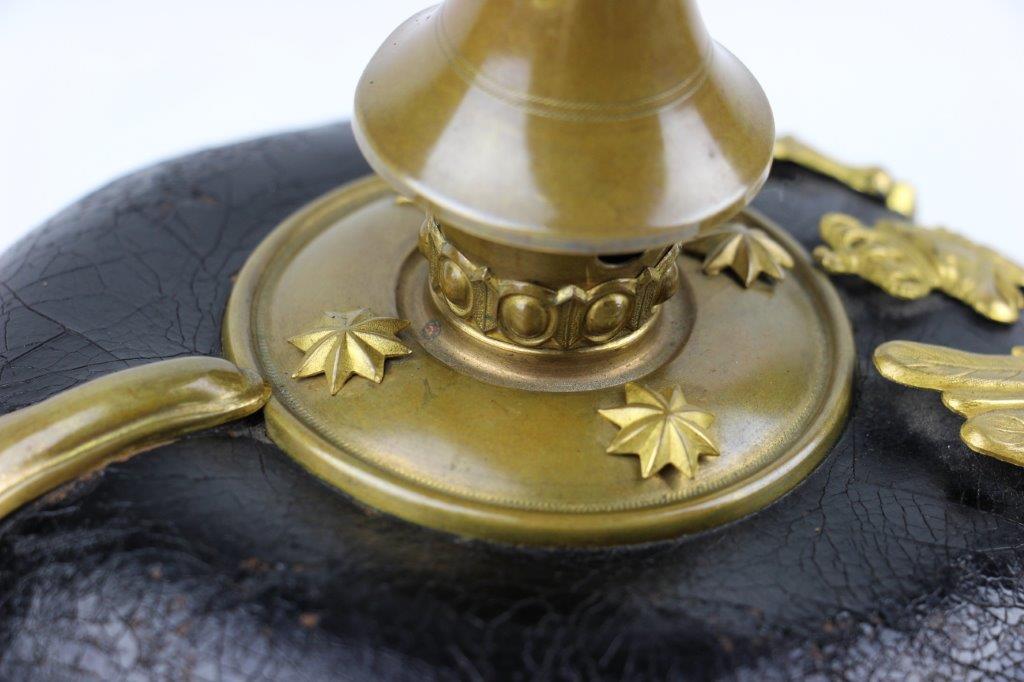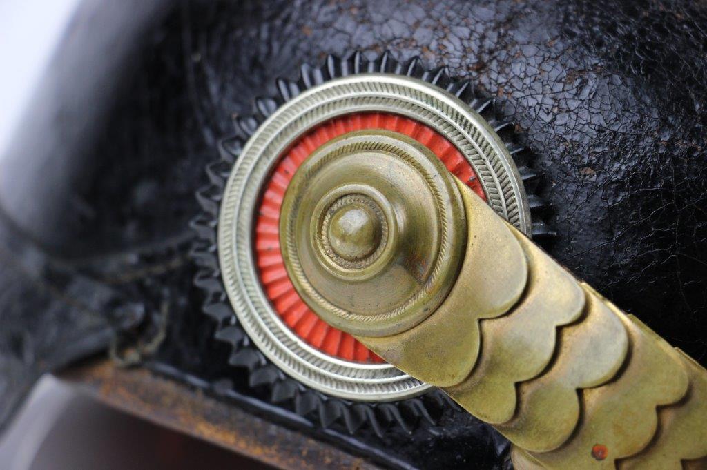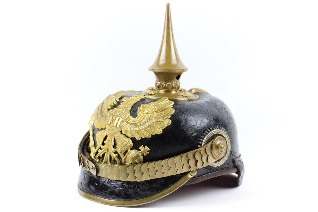 5/15/24 – This is a textbook example of a private purchase WW1 Prussian Infantry Officer’s Pickelhaube. The helmet shell is pressed blackened leather with some typical exterior cracking and wrinkling throughout. The backside shows a few scuffs and areas of discoloration and texture. This is generally mild however, and the shell is in great overall condition with mild pliability. The crown features 4 star-shaped rivets (each star with 8 points) and a removeable top spike. The back spine of the shell is unvented and has a small dent but is in great overall condition. All of the metal fixtures are bronze and have a natural aged look. The front Prussian imperial eagle is in great condition and secure. The (correctly) magnetic cockades are original and have excellent color. The chinstrap has black and brown leather base which is topped by bronze scales. The front visor is lined with bronze as well. The interior is all original and in great shape. The back visor has some mild deformity, but the rest of the helmet shape is nice. The stitching of the interior two-piece retractable liner is missing around the backside, leaving the cloth somewhat loose inside, but about half of the stitching is still intact so the liner is secure. Overall a great condition example of a Prussian Officer Pickelhaube.