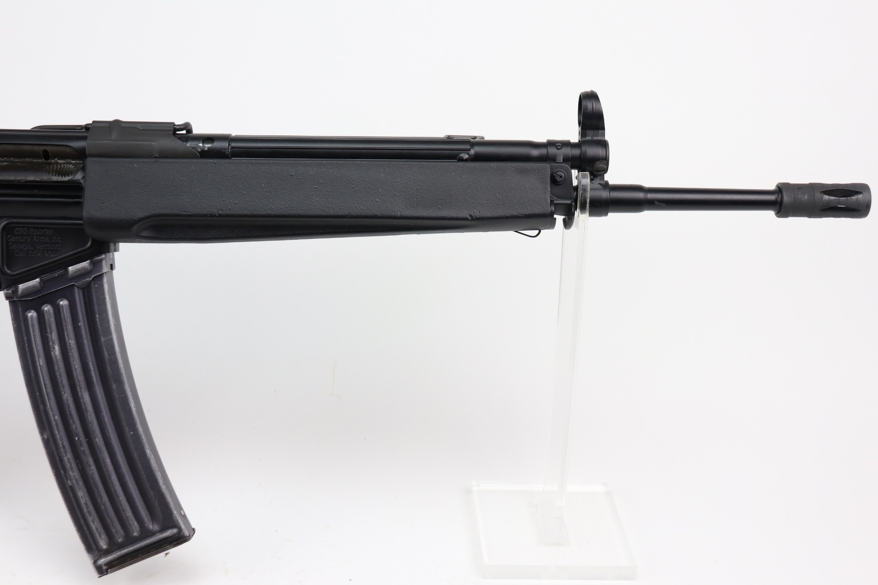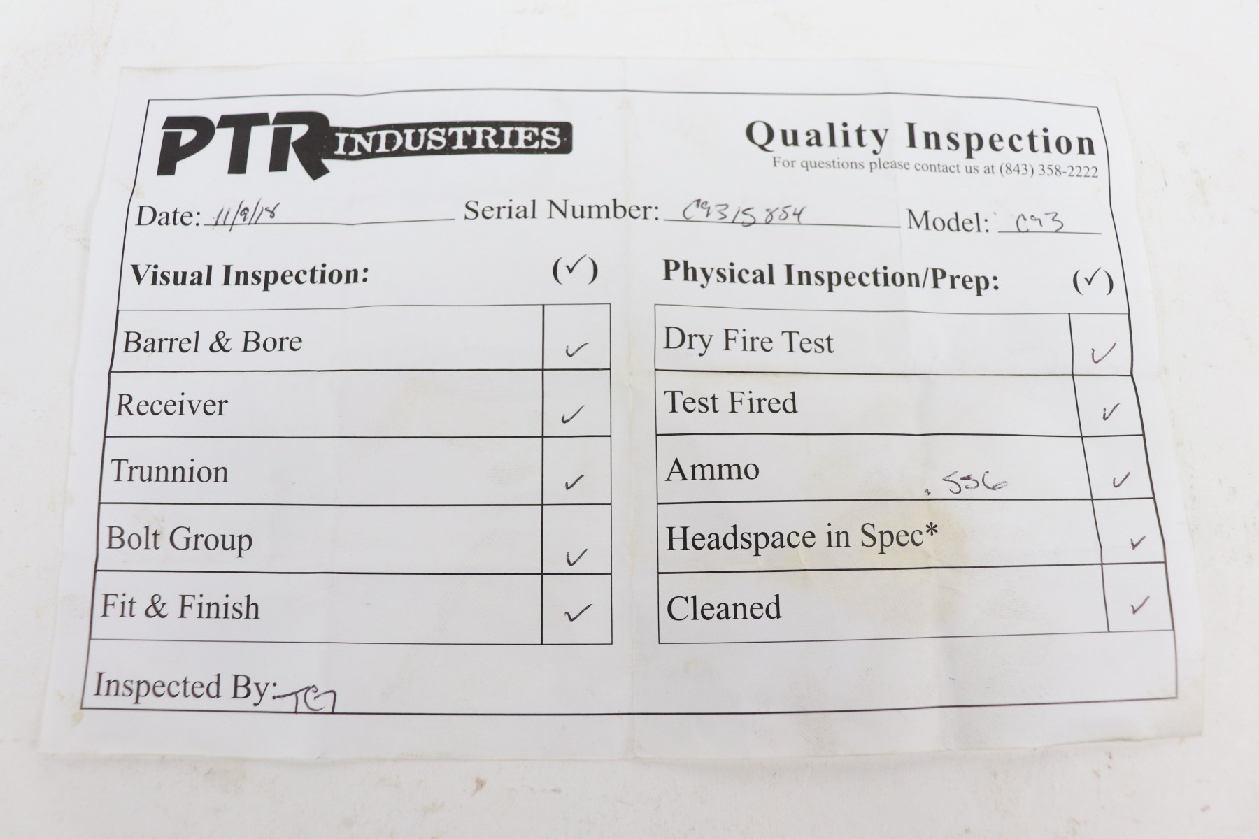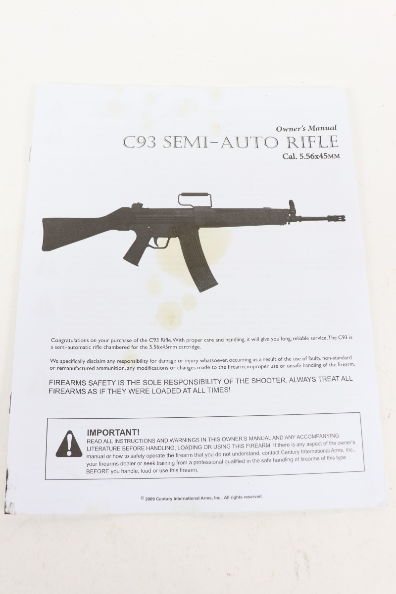 3/8/21 – This is a mint example of a C93 semi auto rifle. The parts were made by Century Arms, but the gun was assembled by PTR. It has a desirable scalloped or serrated bolt assembly. The gun comes with a serialized PTR quality inspection certificate, owners manual, three 45-rd magazines, and a gun lock. The gun is fully functional and in mint, like-new condition. No apparent signs of wear. The bore is stone-mint.